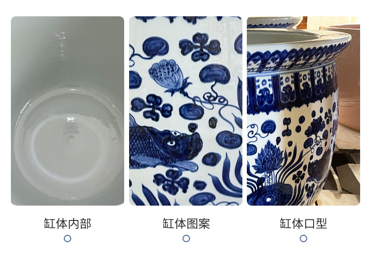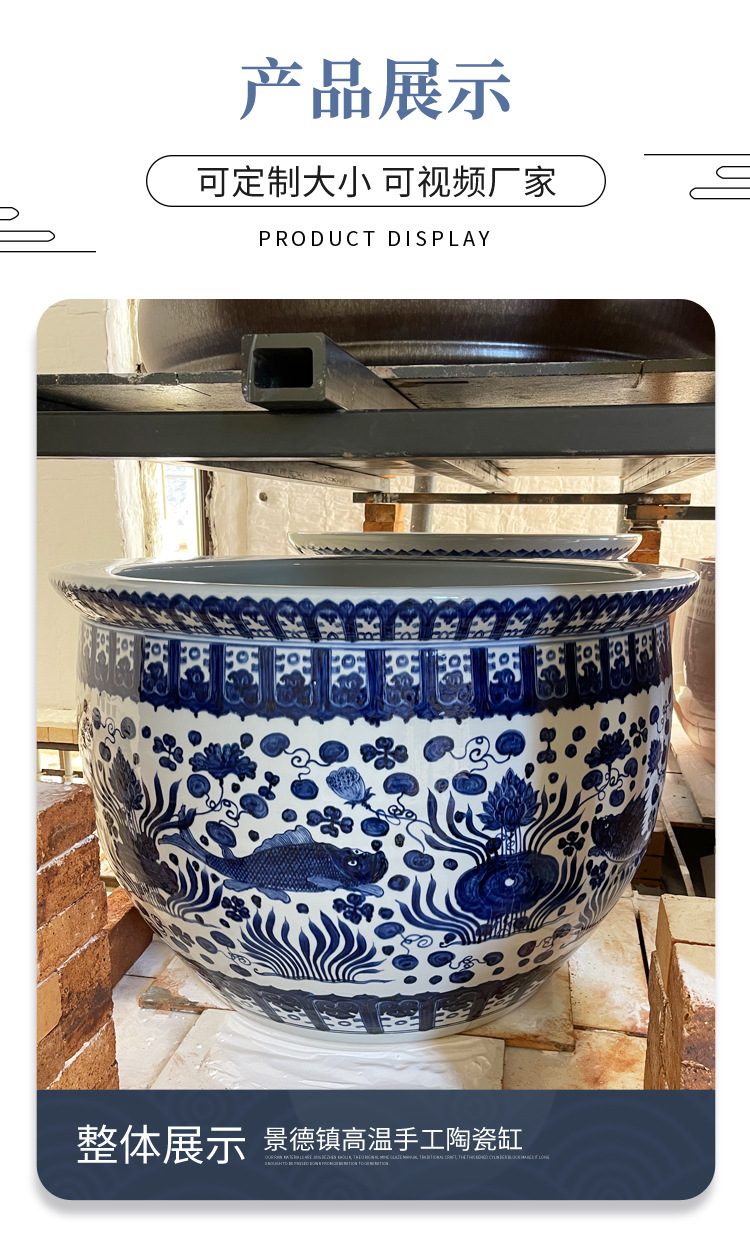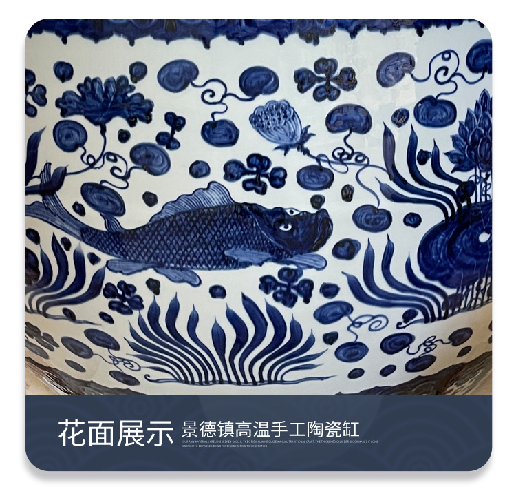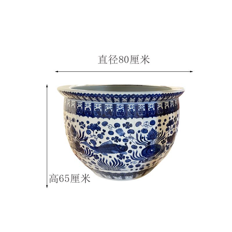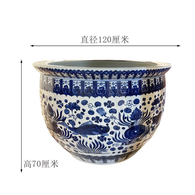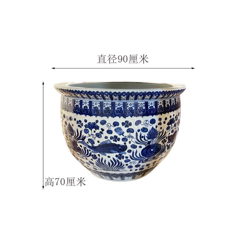 Jingdezhen 세라믹 파란색과 흰색 물고기 조류 패턴 대형 탱크 잉어 연꽃 수련 탱크 안뜰 거실 대형 탱크 나무 탱크스토어 가기