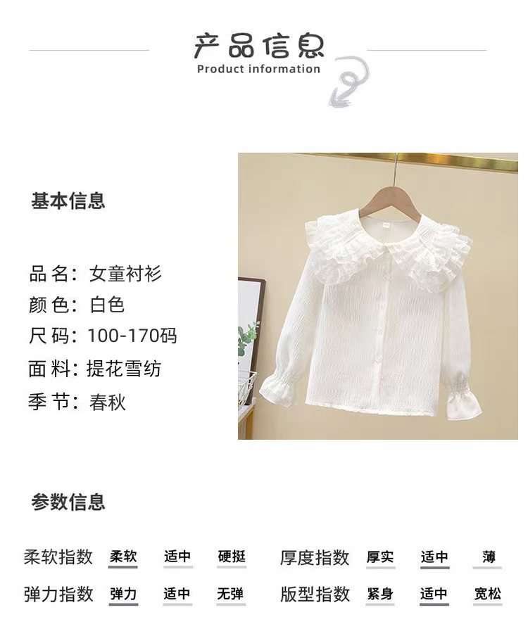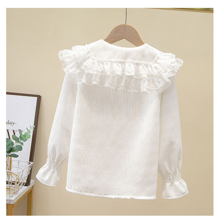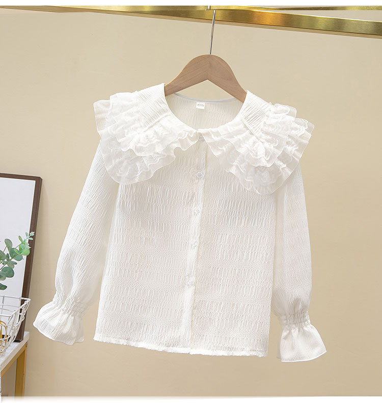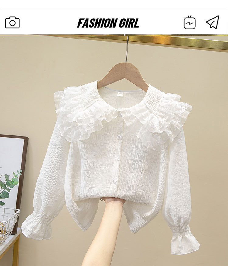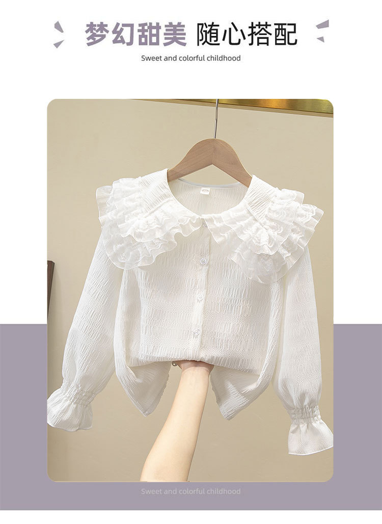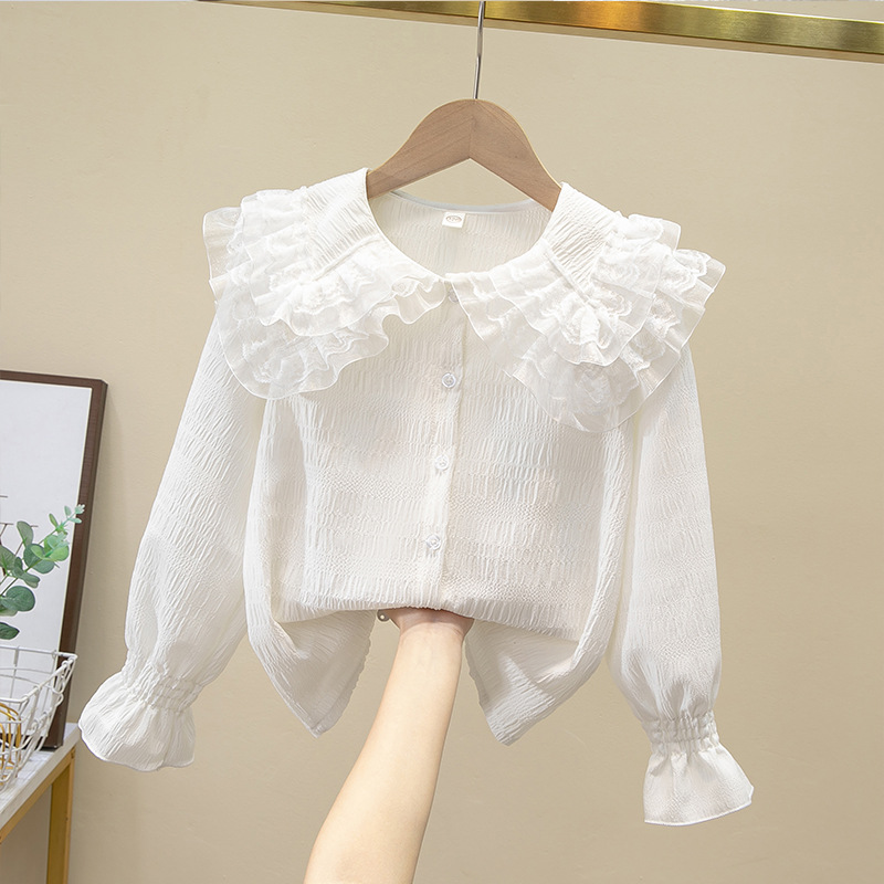 한국 스타일 2025 여아 쉬폰 셔츠, 패셔너블하고 세련된 레이스 칼라 중대형 아동 셔츠, 다용도스토어 가기