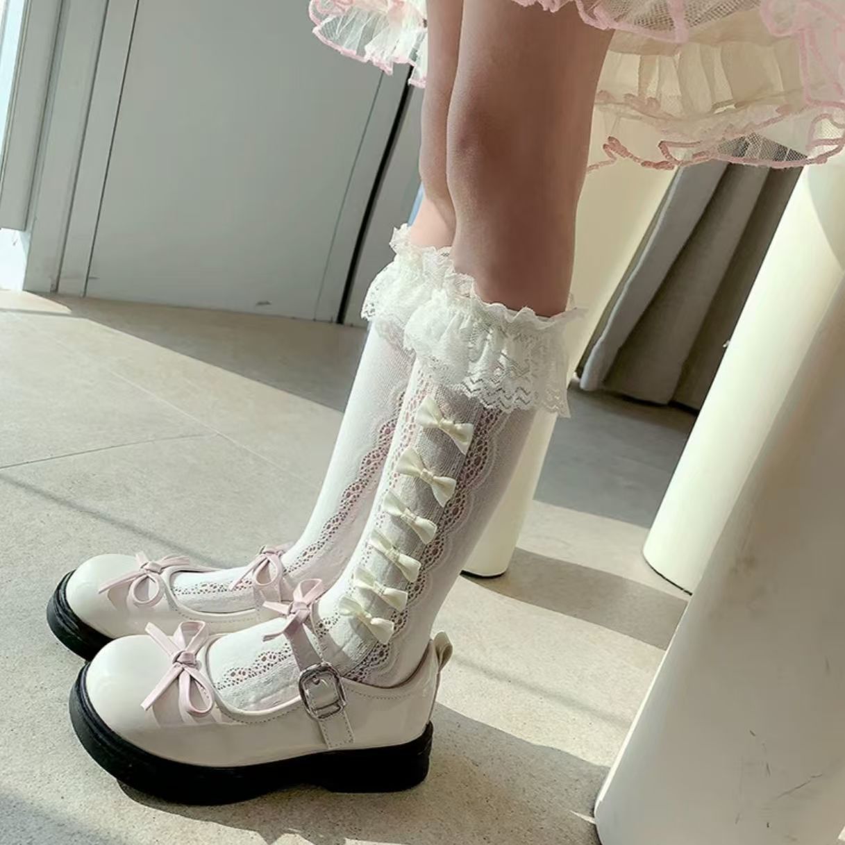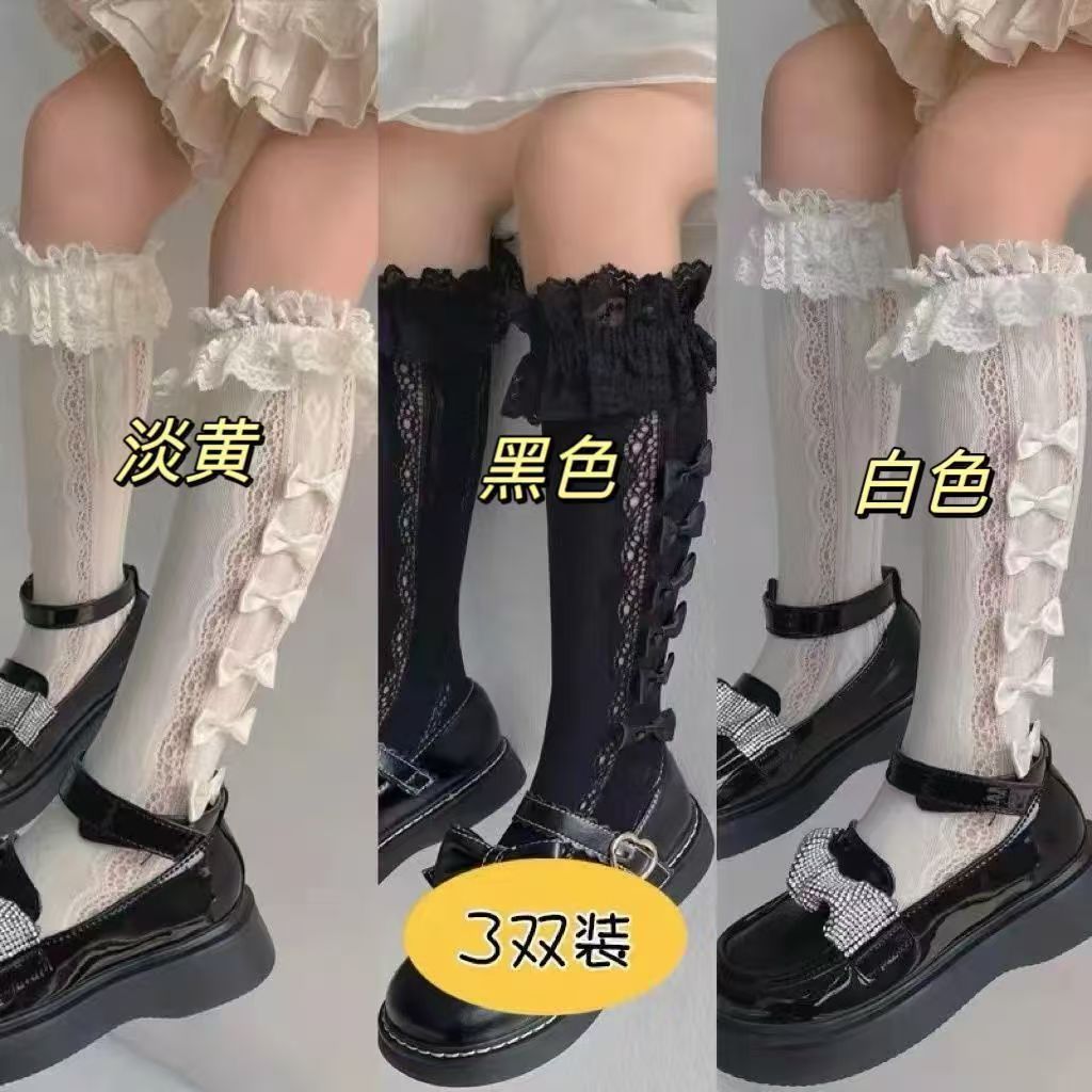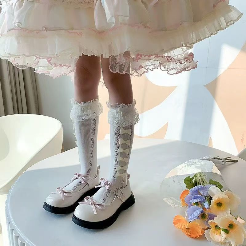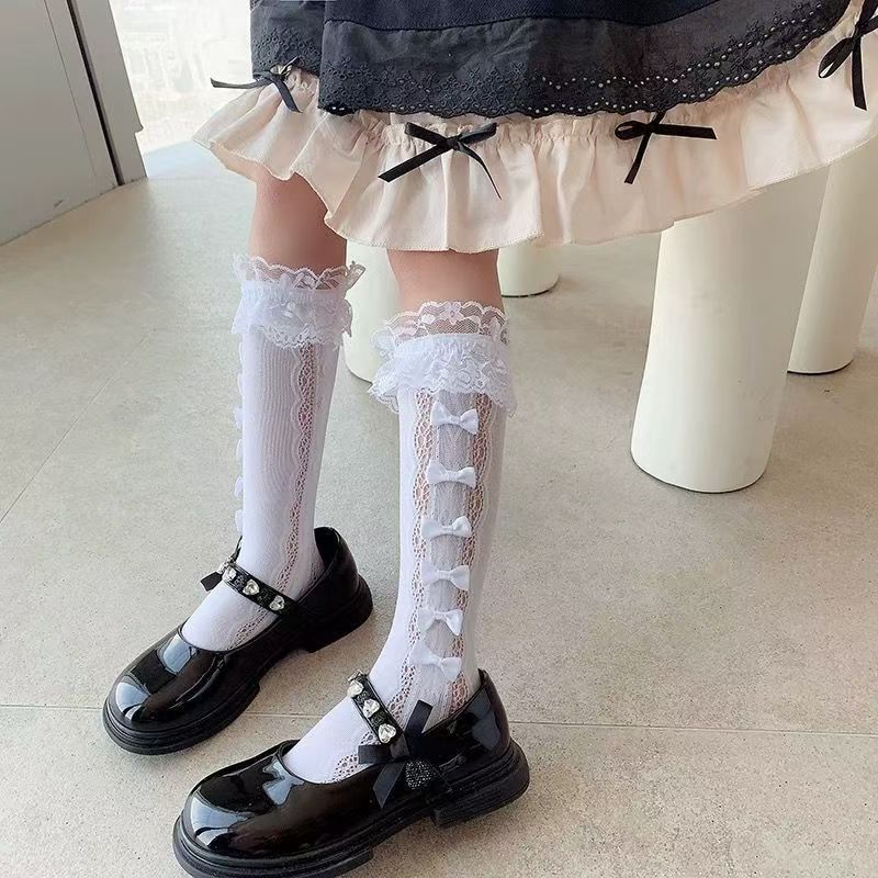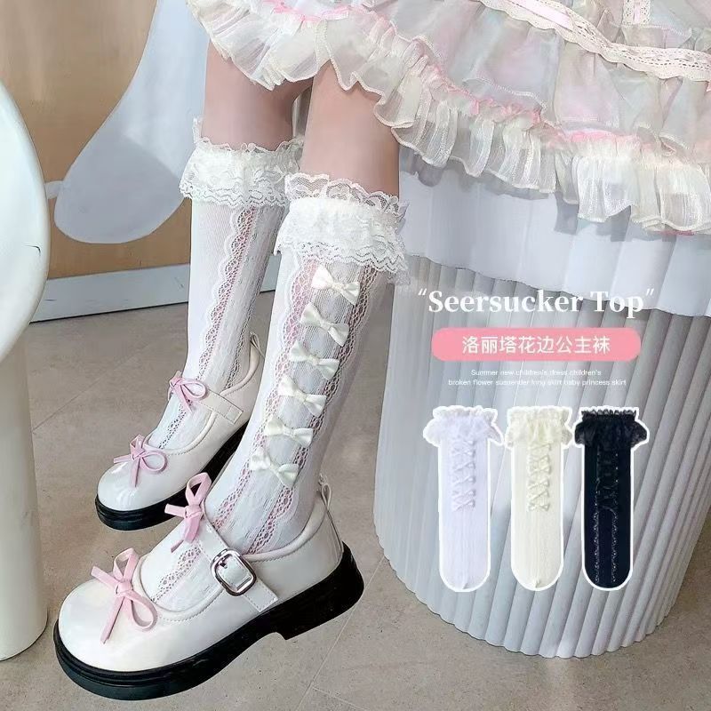 여름 스타킹 귀여운 레이스 활 더미 양말 소녀 새끼 양말 어린이 로리타 공주 중간 길이 양말