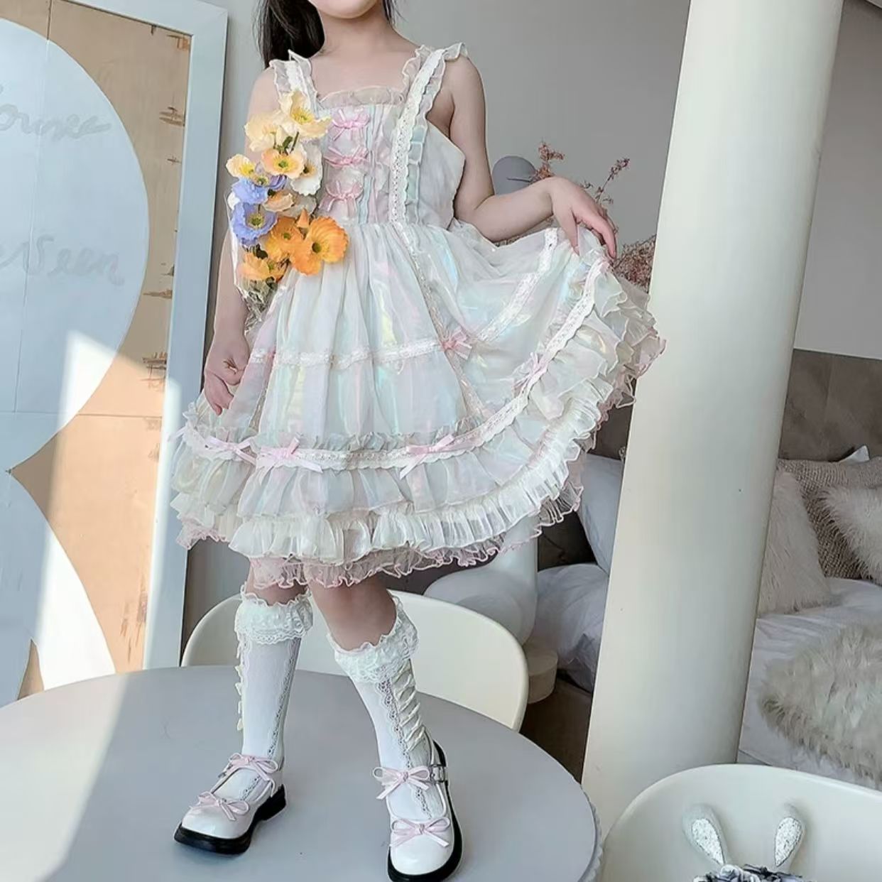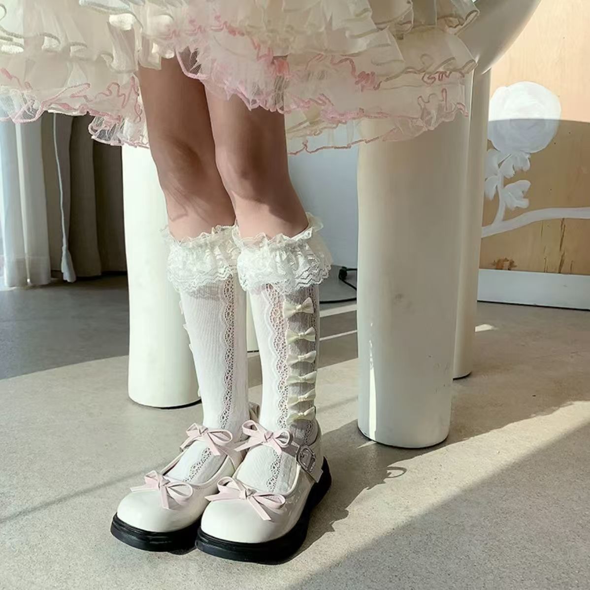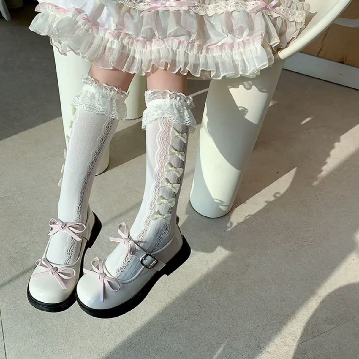 여름 스타킹 귀여운 레이스 활 더미 양말 소녀 새끼 양말 어린이 로리타 공주 중간 길이 양말