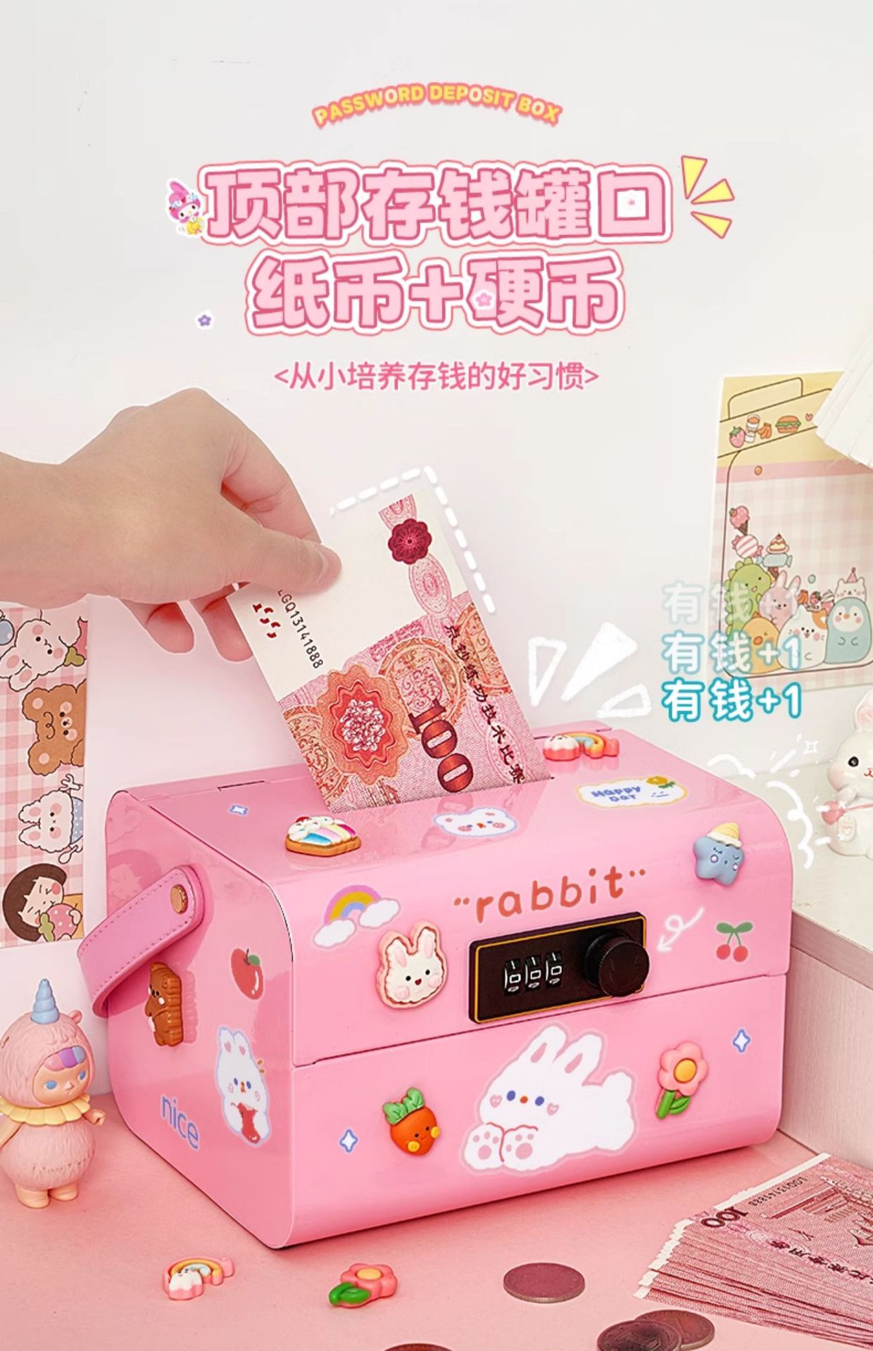 • 프린세스 핑크 휴대용 비밀번호 상자(무료 토끼 스티커 + 입체 패치 7개)
