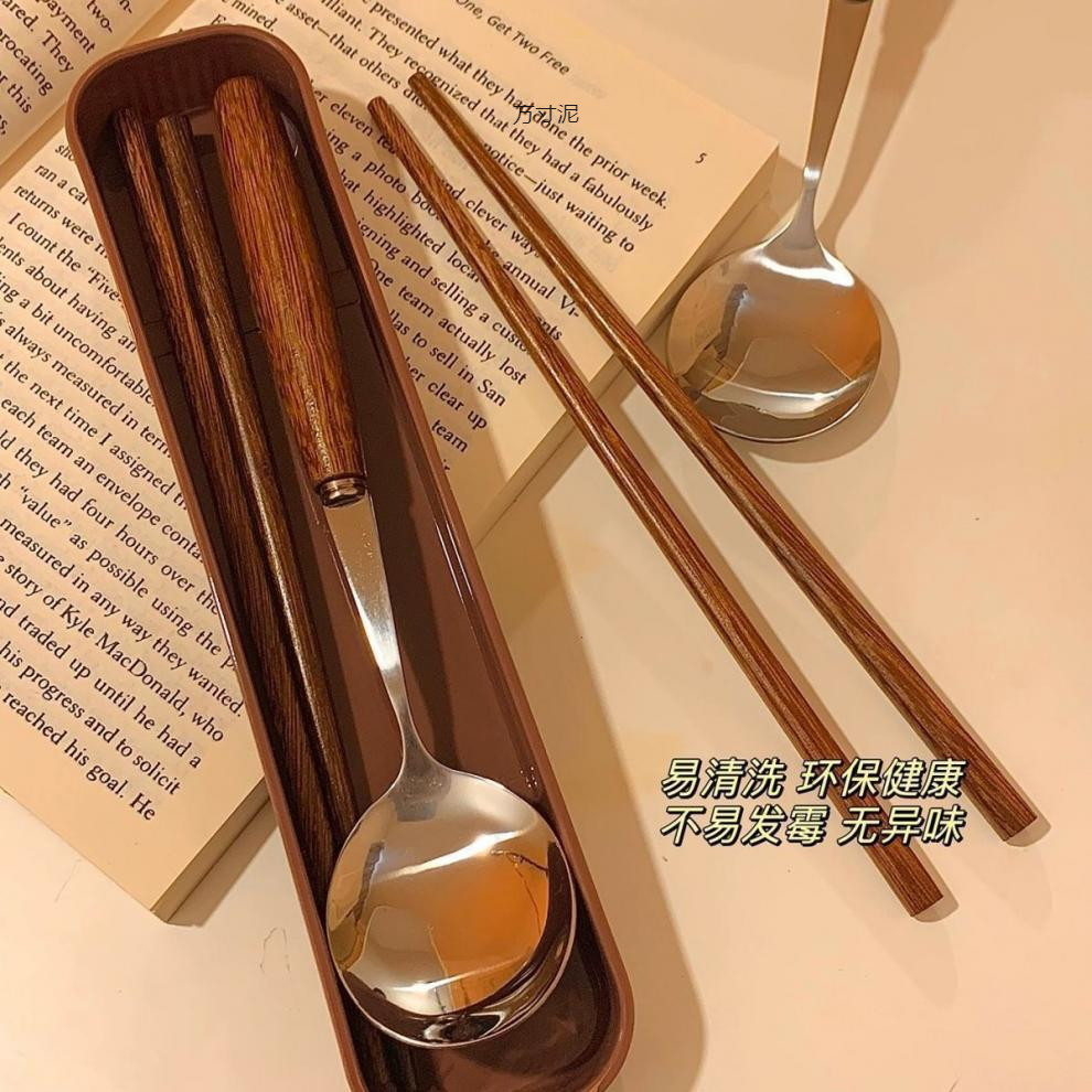 ✅진한 베이지 닭 날개 나무 원통형 나무 손잡이 젓가락 숟가락은 휴대용 식기 세트 학생들과 함께 외출