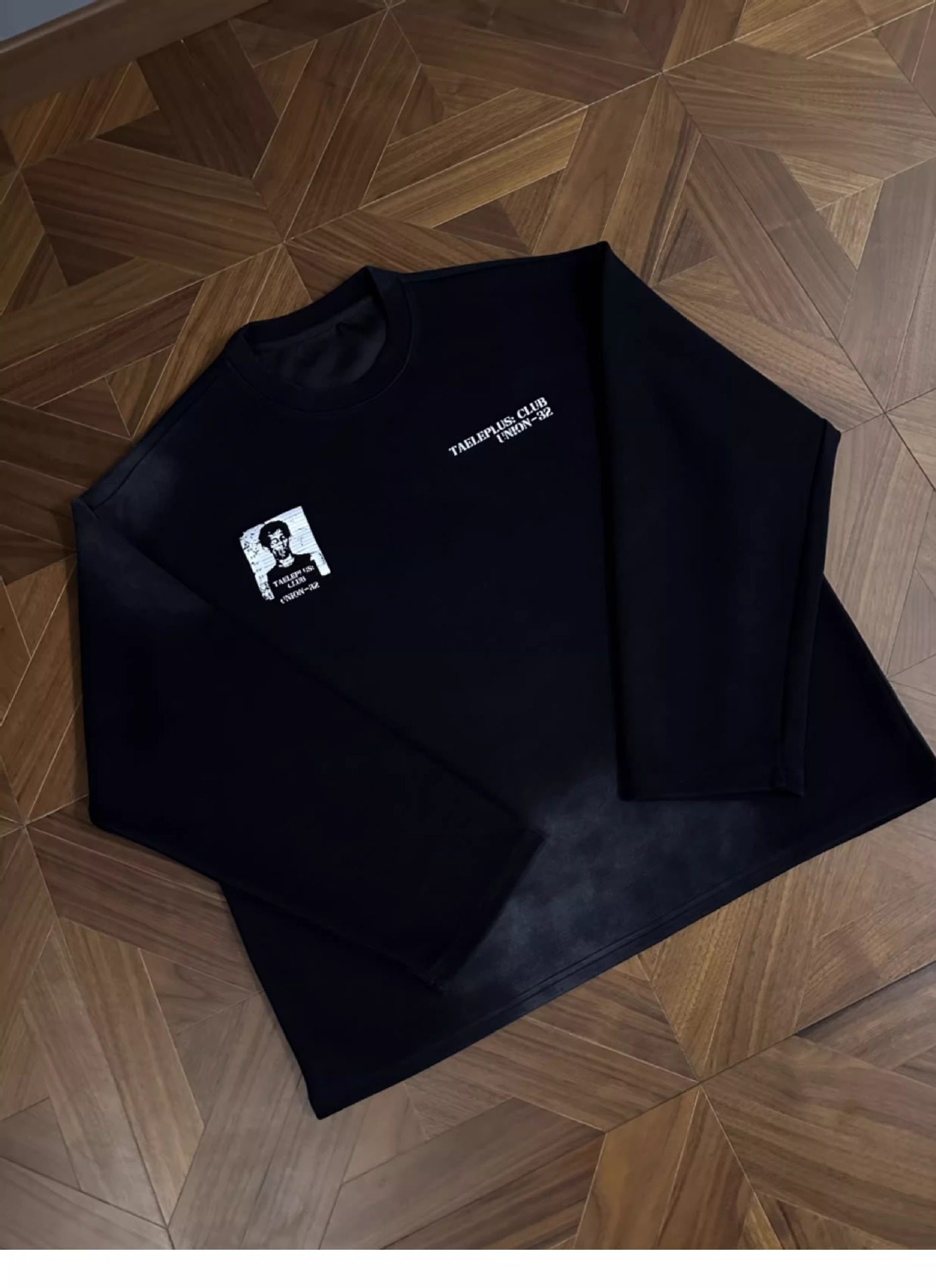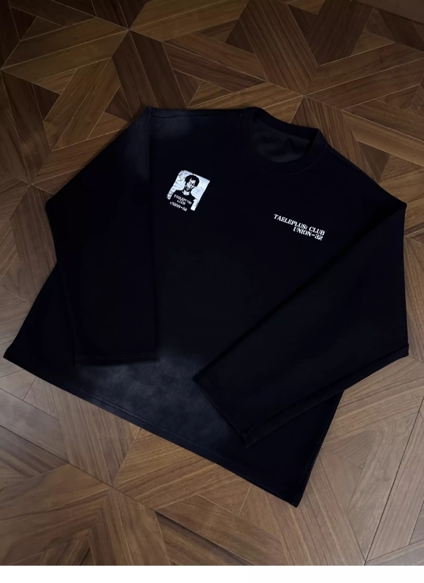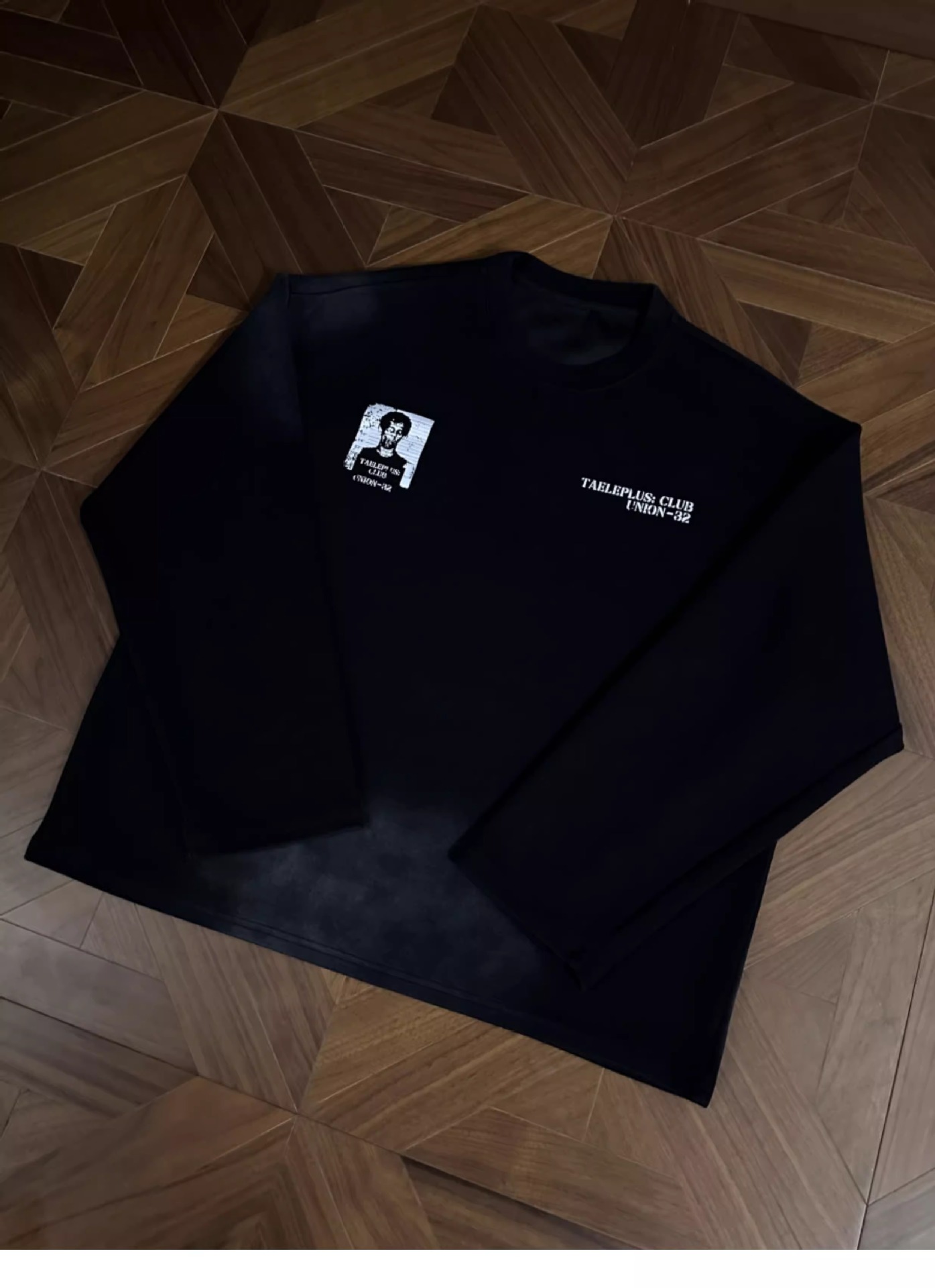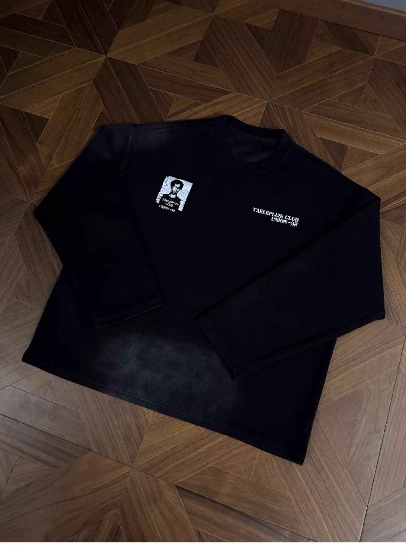 RTIMFD 미국 복고풍 캐릭터 높은 카운트 기지 긴 소매 클린 핏 크루 넥 오래 된 파괴 내부