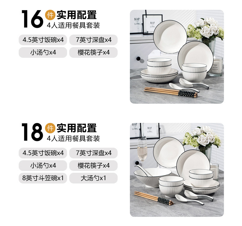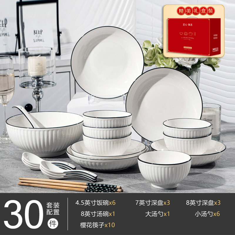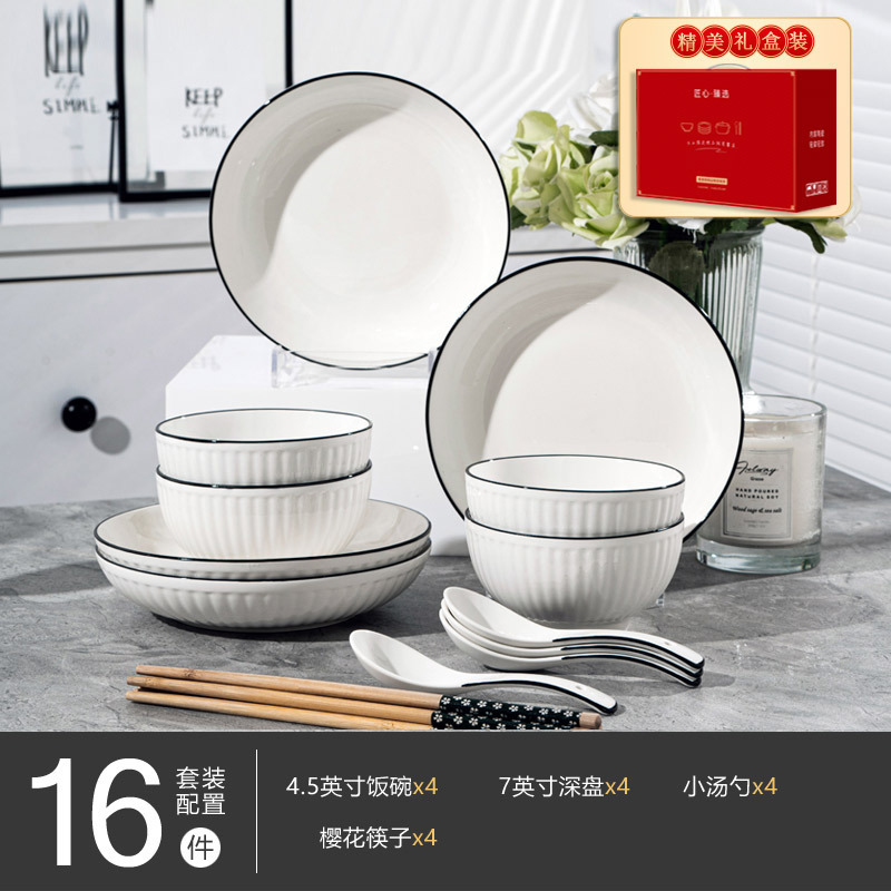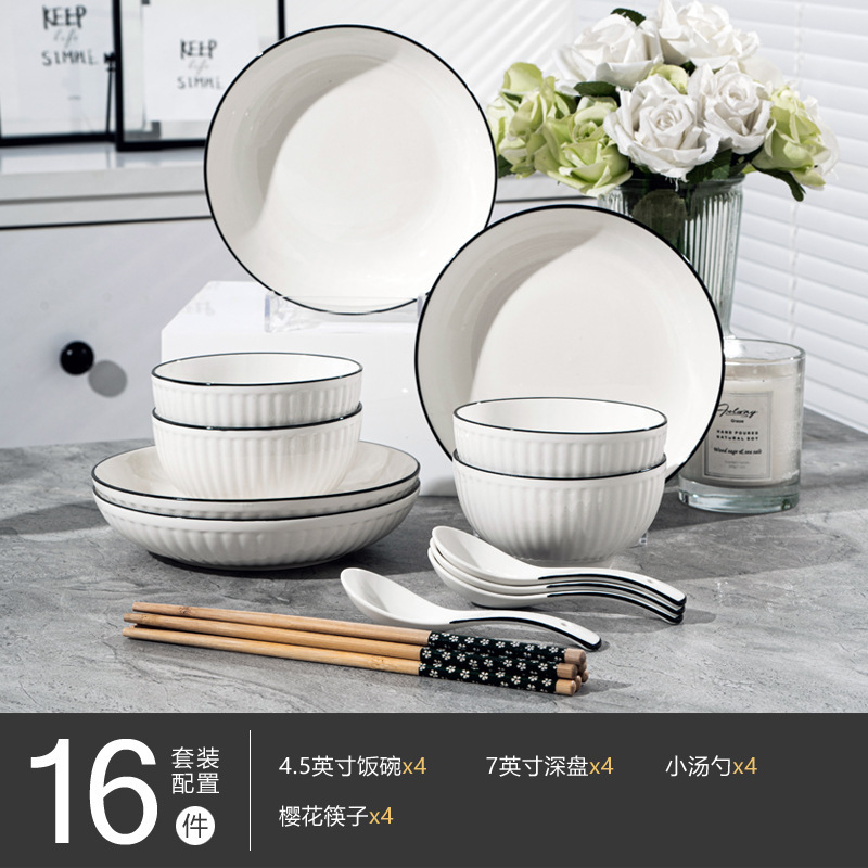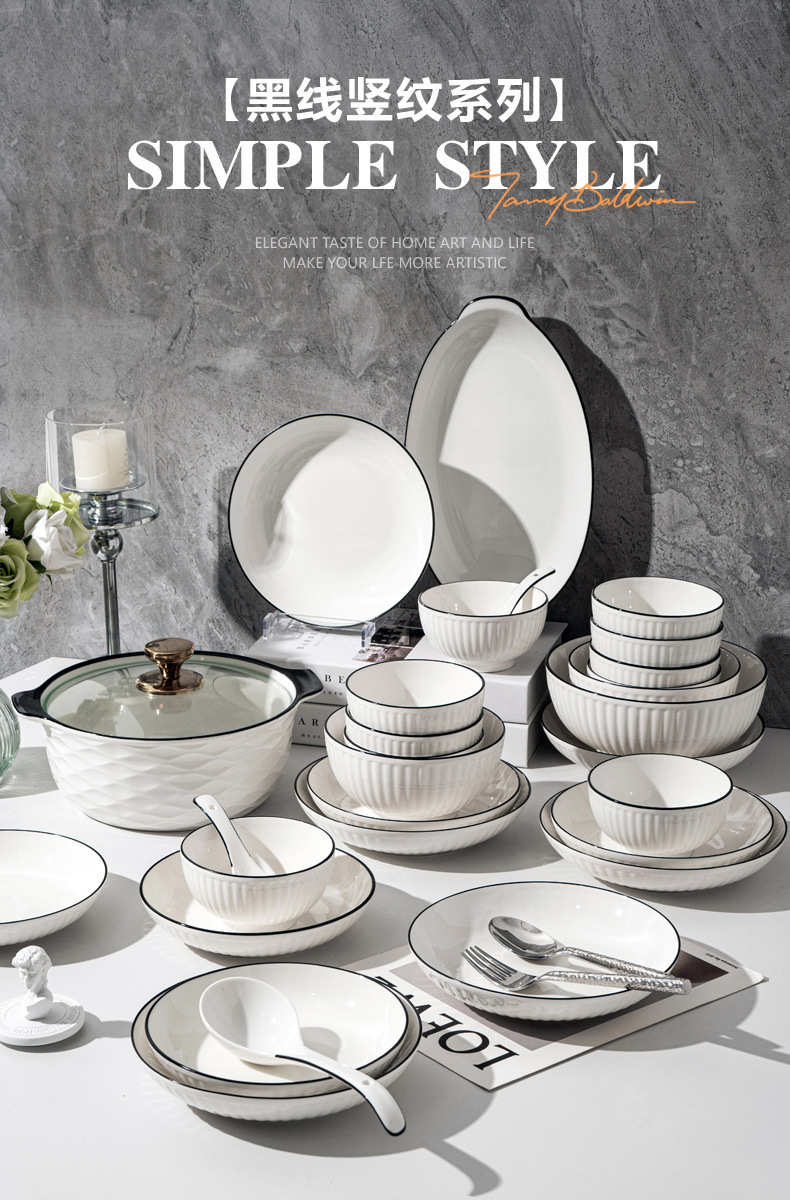 경덕진 도자기 식기 세트, 산타야 세로 줄무늬 검은 선 일본식 그릇 세트, 가정용 유약 밑색 식기 세트 선물