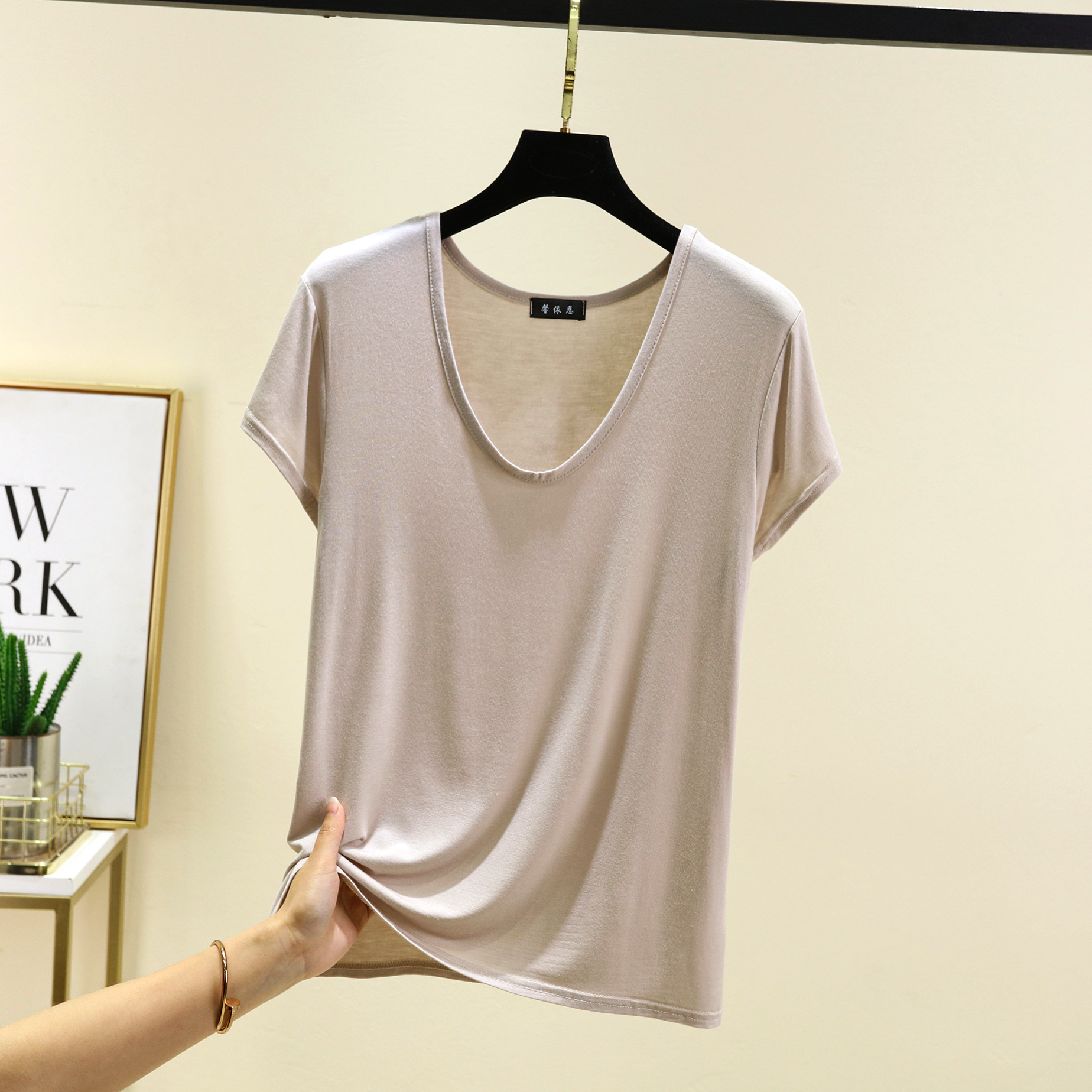 여성용 모달 반팔 로우 넥 U 넥 홈 의류 여름 얇은 느슨한 타원형 칼라 티셔츠 잠옷은 캐주얼 외부에서 착용 가능