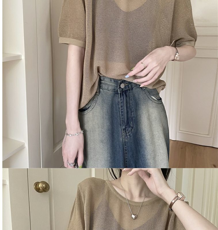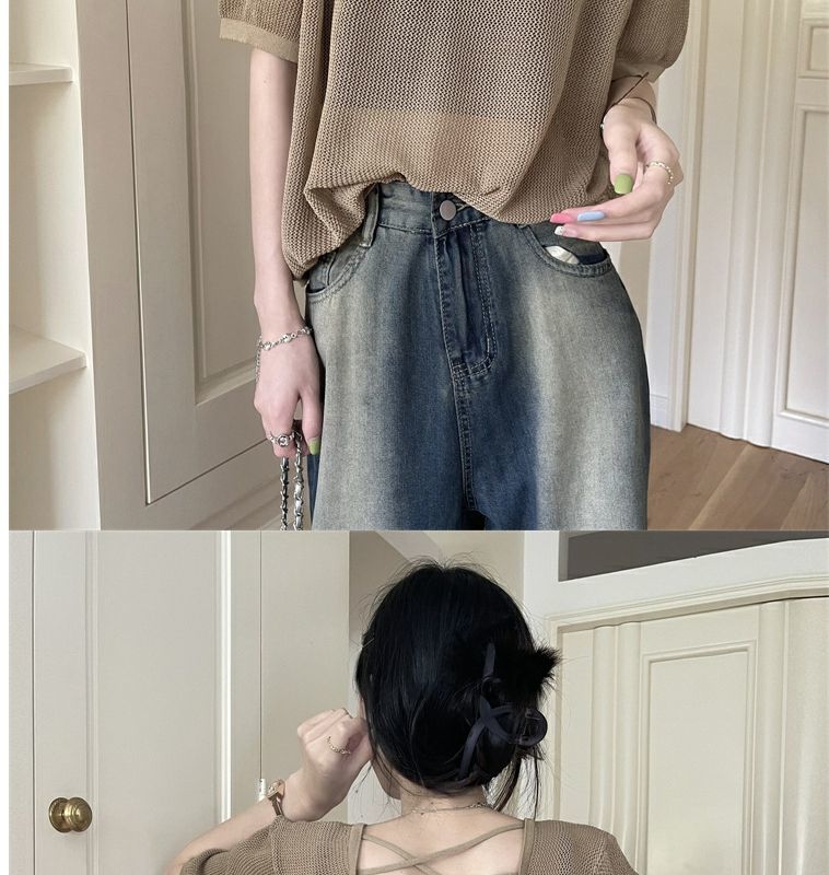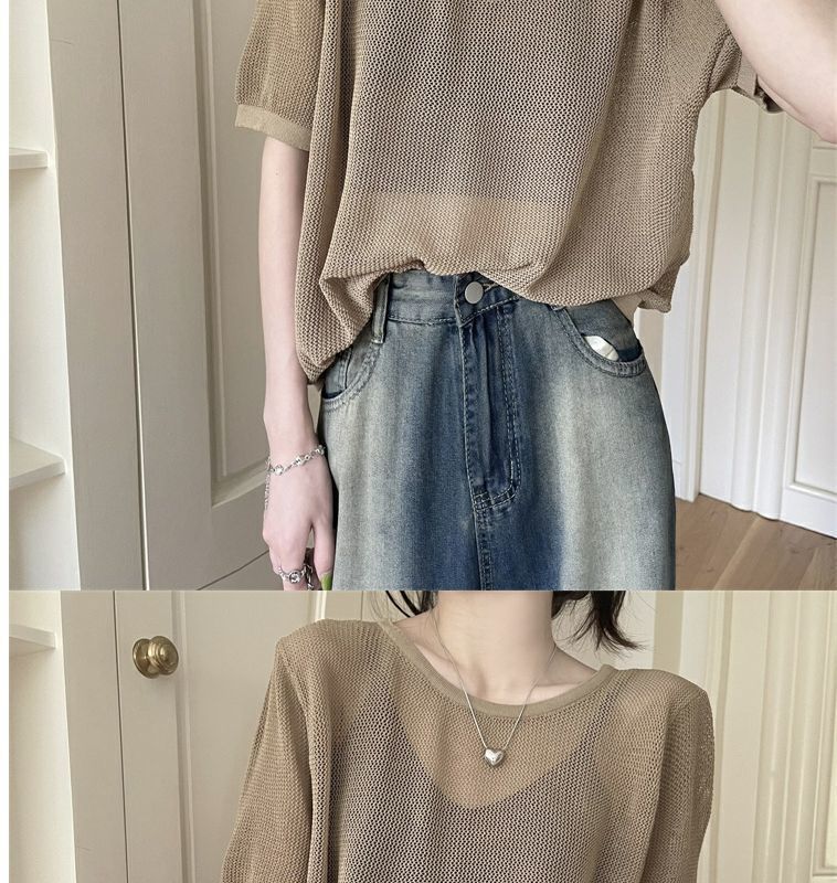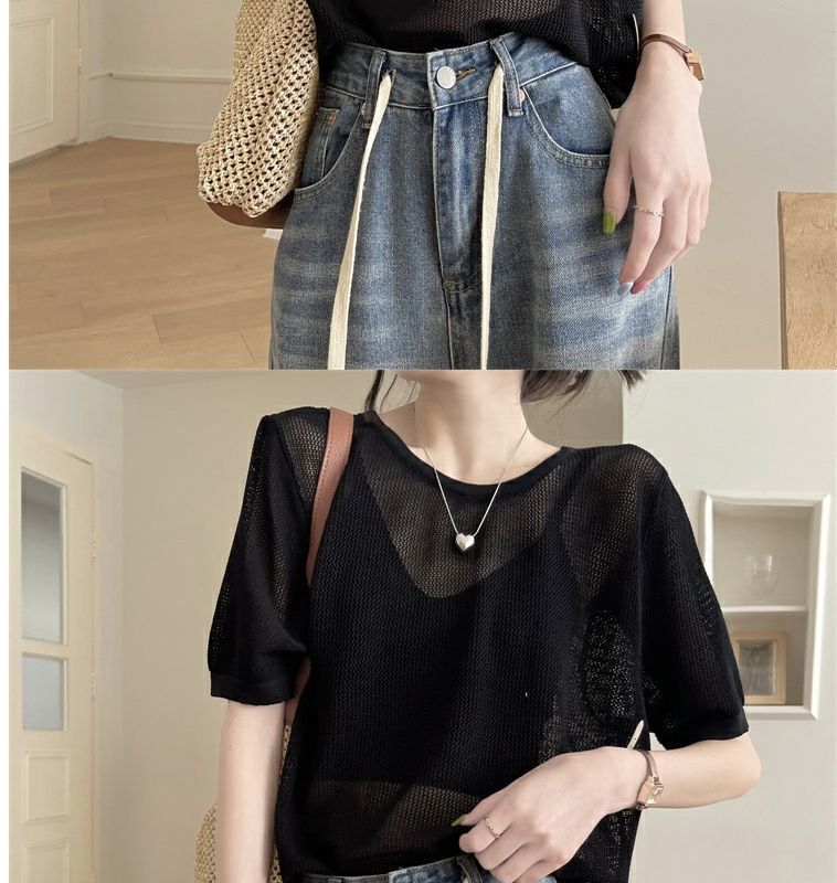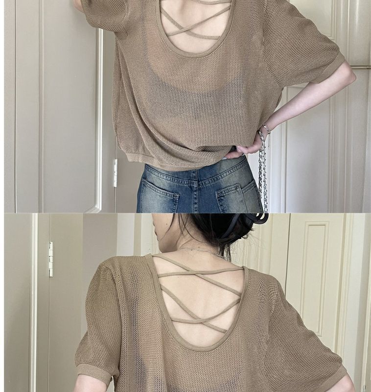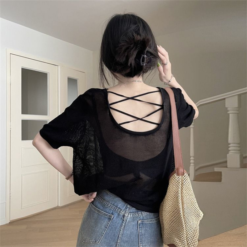 간단한 티셔츠 여성용 백 크로스 니트 탑 작은 셔츠 루즈 슬림 핏 라운드 넥 2024 여름 시원한 느낌베이스 셔츠