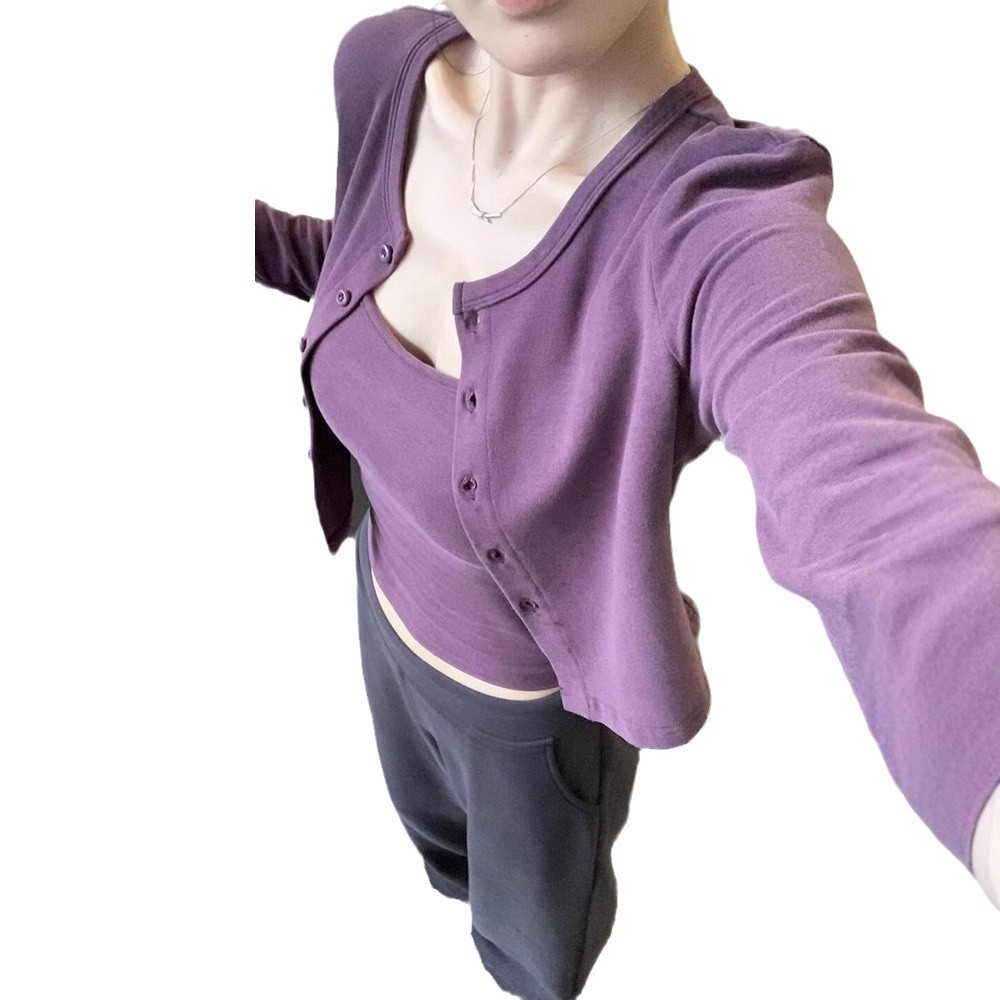 한국 스타일의 뜨거운 소녀 보라색 캐미솔 카디건 셔츠 짧은 슬림 탑 투피스 세트 여성 가을
