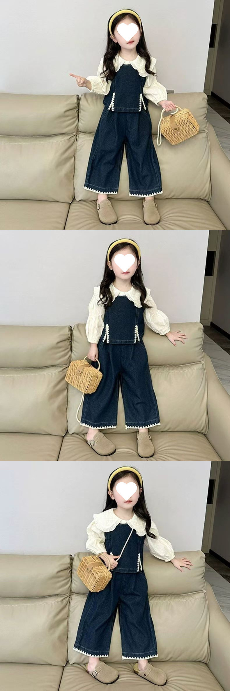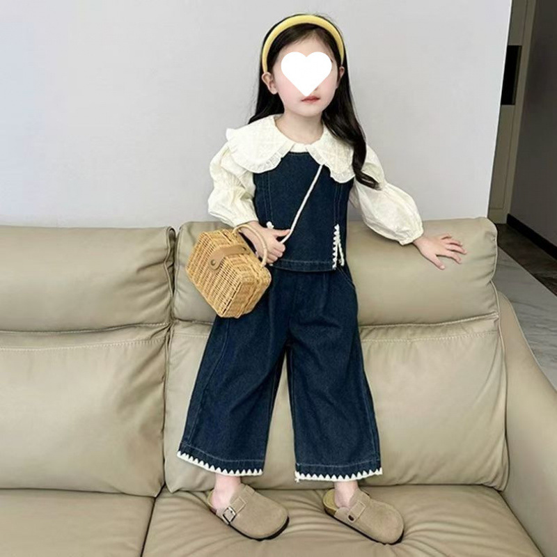 여자 가을 세트 2025 새로운 어린이 외국 스타일 데님 조끼 바지 셔츠 3 개스토어 가기
