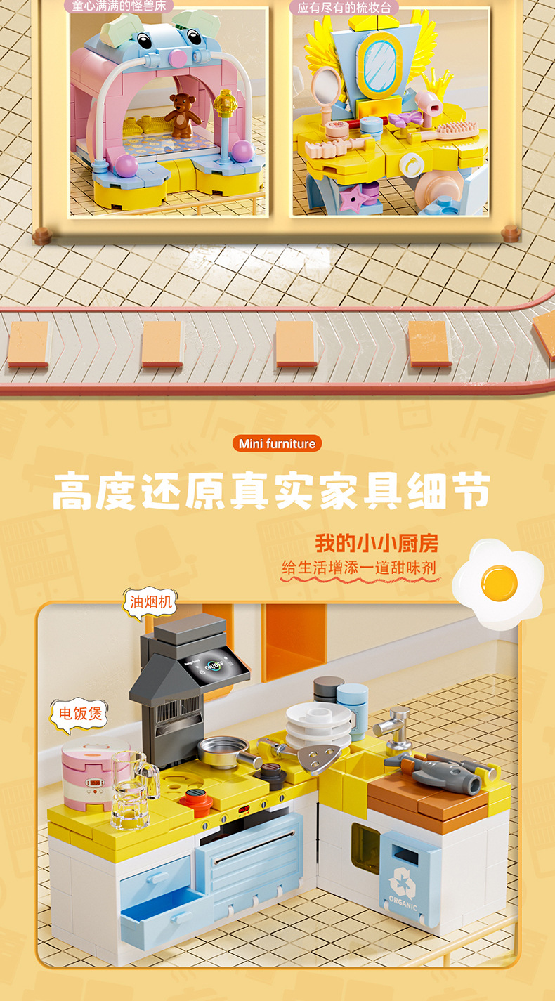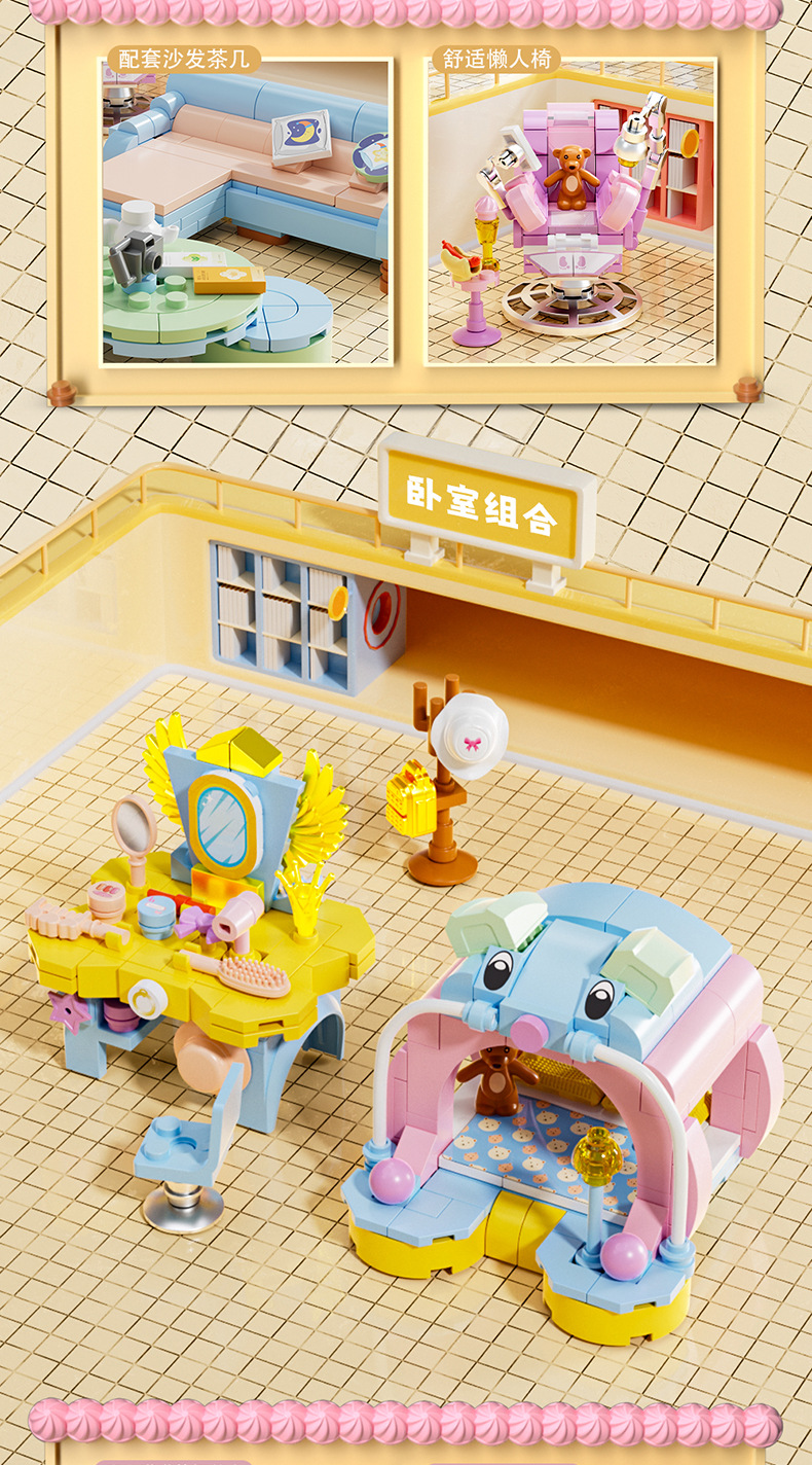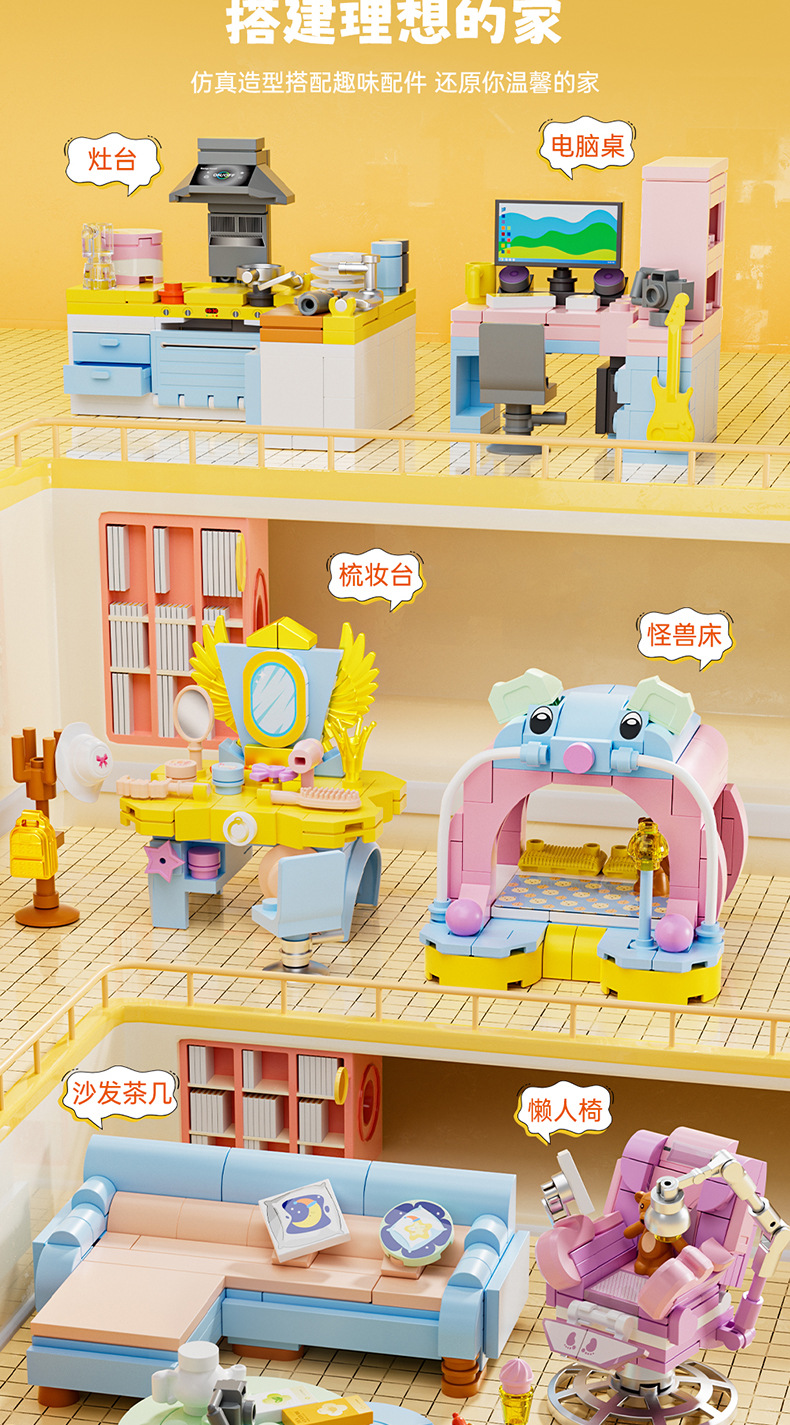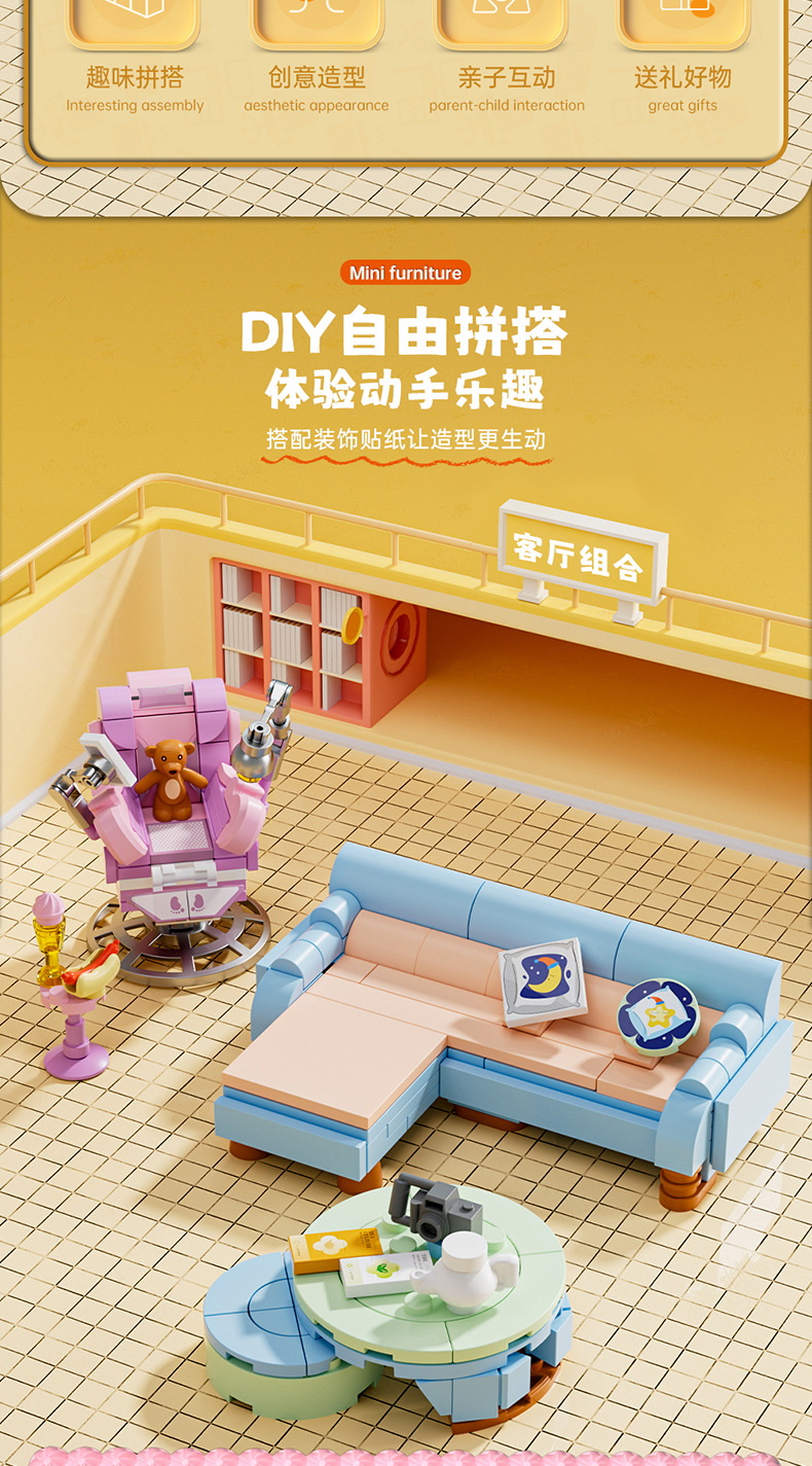 스퀘어 오렌지 8298 미니 가구 세트 소파 커피 테이블 컴퓨터 스토브 조립 모델 어린이 조립 빌딩 블록 장난감스토어 가기