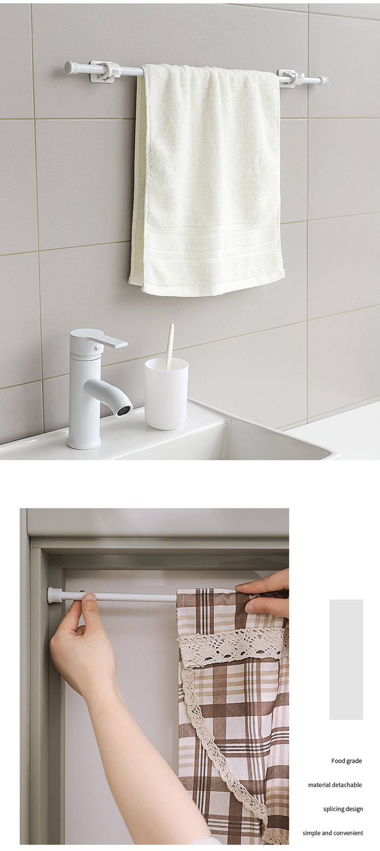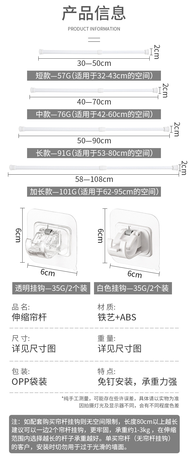 흰색 페인트 비 천공 커튼 텔레스코픽 로드 주방 워터 슈 캐비닛 레이어 로드 욕실 커튼 막대 클립 후크 지원 프레임