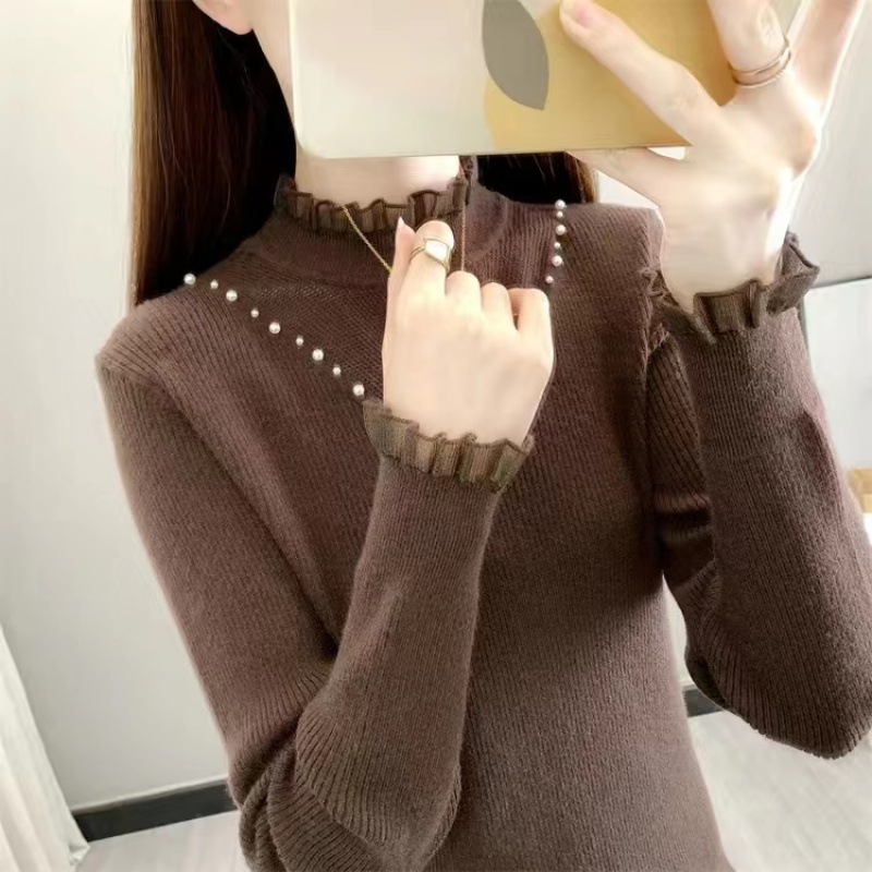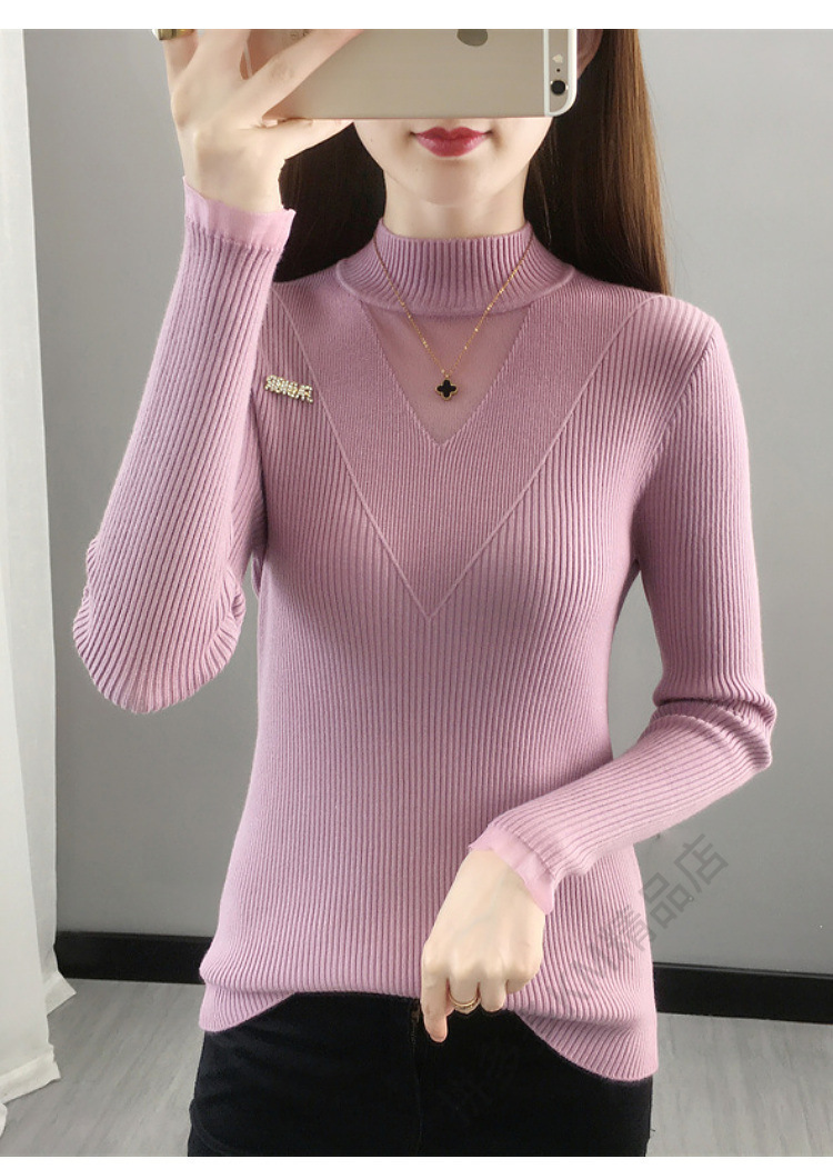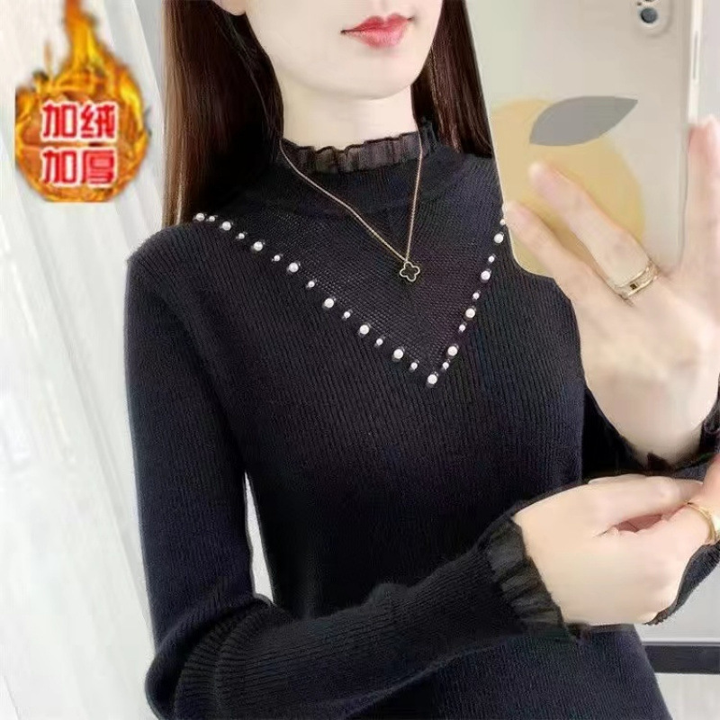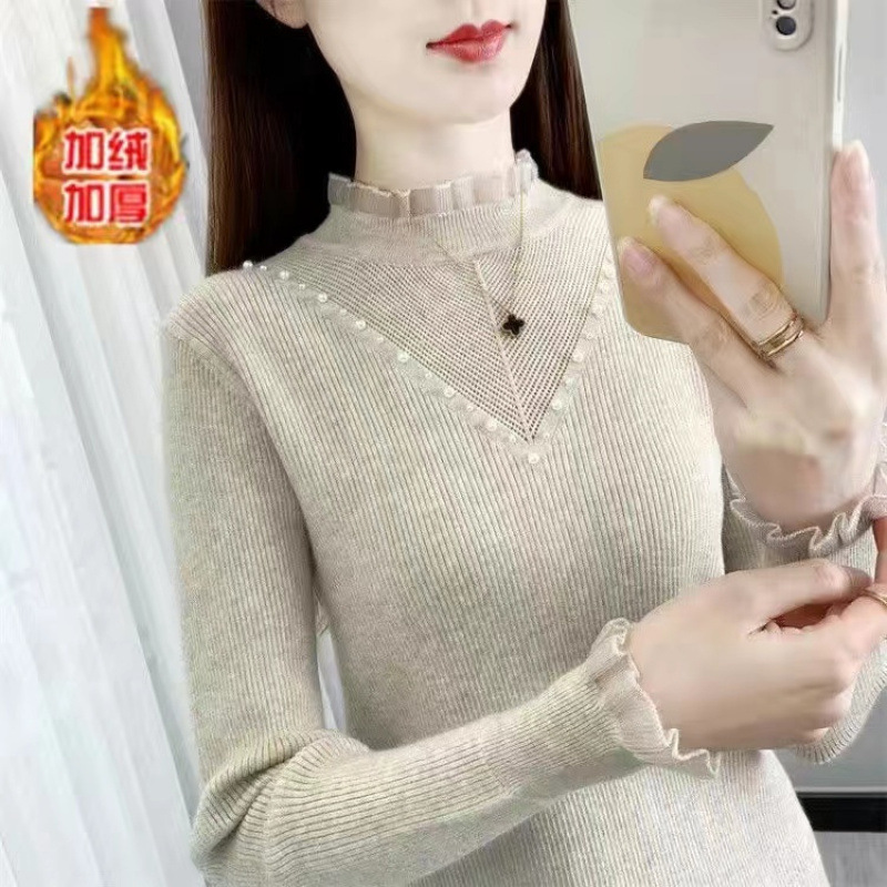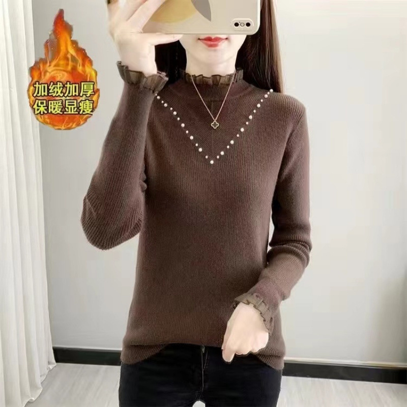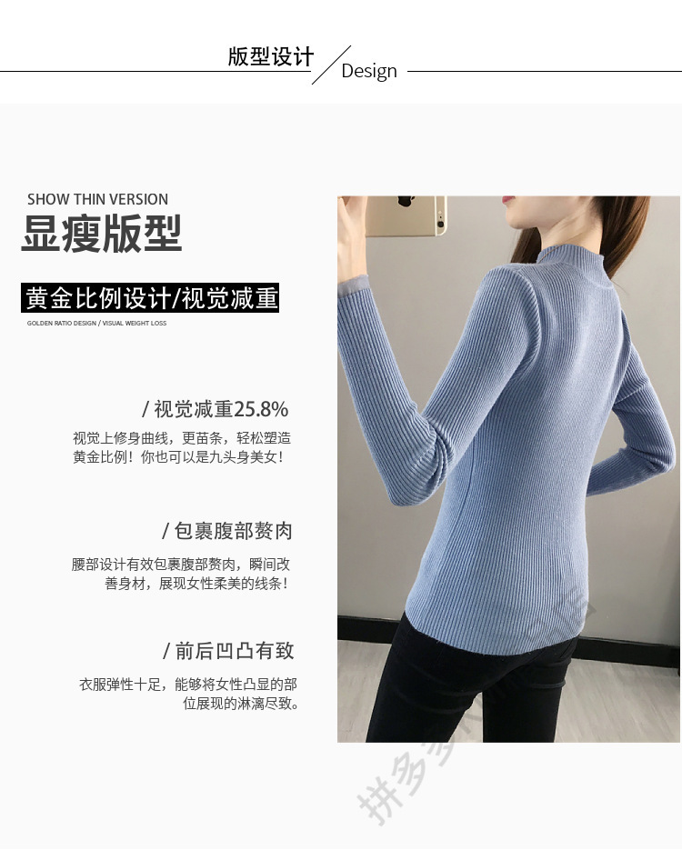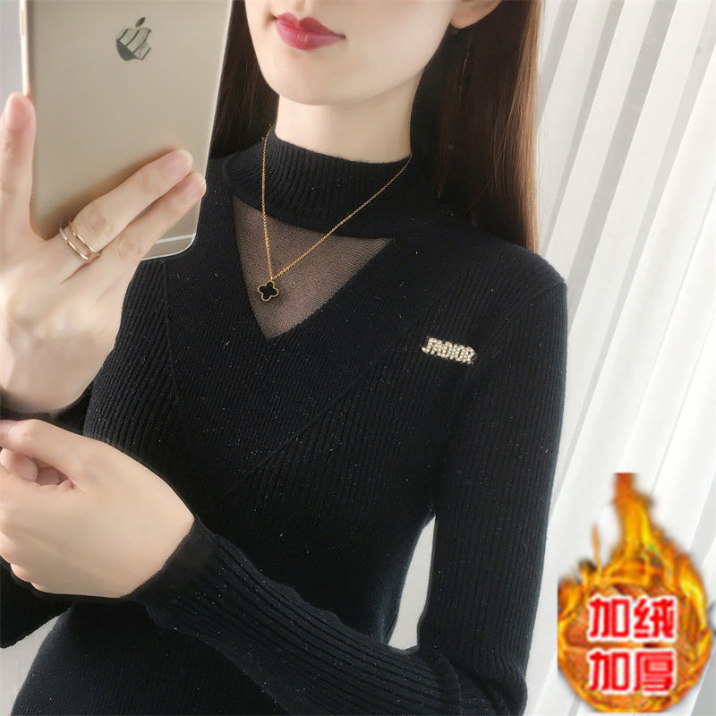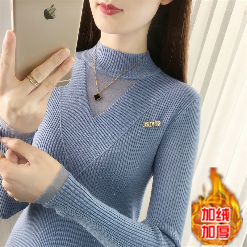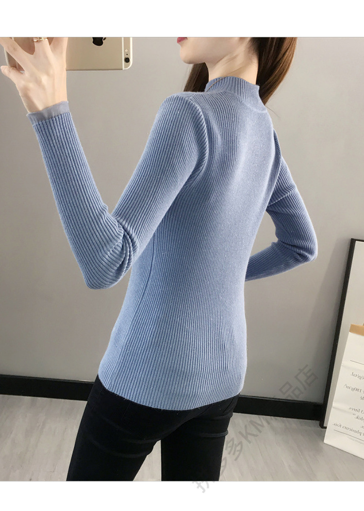 서양식 베이스 셔츠 여성의 새로운 가을과 겨울 탑 반쪽 터틀넥 기모 스웨터 여성의 두꺼운 외복 슬리밍 니트 스웨터