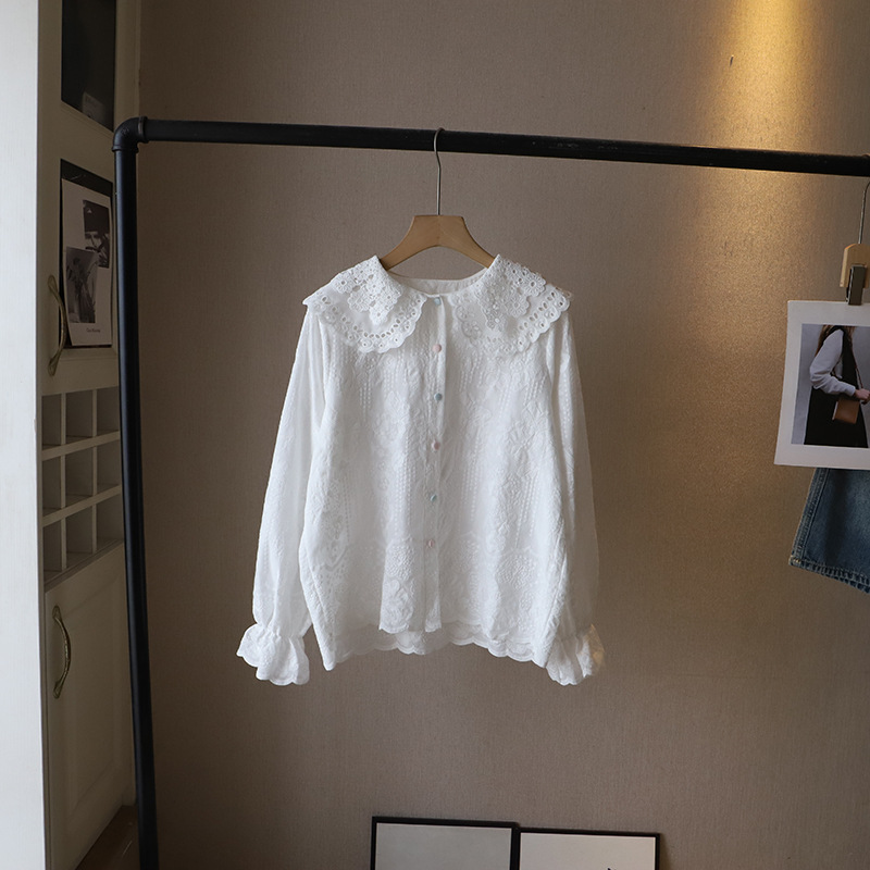 [비즈] 2025 봄 원피스 새 한국 레이스 할로우 인형 칼라 버튼 뿔 소매 달콤한 셔츠 여성 3600