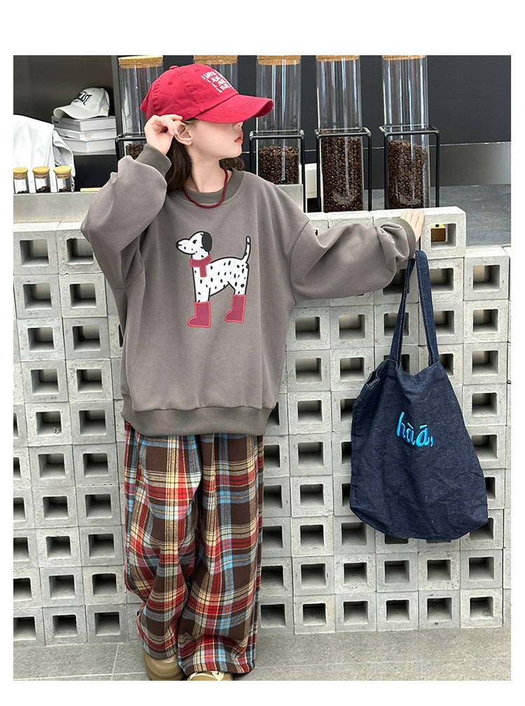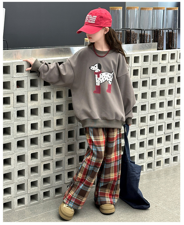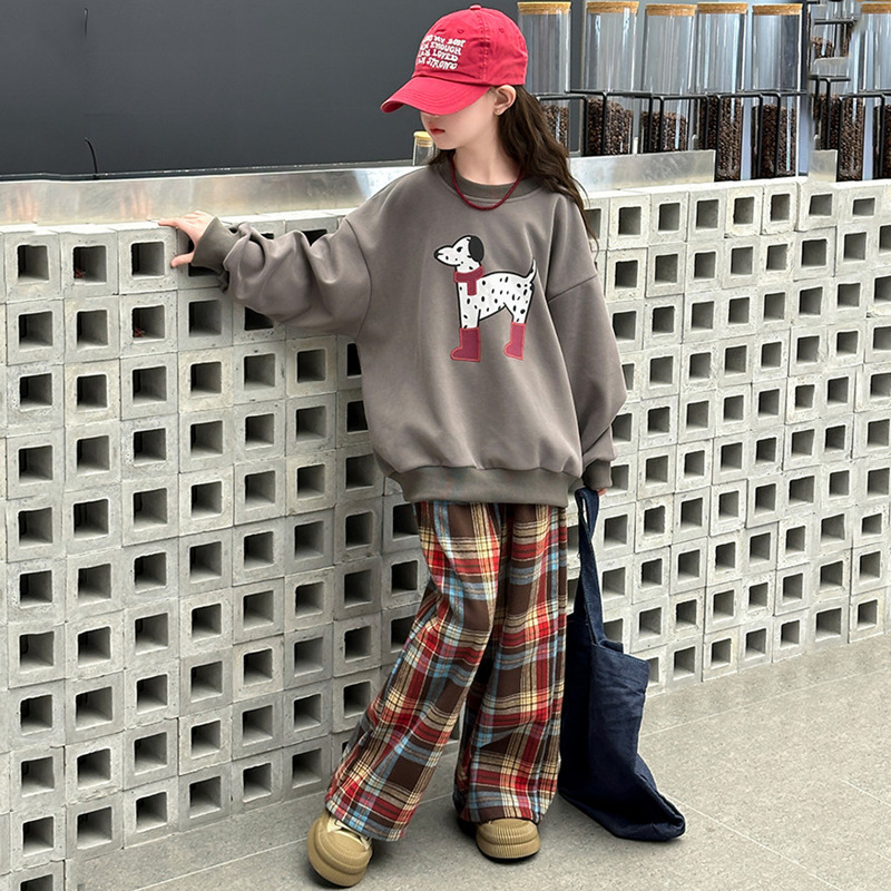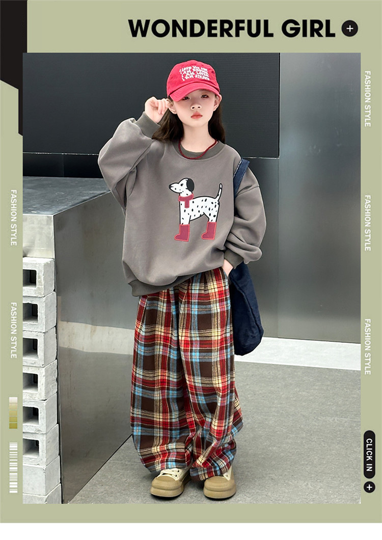 봄 2025 어린이 느슨한 캐주얼 세트 소녀의 만화 스웨트 셔츠 다채로운 격자 무늬 와이드 레그 바지 투피스 세트스토어 가기