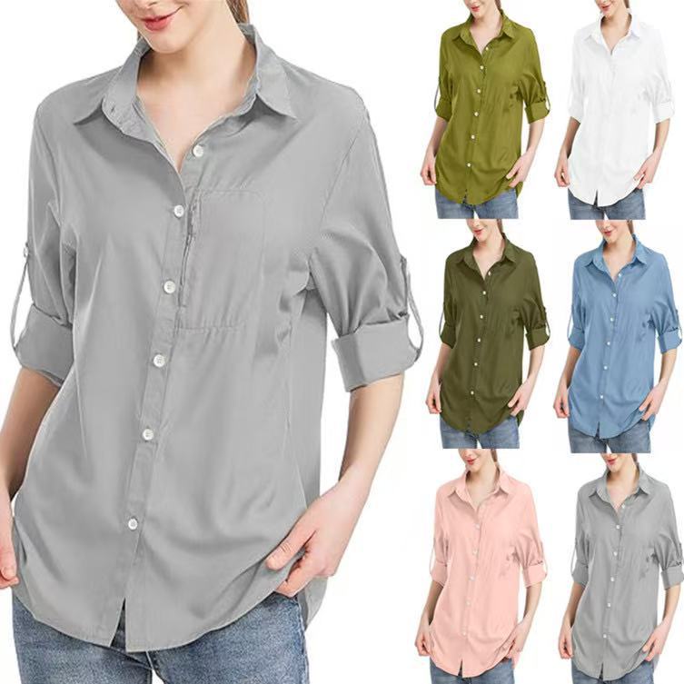 국경 간 대외 무역 아마존 독립 역 2025 유럽과 미국 여성의 단색 비즈니스 옷깃 지퍼 포켓 긴 소매 셔츠스토어 가기