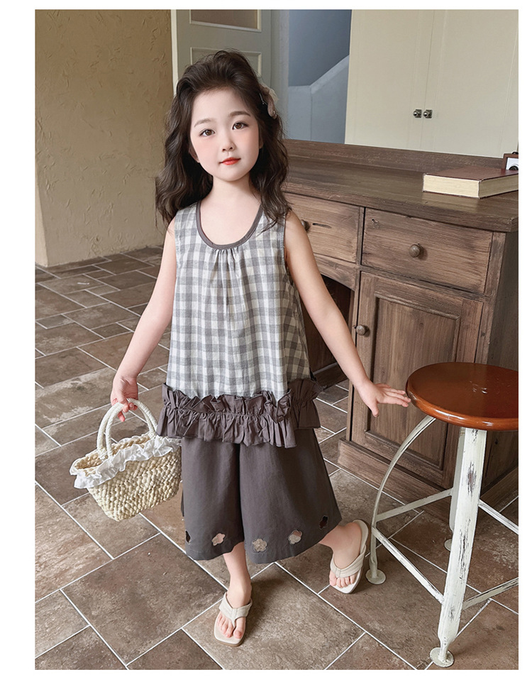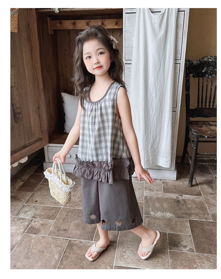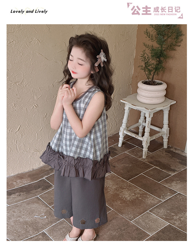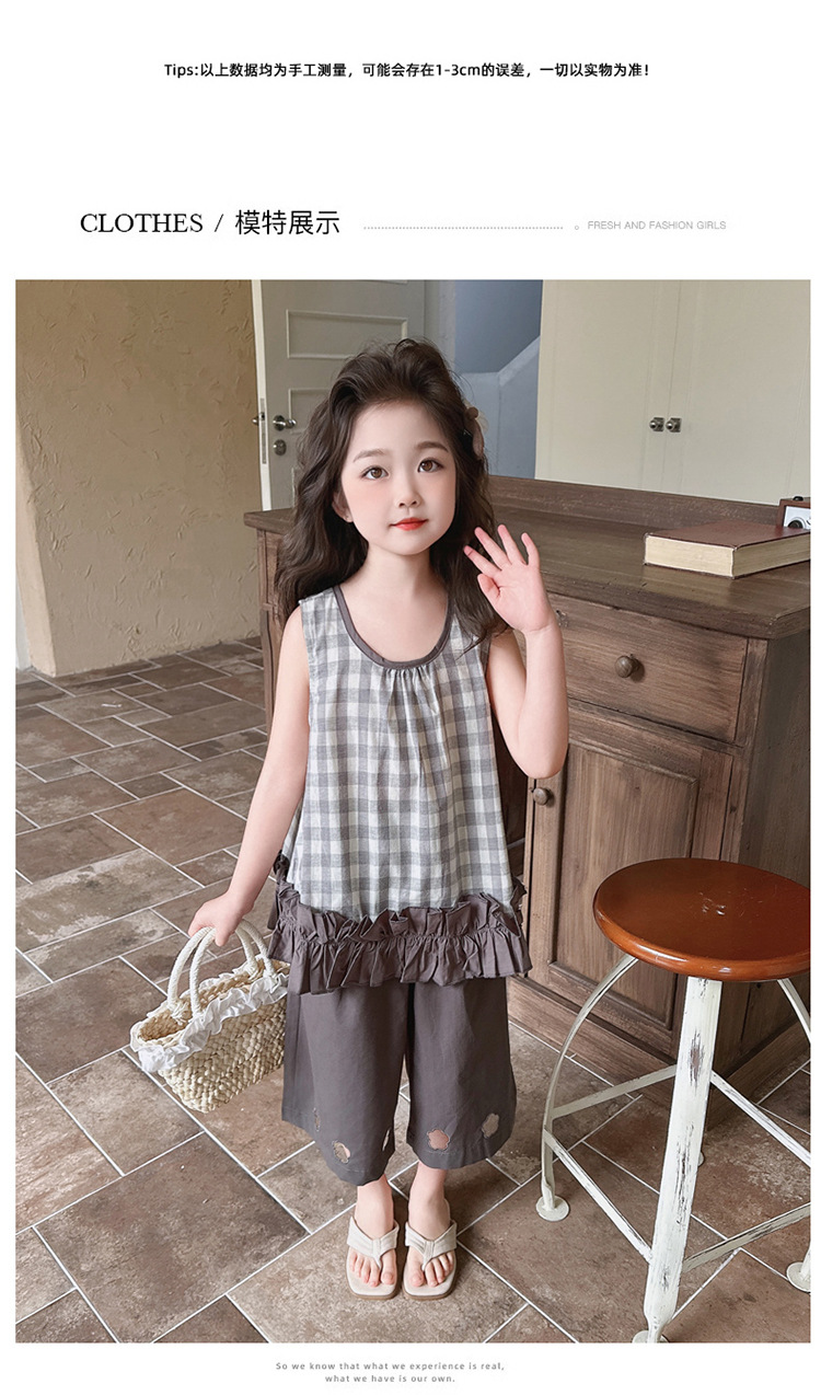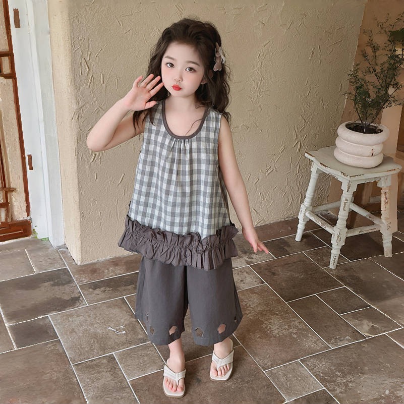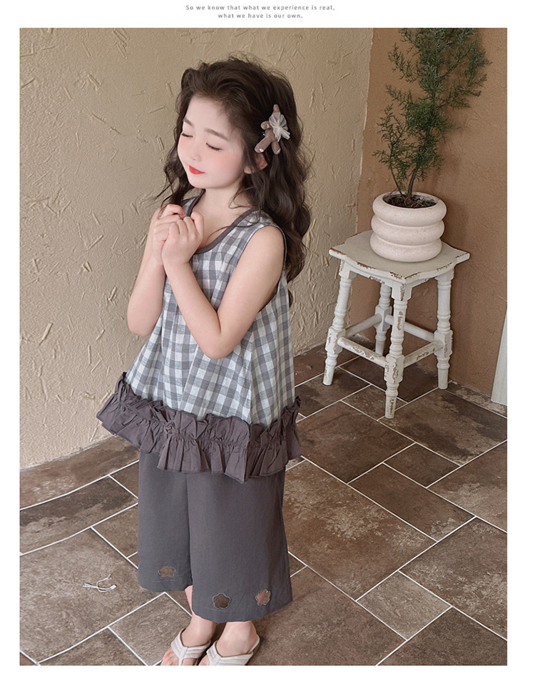 어린이 착용 한국 스타일 2025 여름 새 소녀의 격자 무늬 귀 소매 셔츠 빈 꽃 넓은 다리 바지