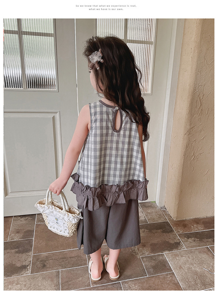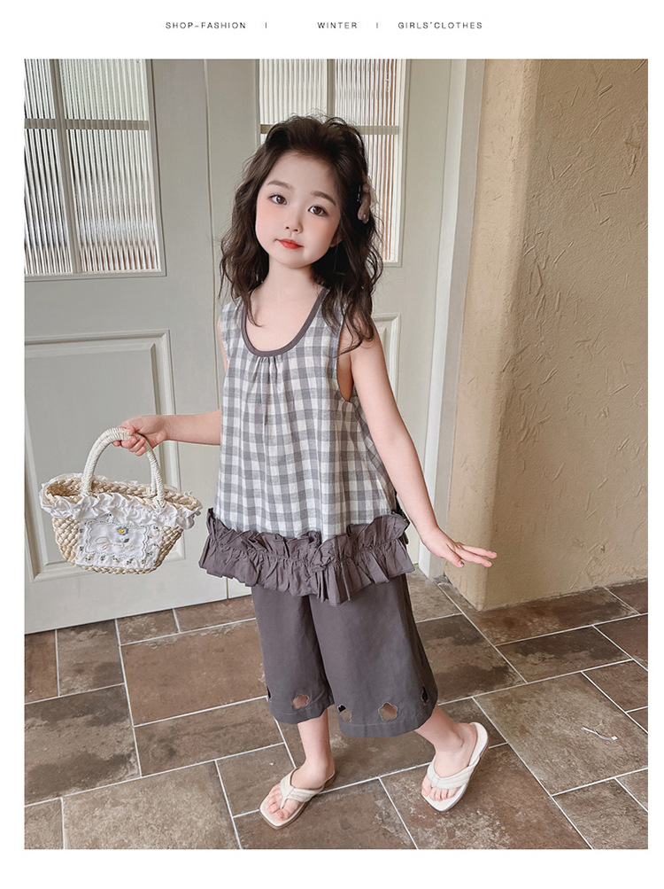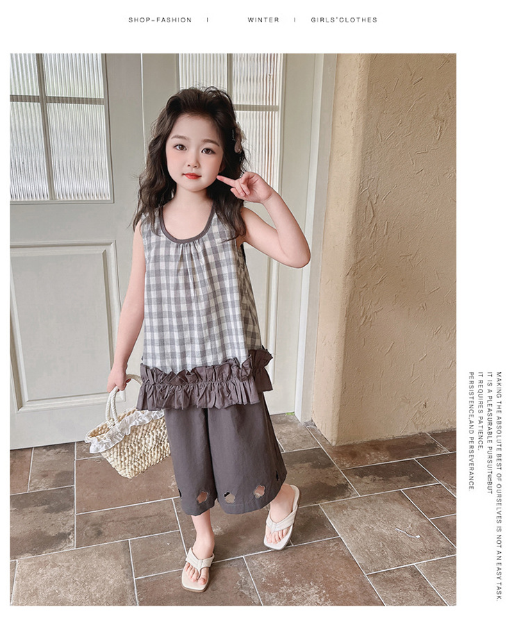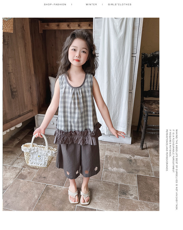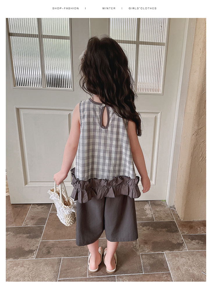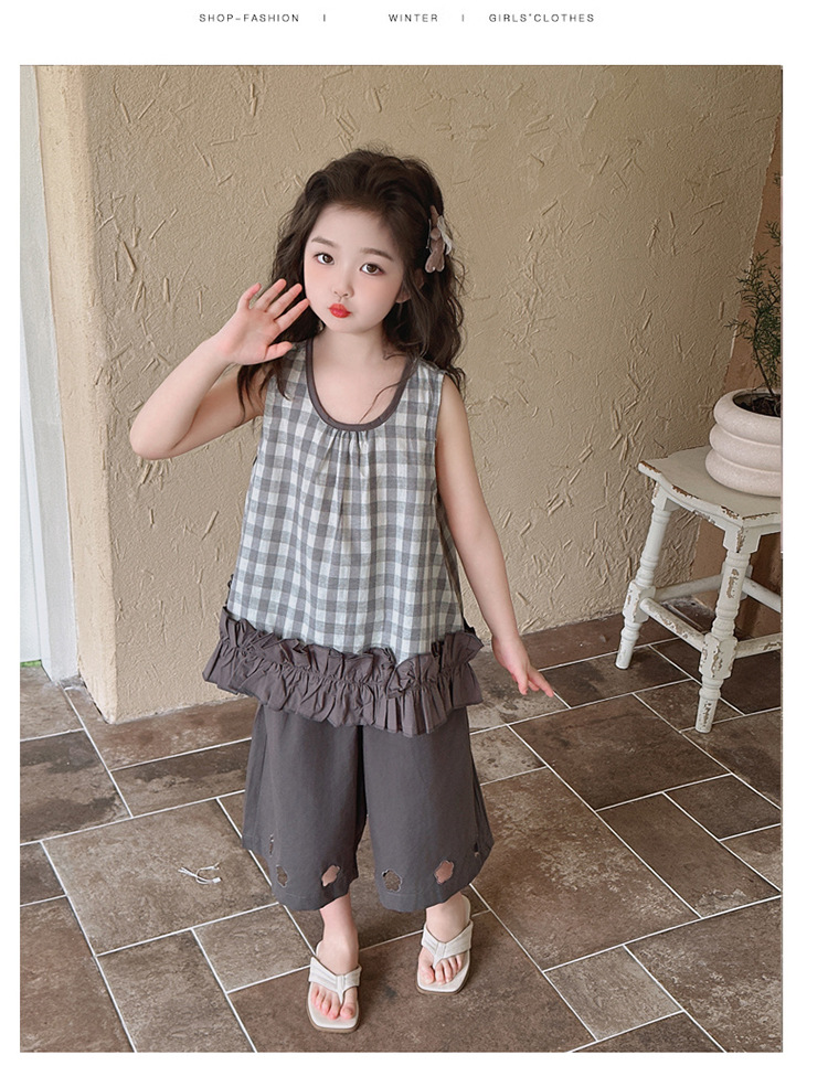 어린이 착용 한국 스타일 2025 여름 새 소녀의 격자 무늬 귀 소매 셔츠 빈 꽃 넓은 다리 바지