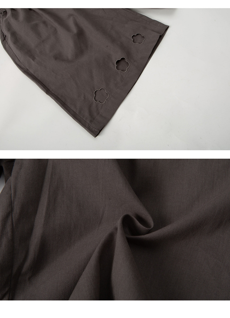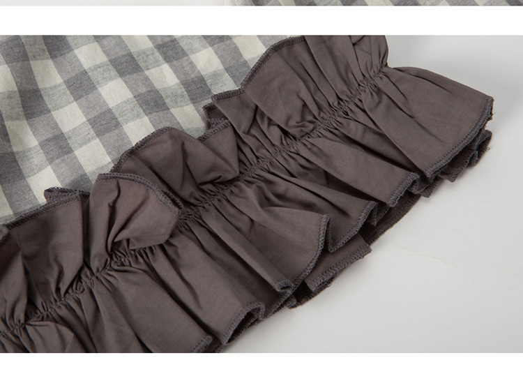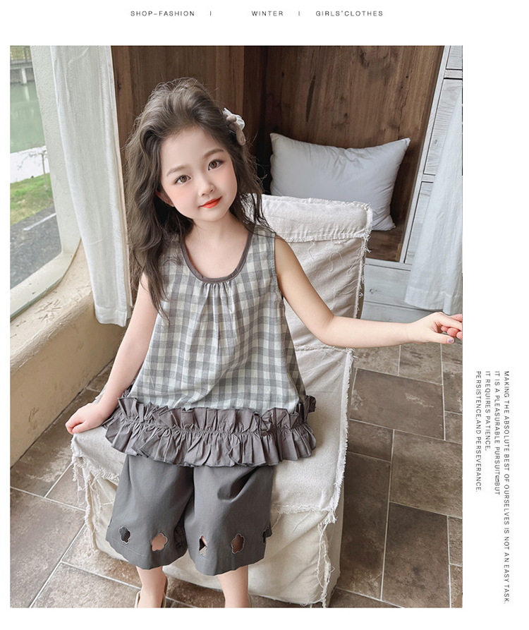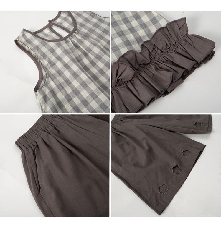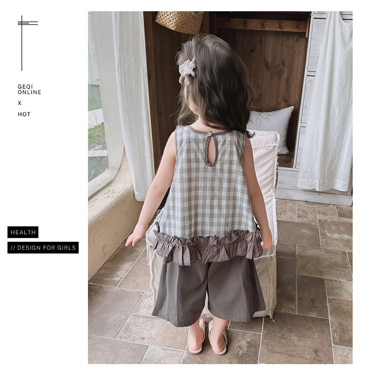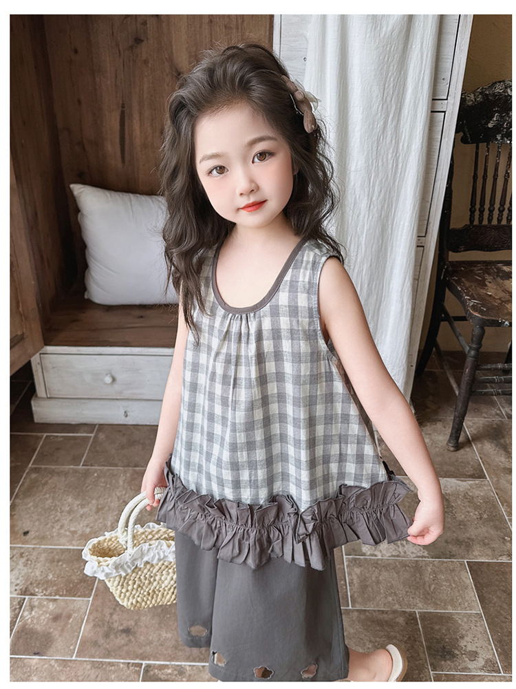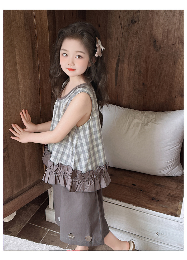 어린이 착용 한국 스타일 2025 여름 새 소녀의 격자 무늬 귀 소매 셔츠 빈 꽃 넓은 다리 바지