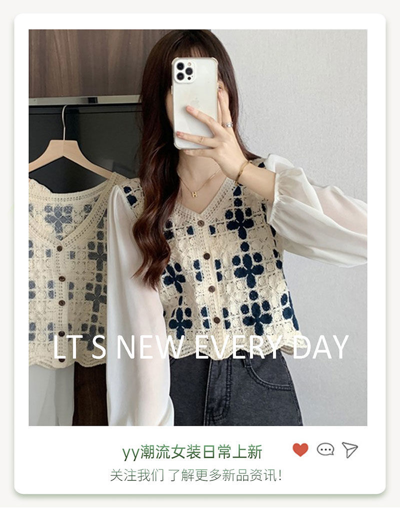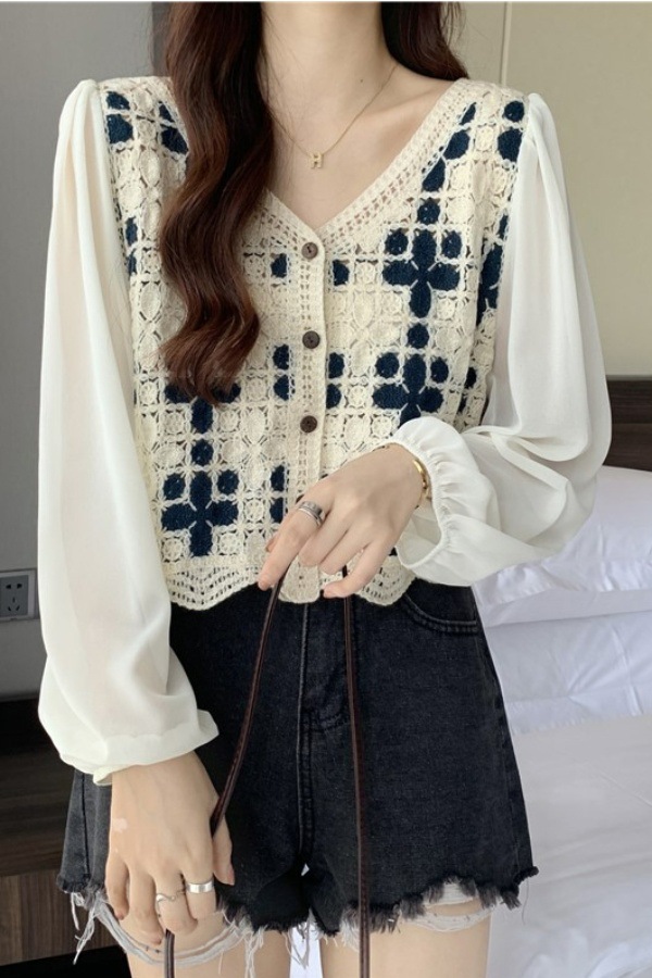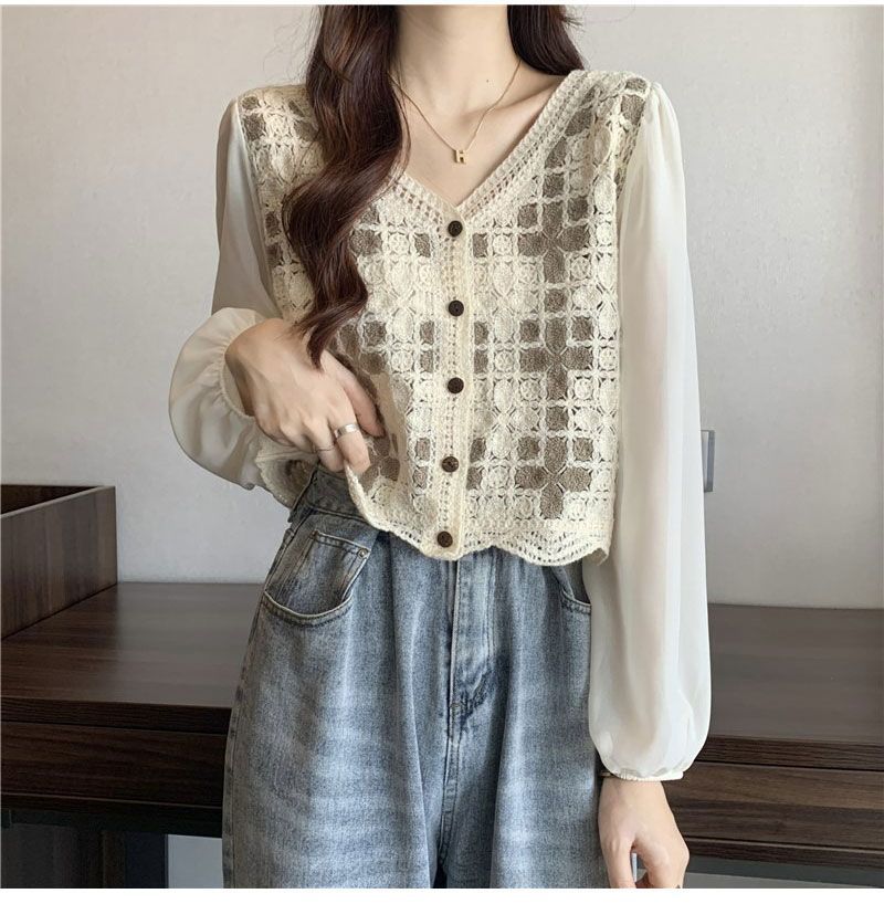 수건 자수 스플 라이스 쉬폰 중공 레이스 셔츠 2025 봄, 여름 새로운 스타일 여성을위한 세련된 긴팔 짧은 탑스토어 가기