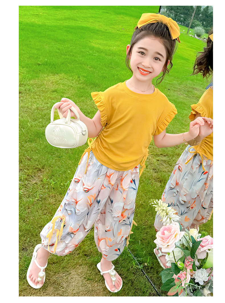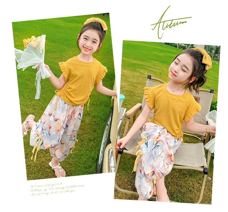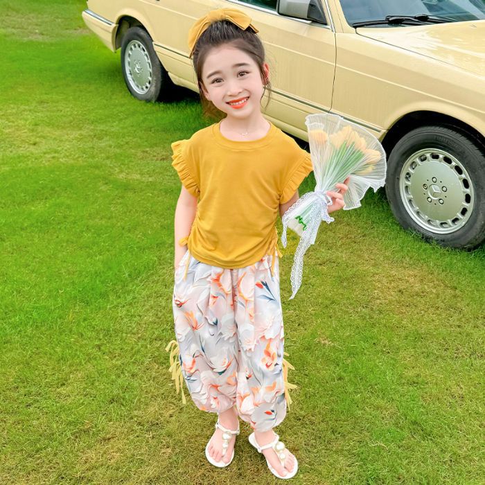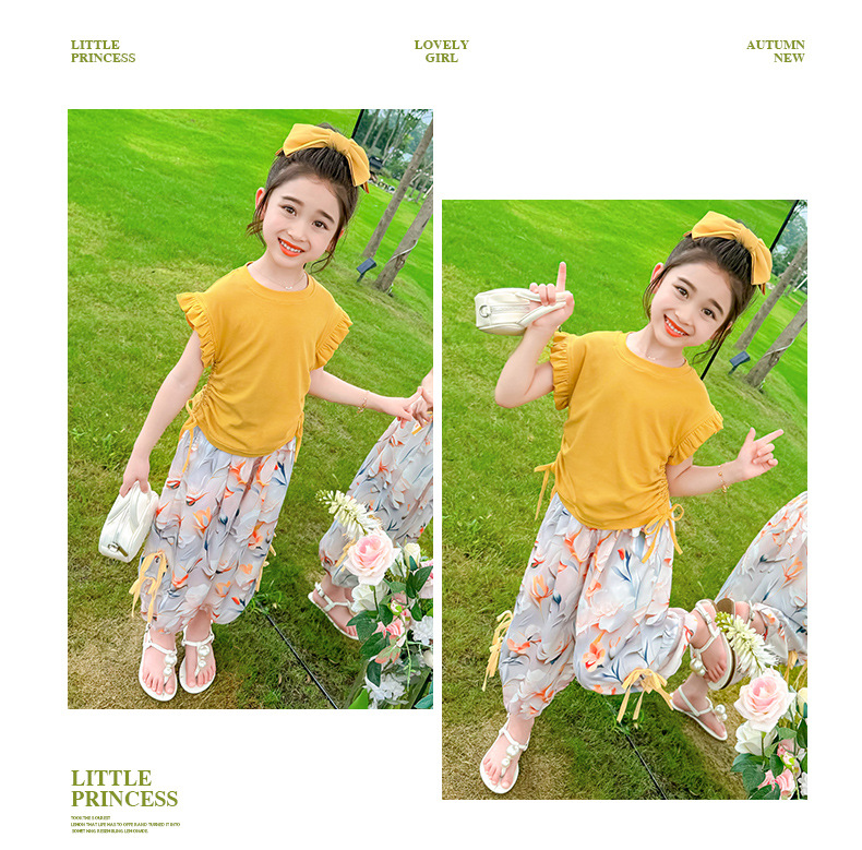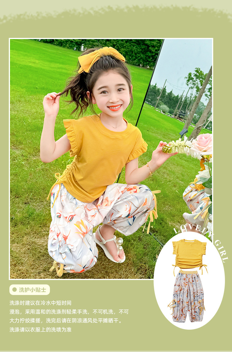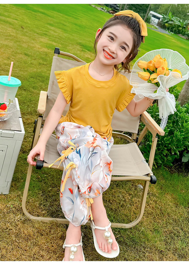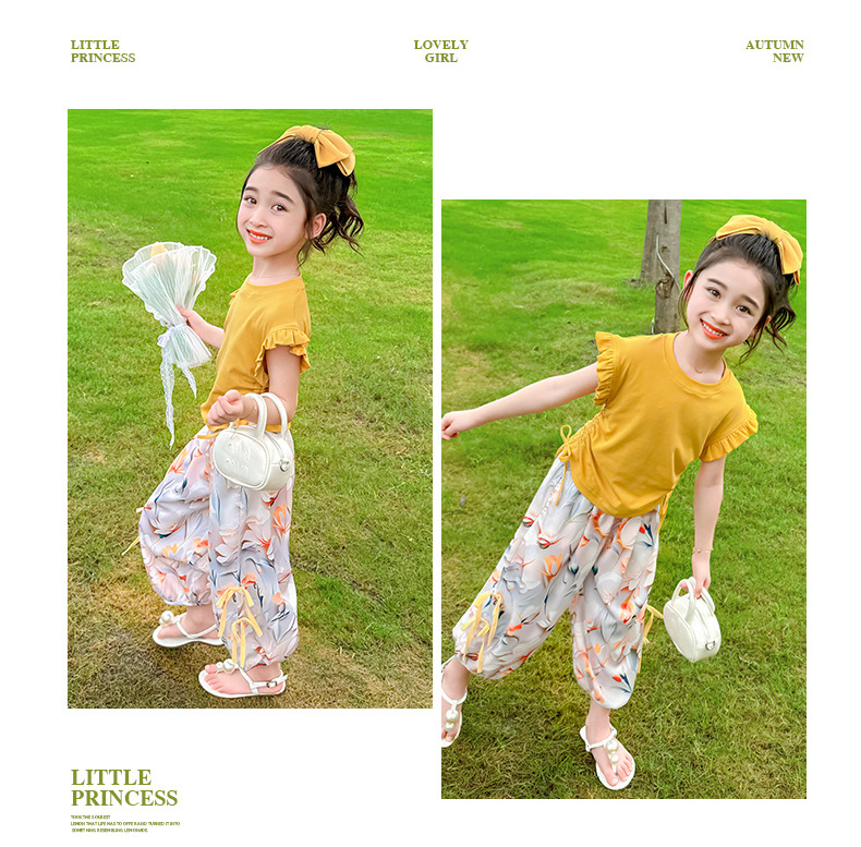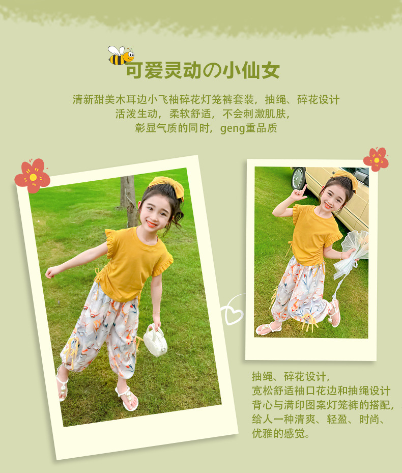 여름 소녀의 플라잉 슬리브 반팔 티셔츠 한국식 캐주얼 세트 꽃 방지 모기 바지 유행 얇은 다리 묶음 바지스토어 가기