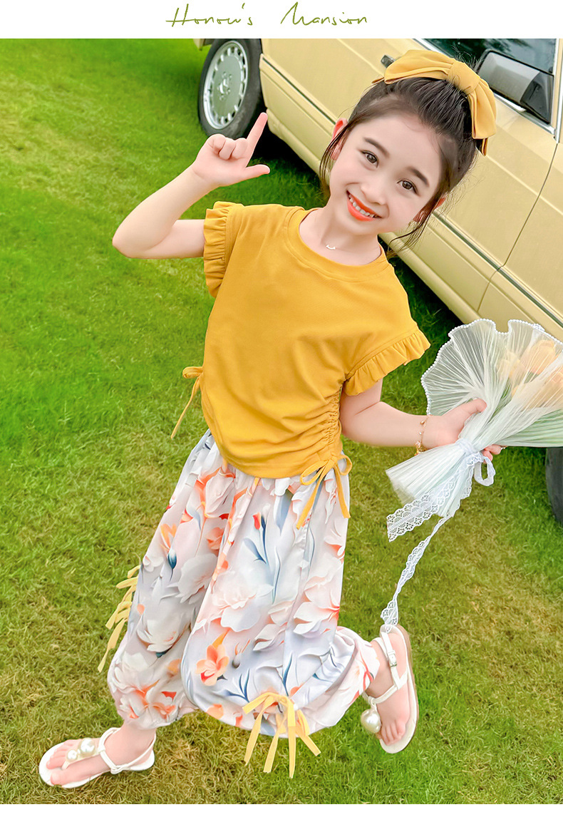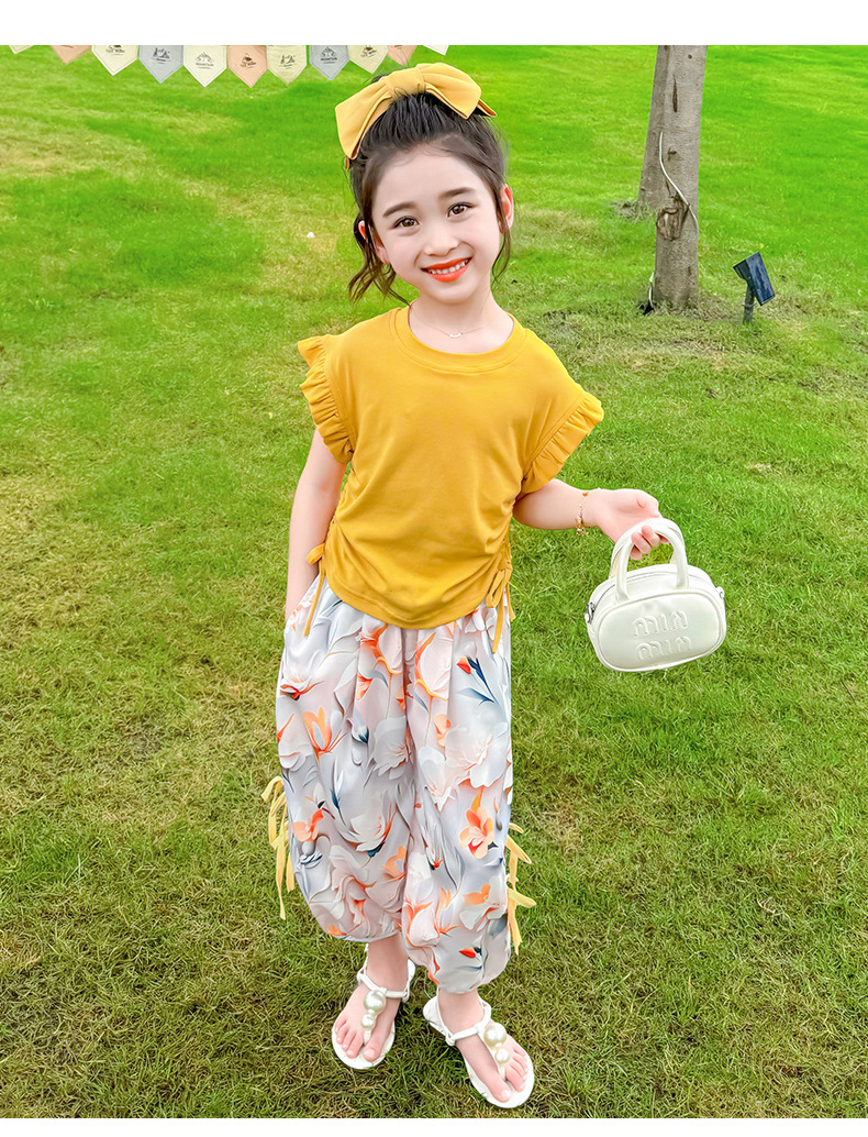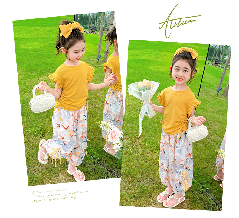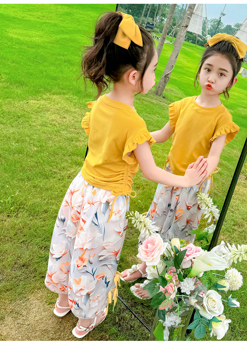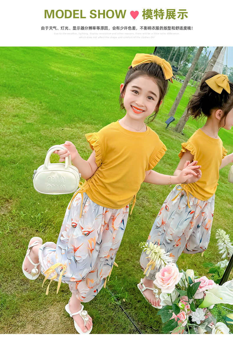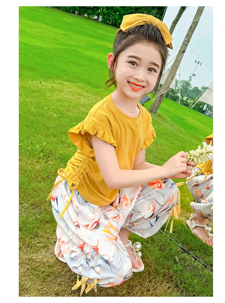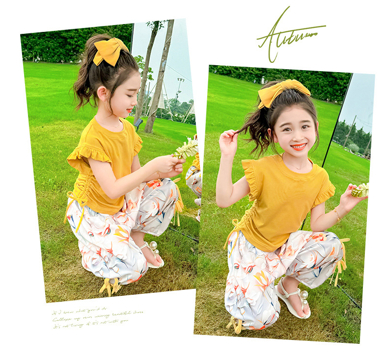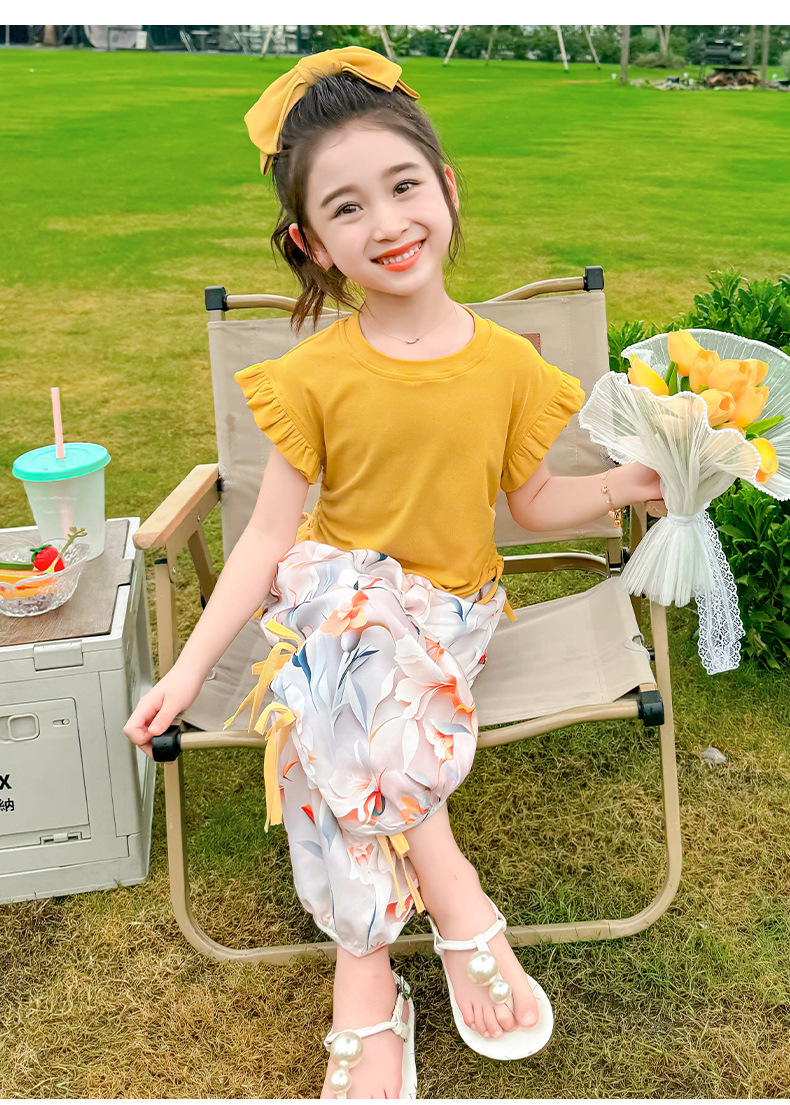여름 소녀의 플라잉 슬리브 반팔 티셔츠 한국식 캐주얼 세트 꽃 방지 모기 바지 유행 얇은 다리 묶음 바지스토어 가기
