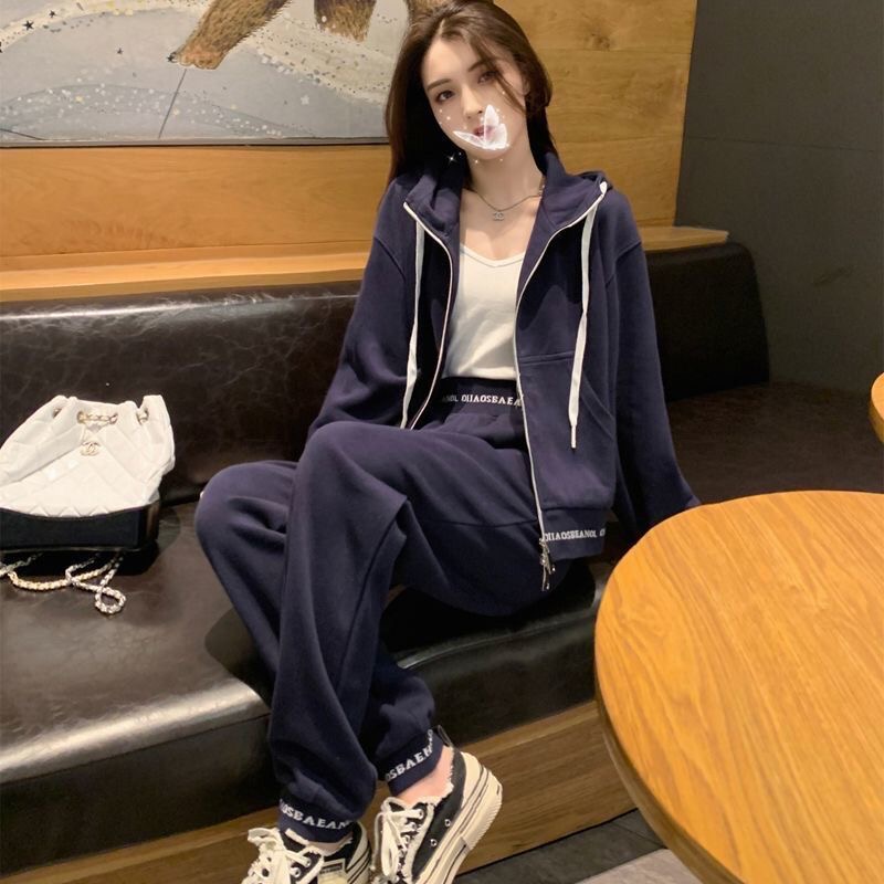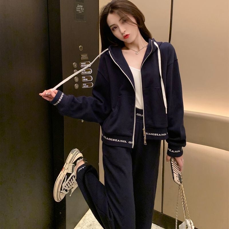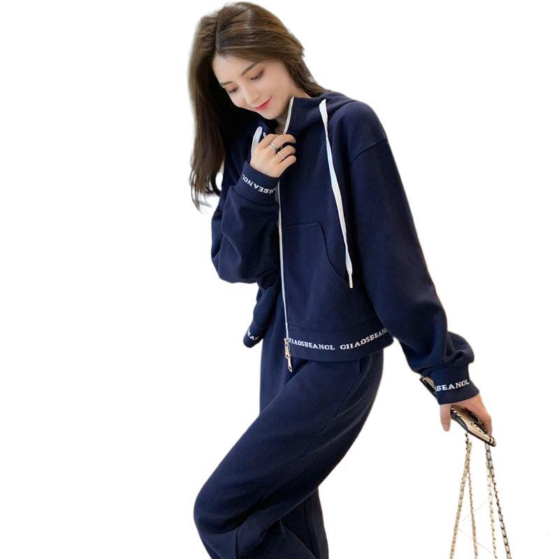 플러스 사이즈 캐주얼 스포츠 세트 여성의 봄과 가을 새로운 패션 세련된 나이 감소 후드 바지 투피스 세트 트렌디스토어 가기
