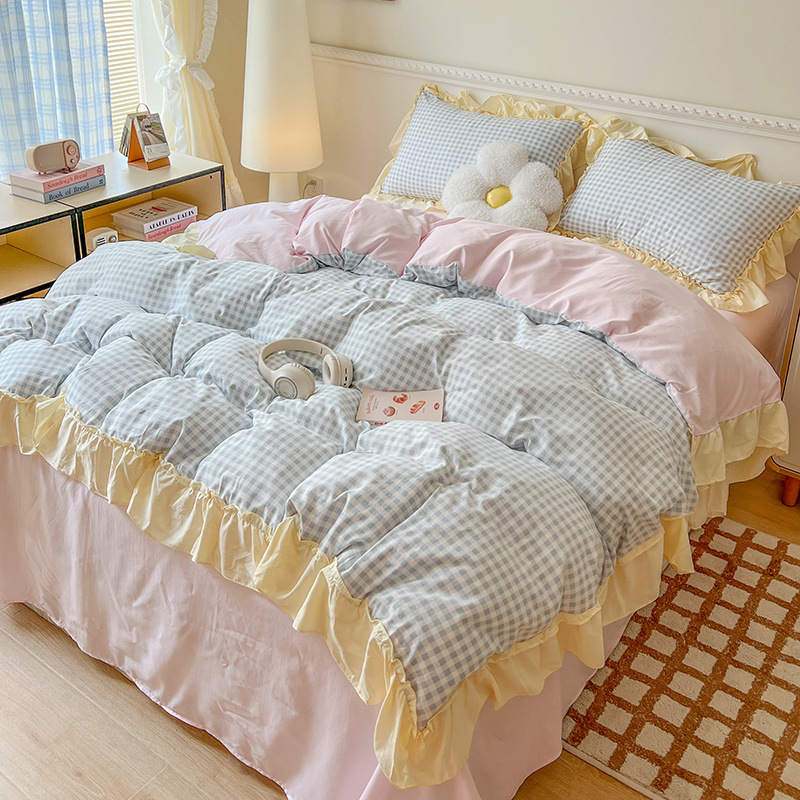 레이스 한국식 로터스 리프 워시 코튼 침대 4 피스 세트 소녀 공주 학생 기숙사 침대 시트