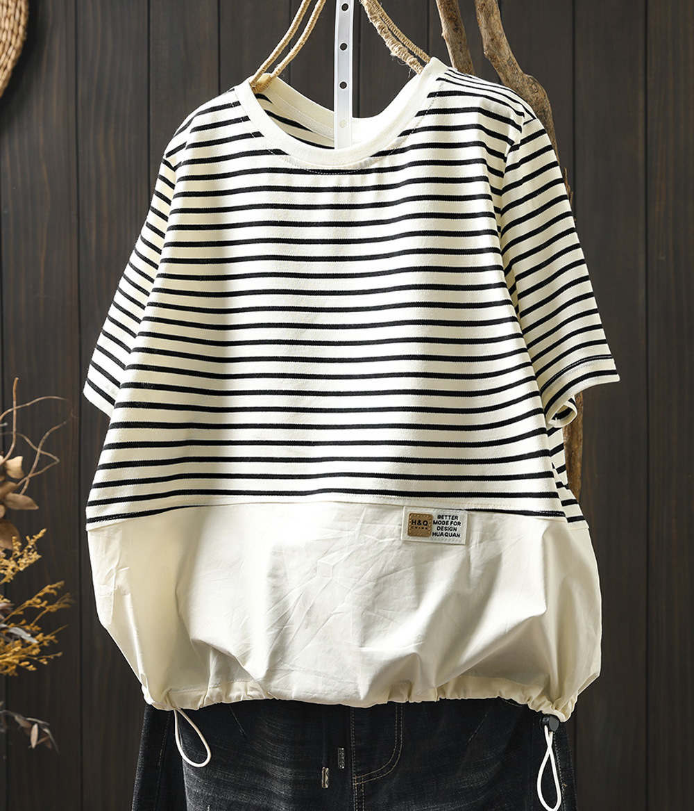 2025 년 여름 새로운 예술적 줄무늬 반팔 티셔츠 루즈 슬리밍 올 매치 캐주얼 탑스토어 가기