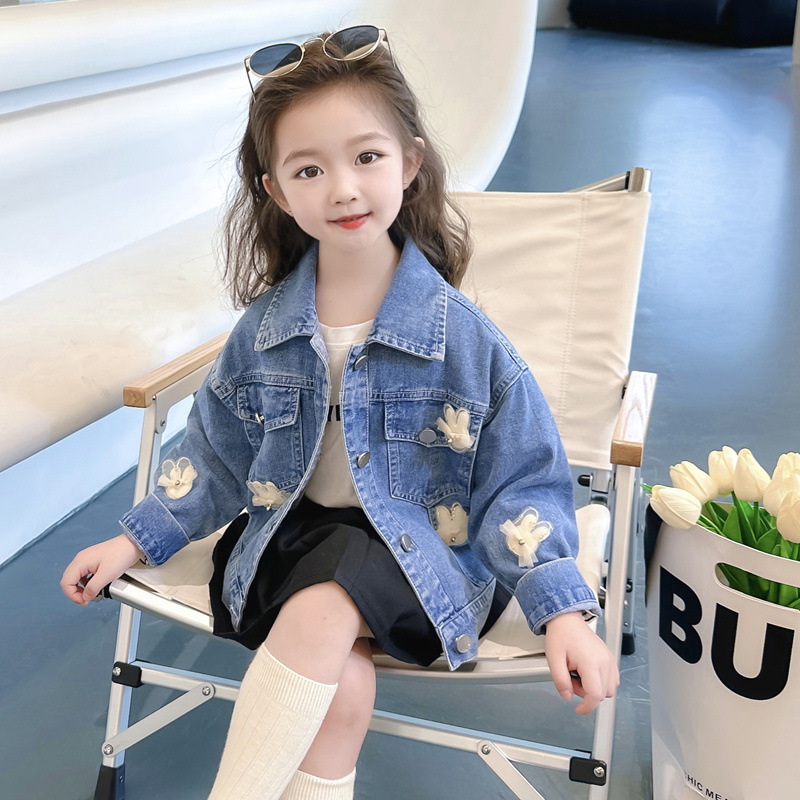 여아 데님 재킷, 세련된 자수 아기 긴팔 상의, 봄 가을 신상 네 송이 꽃 자수 재킷, 표준 사이즈스토어 가기