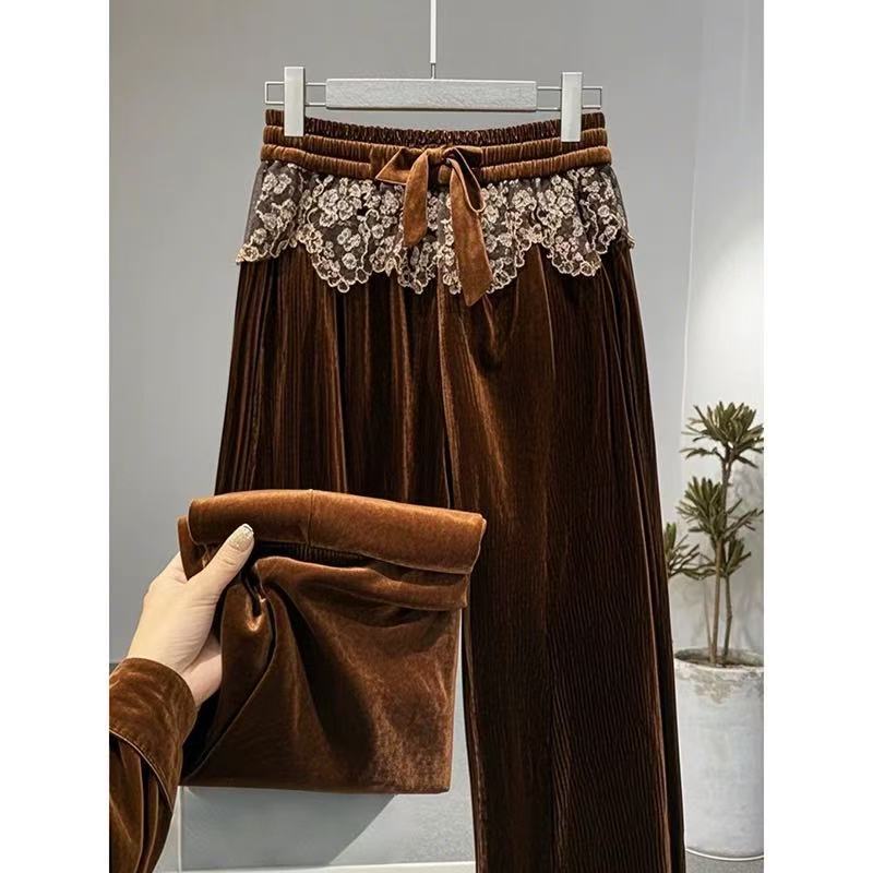 봄 넓은 다리 바지 여성용 골드 벨벳 높은 허리 넓은 다리 바지 새로운 가을 자수 스트레이트 슬림 캐주얼 바지