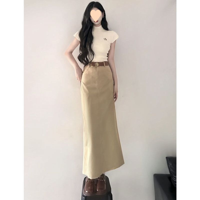순수한 욕망 스타일 둥근 목 어깨 셔츠 탑 세트 여성 여름 슬림핏 높은 허리 스커트 슬리밍 롱 스커트 투피스 세트