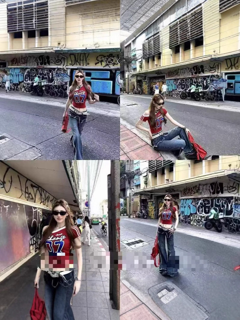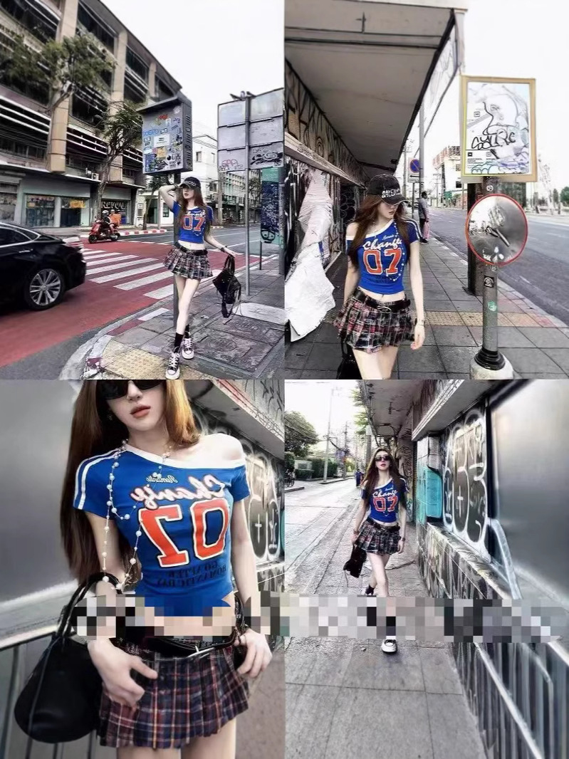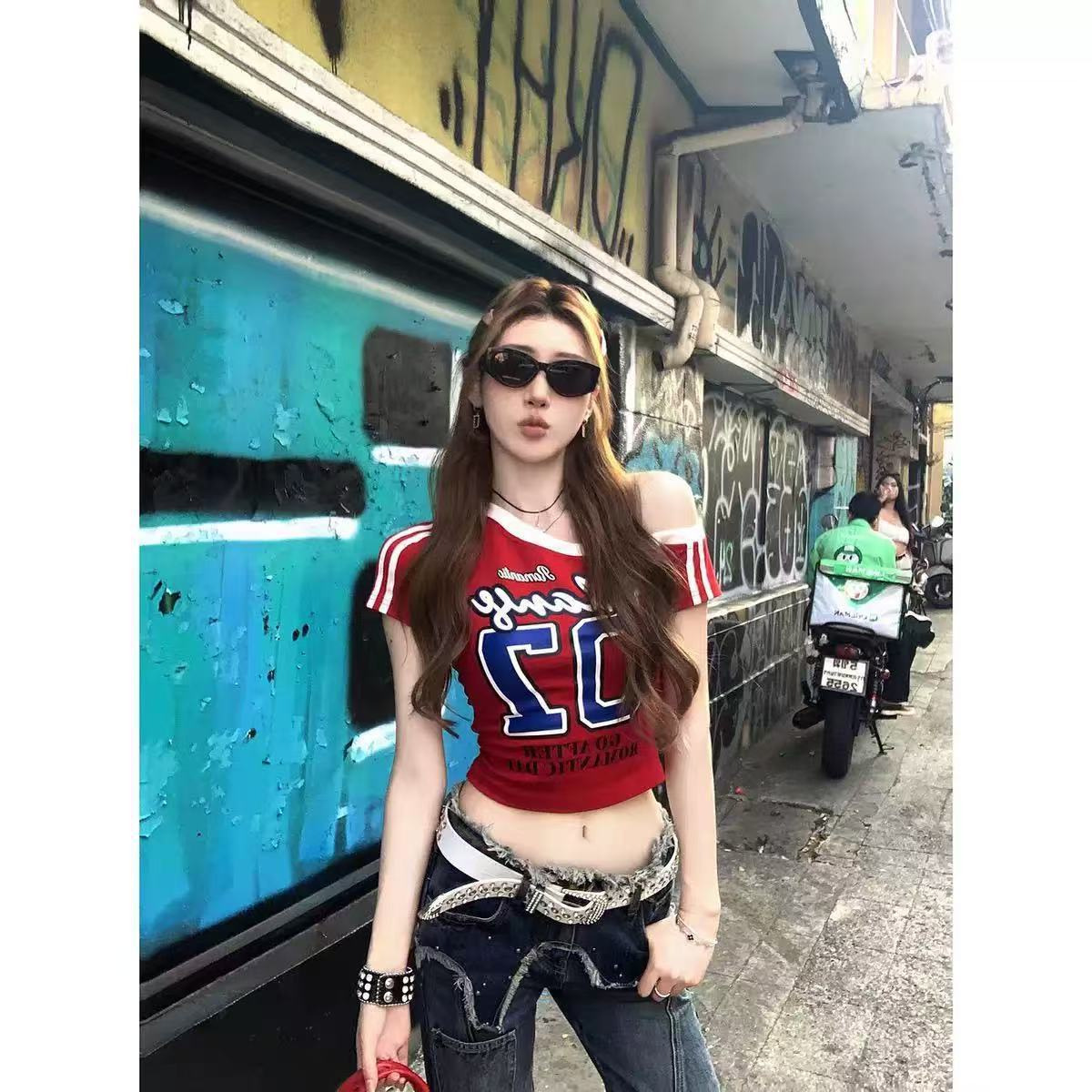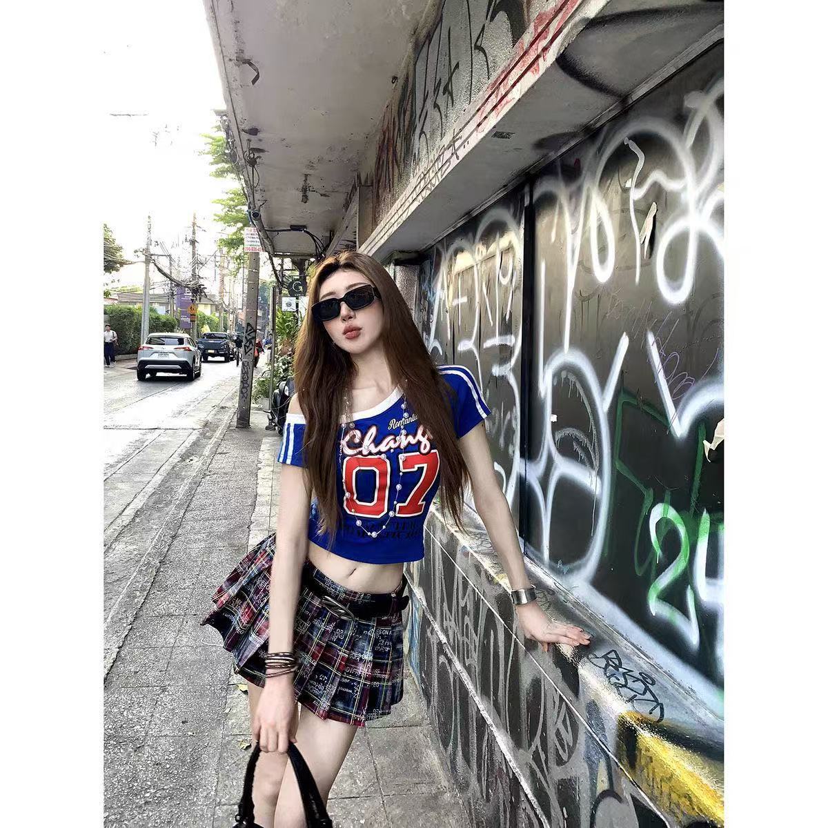 아메리칸 스타일 숄더 프린트 티셔츠 여성 여름 새로운 슬림 핏 슬리밍 스파이스 걸스 니치 칙 올매치 탑 반팔 Ins