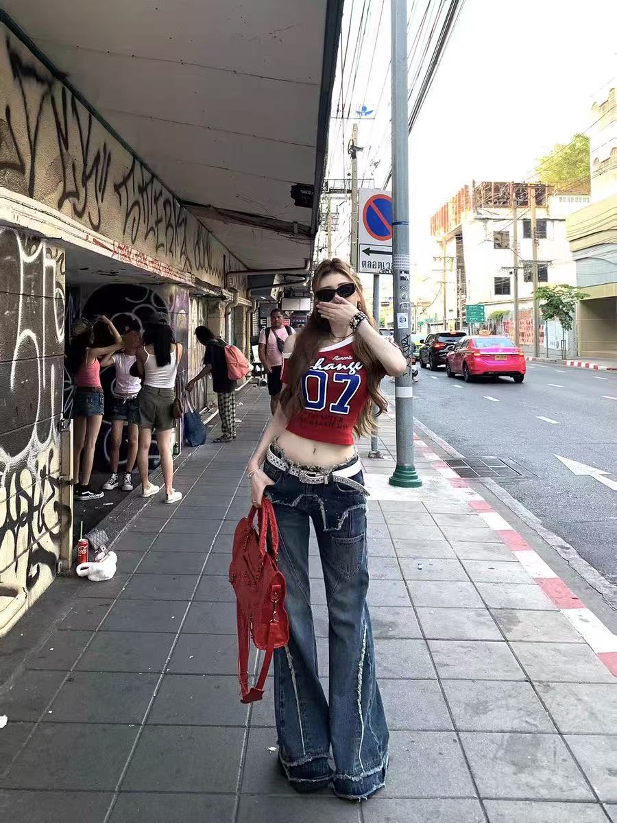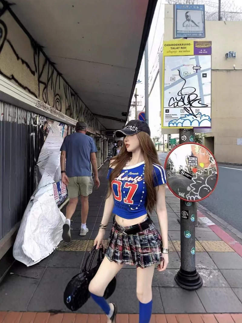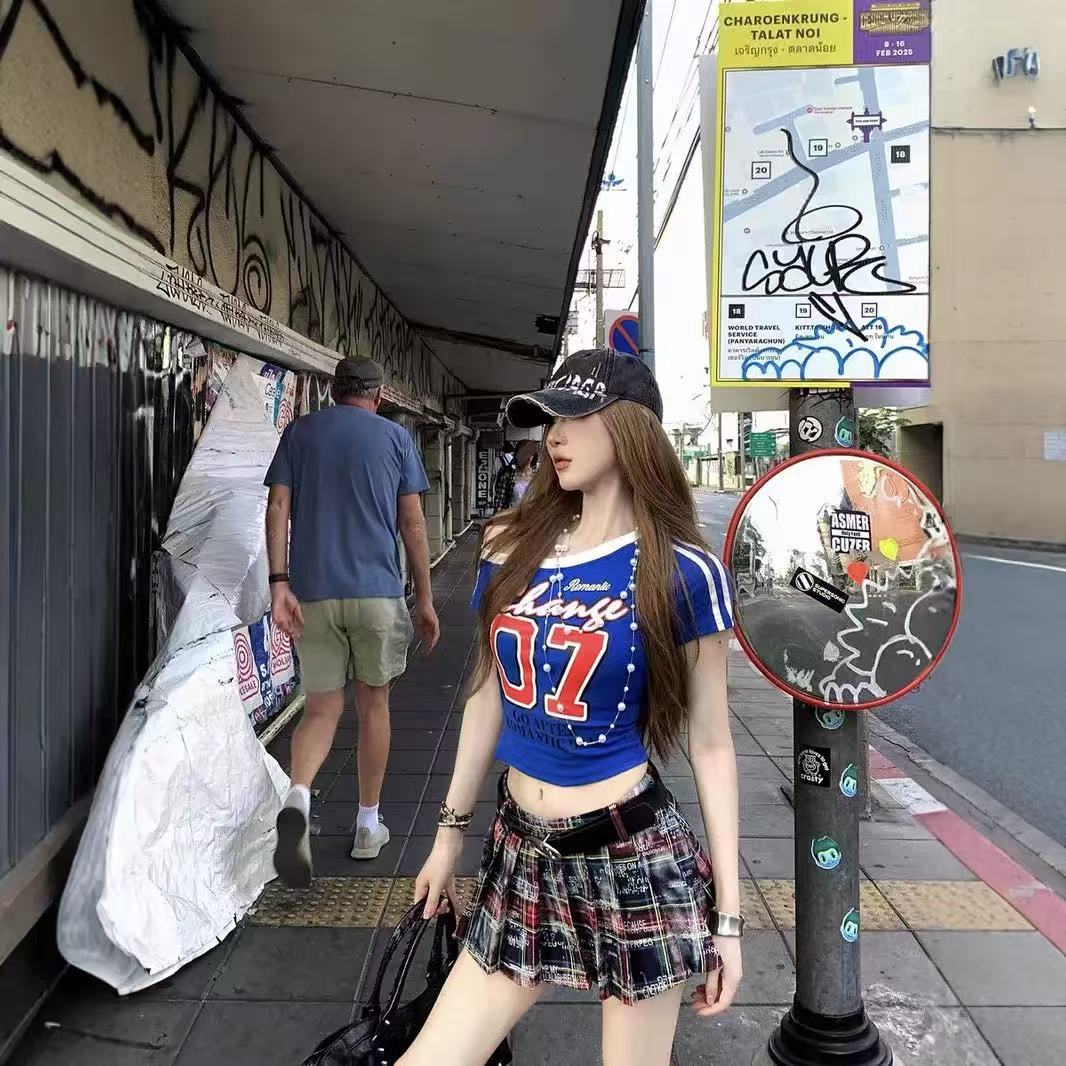 아메리칸 스타일 숄더 프린트 티셔츠 여성 여름 새로운 슬림 핏 슬리밍 스파이스 걸스 니치 칙 올매치 탑 반팔 Ins스토어 가기