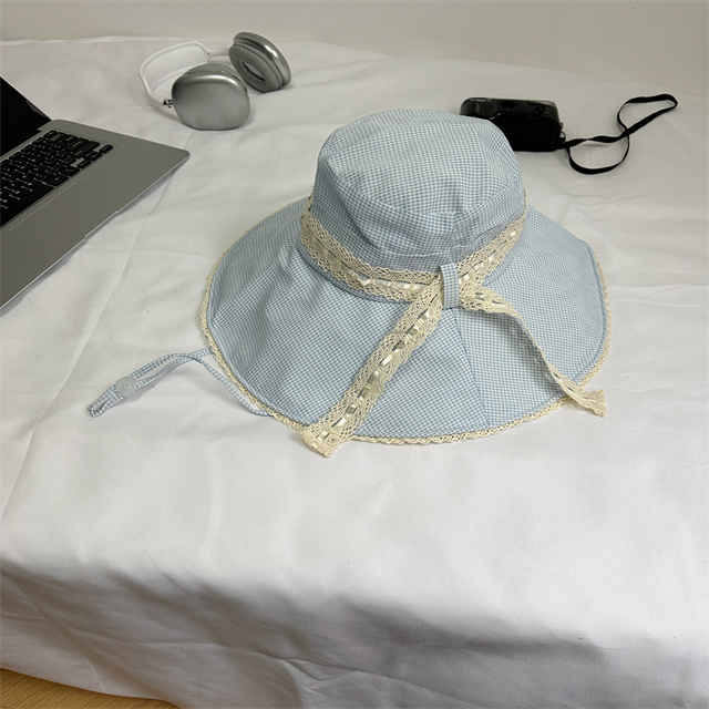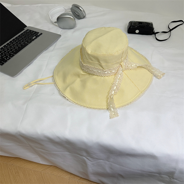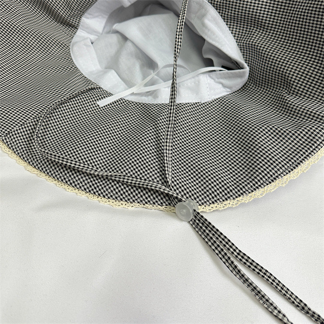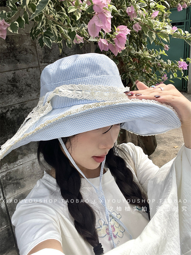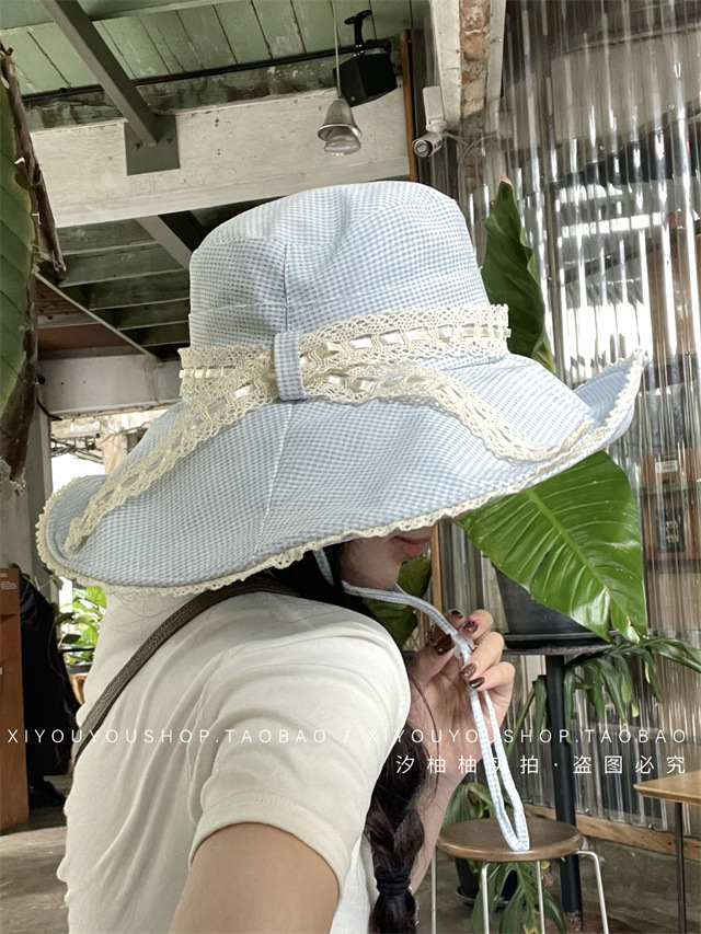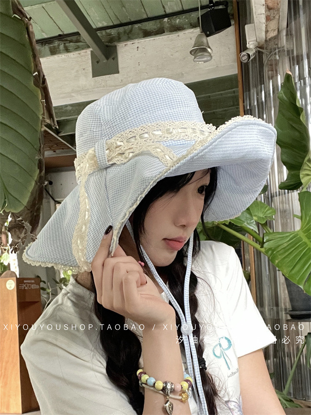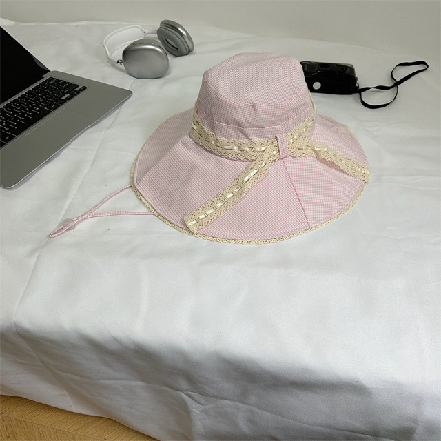 일본 스위트 레이스 어부 모자 여성 여름 넥타이 업 격자 무늬 여행 햇빛 빅 햇 브림 모자 트렌디스토어 가기