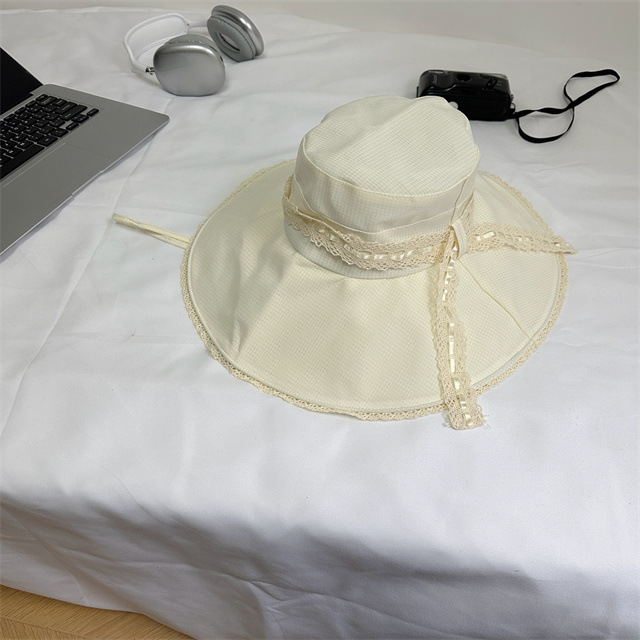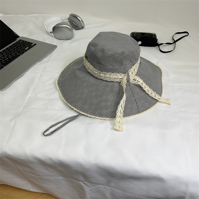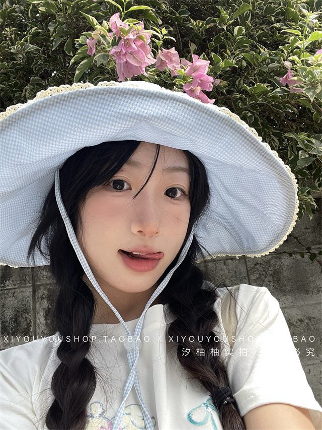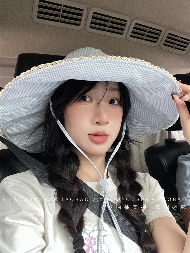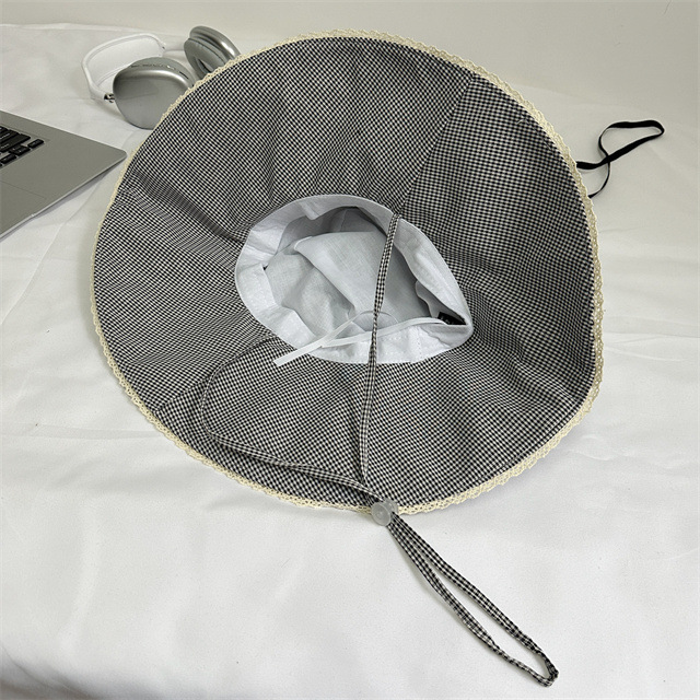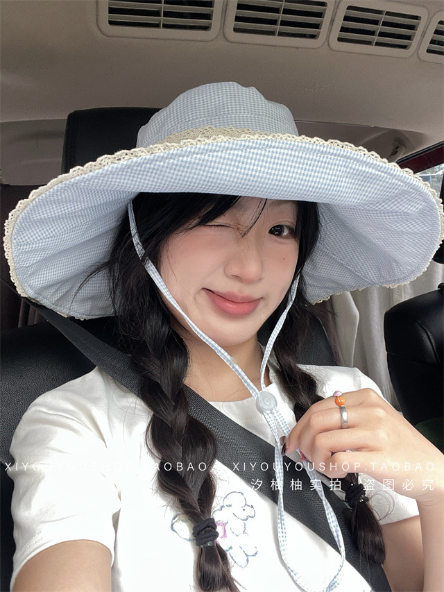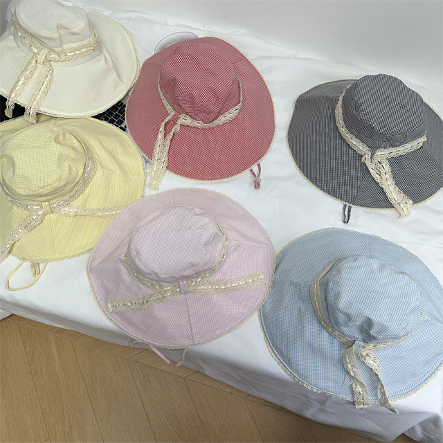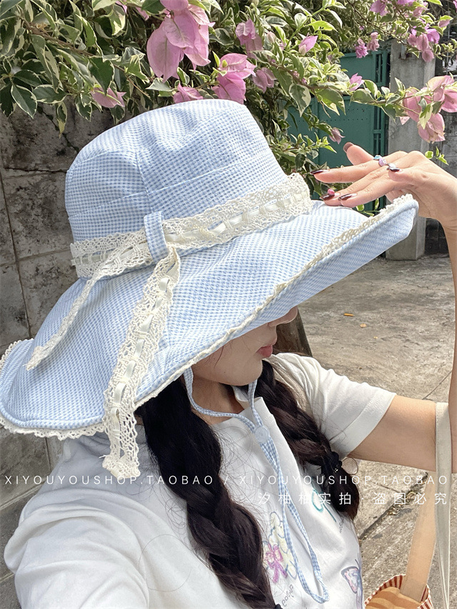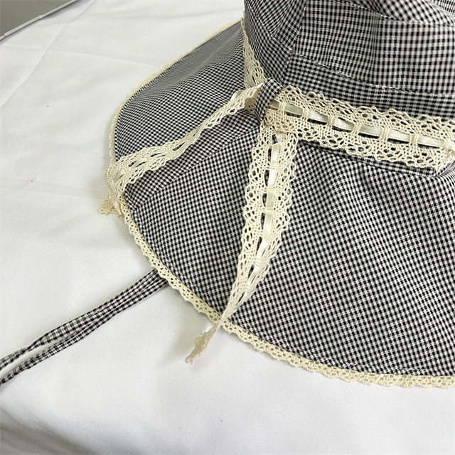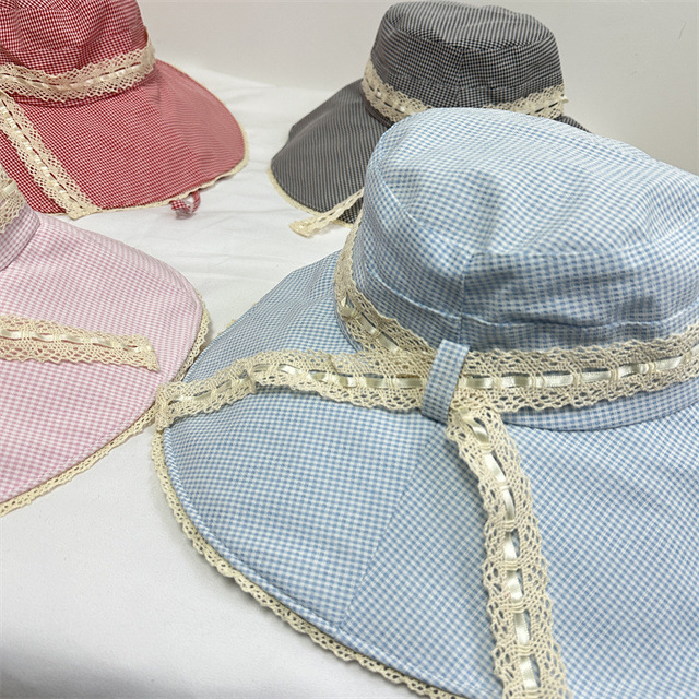 일본 스위트 레이스 어부 모자 여성 여름 넥타이 업 격자 무늬 여행 햇빛 빅 햇 브림 모자 트렌디