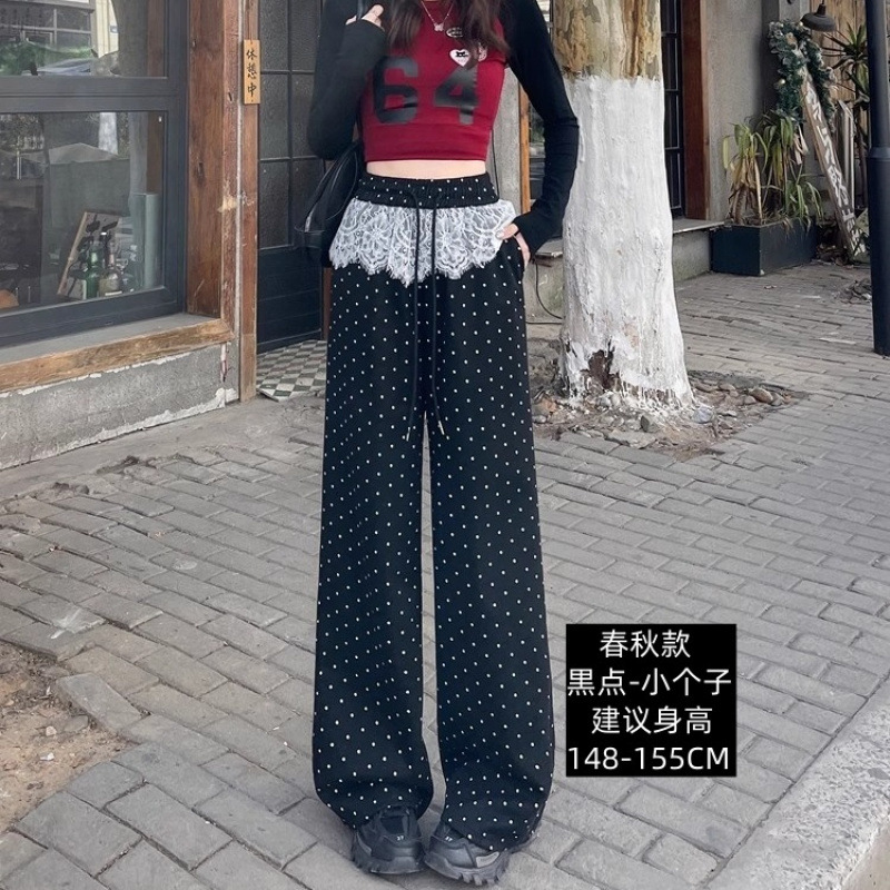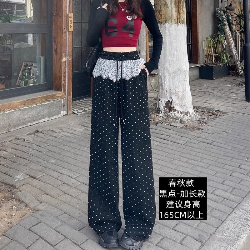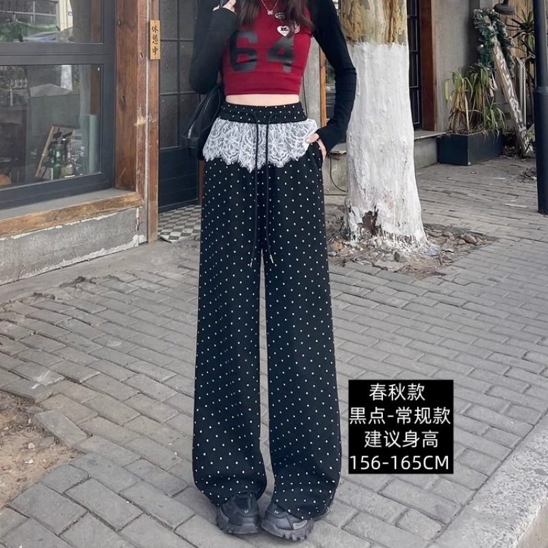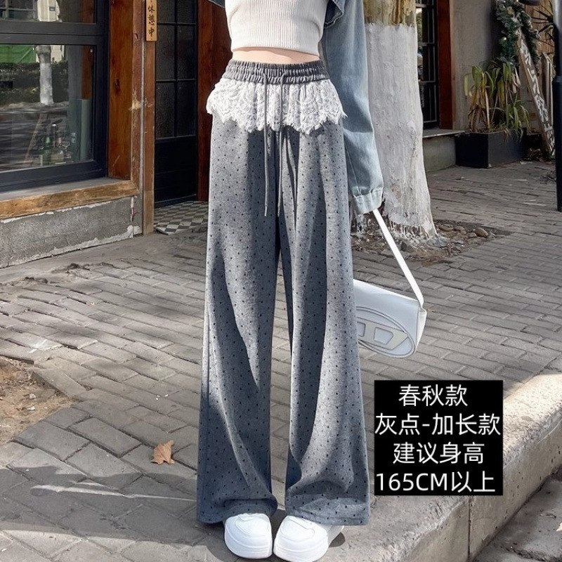 여성 레이스 폴리 즈 포인트 스트레이트 캐주얼 바지 2025 봄 새로운 도착 게으른 스타일 높은 허리 슬리밍 느슨한 와이드 다리 바지