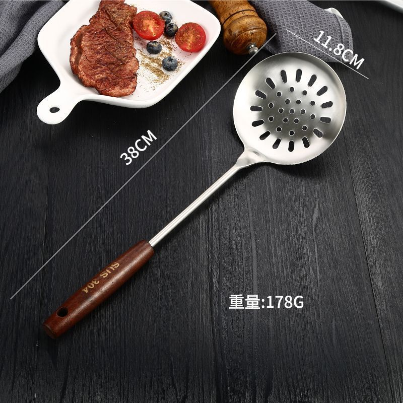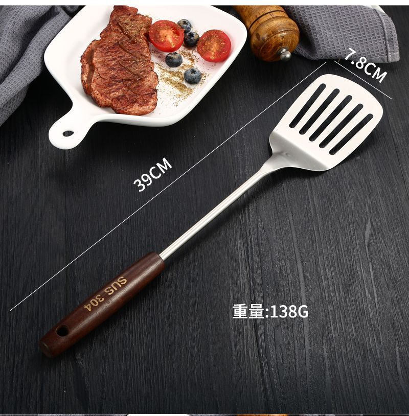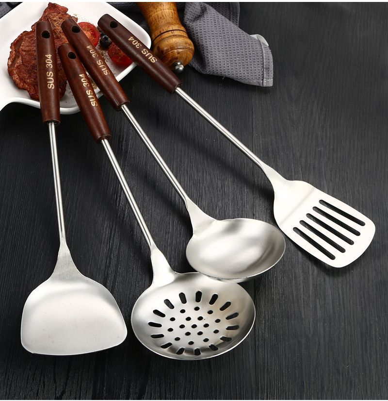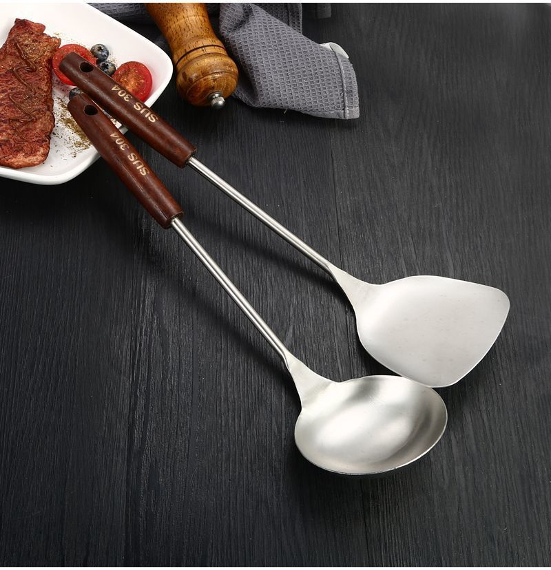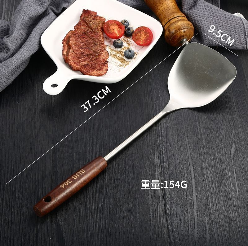 304 스테인레스 스틸 냄비 삽 가정용 주방 프라이팬 스푼 두꺼운 철 프라이팬 삽 색소 나무 손잡이 안티 스케일링 주방용품 세트
