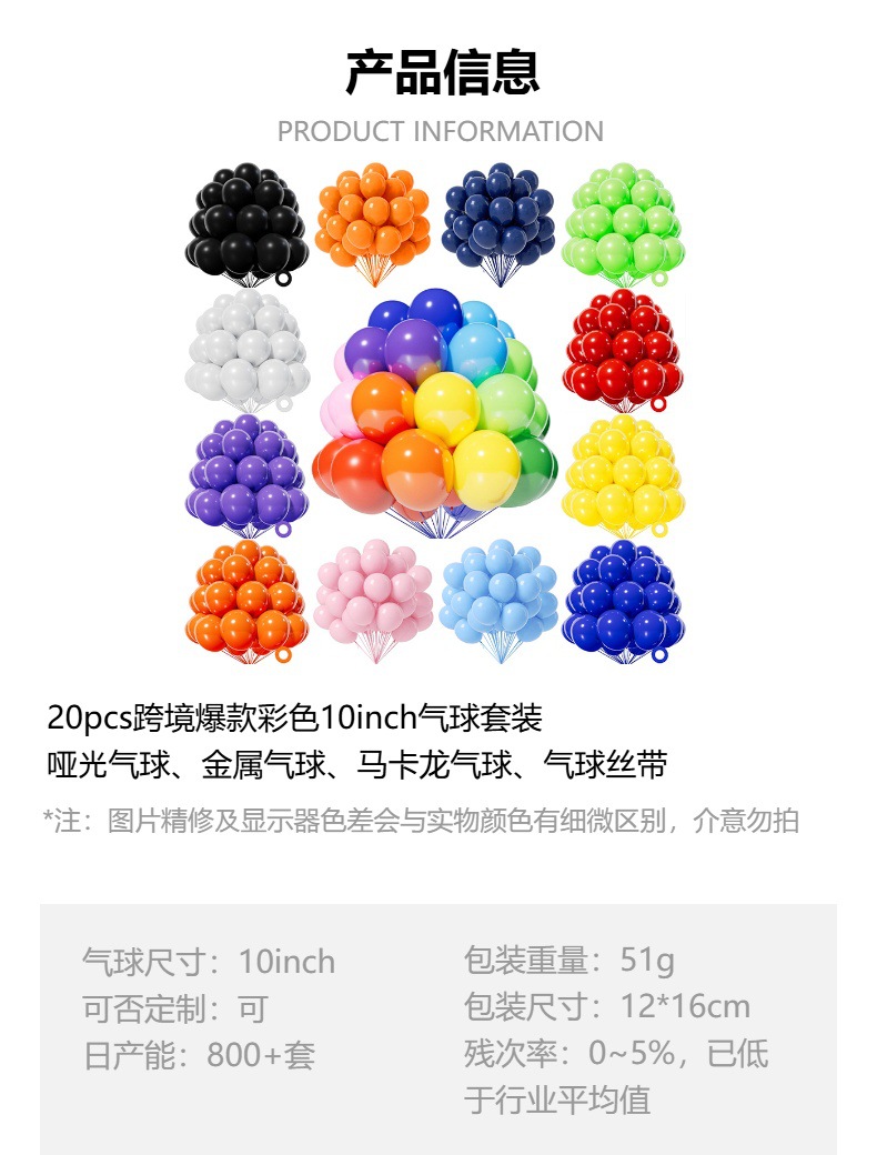 气球套装非标品!我们在接到您的订单后,才会有工人按照订单款式将气球及配件搭配、装袋,组成套装后,非产品质量问题不支持无理由退货,未经协商私自退货,我们有权予以拒绝。下单即默认同意此项约定!
