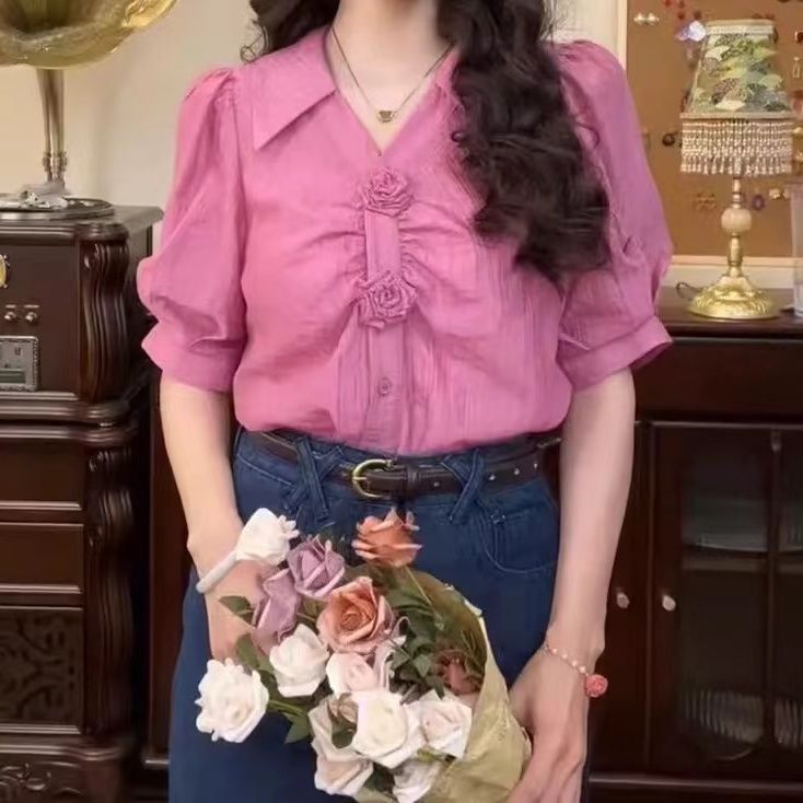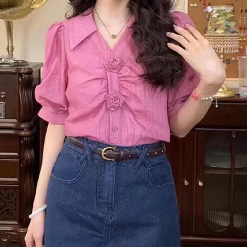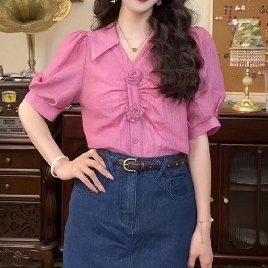 프랑스 스타일 3 차원 꽃 쉬폰 셔츠 여성의 여름 새로운 디자인 감각 루즈 한 세련된 나이 감소 우아한 탑