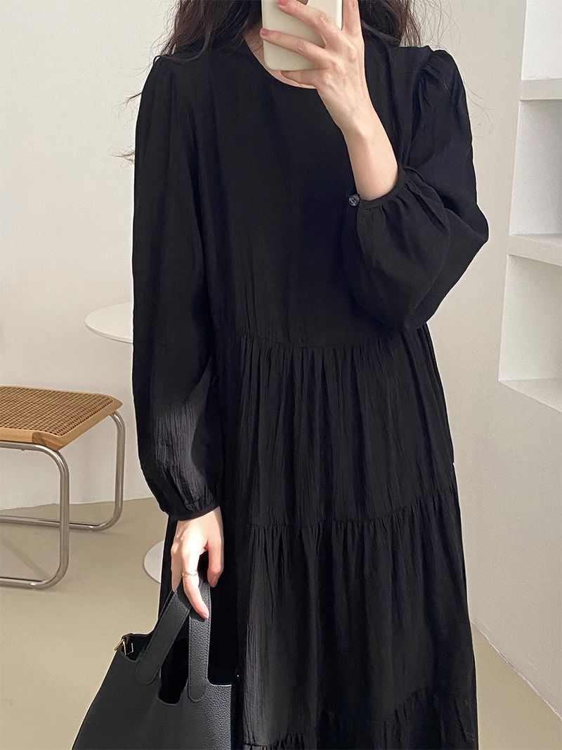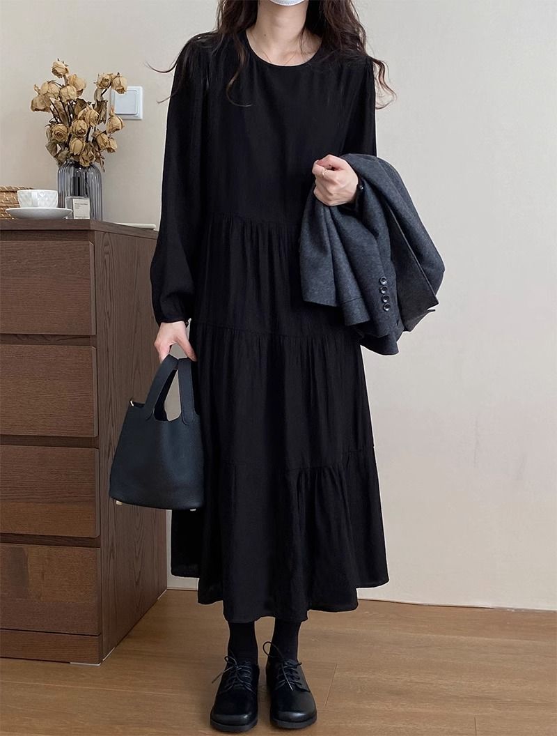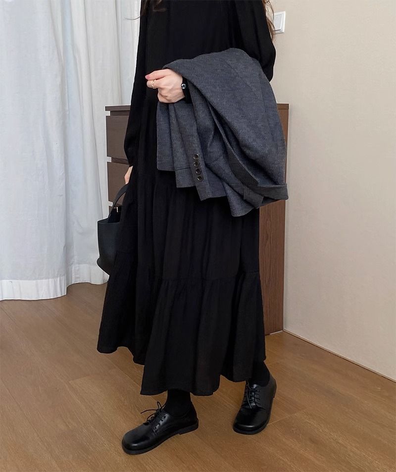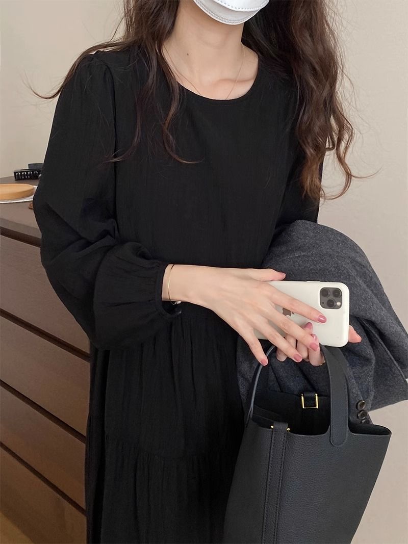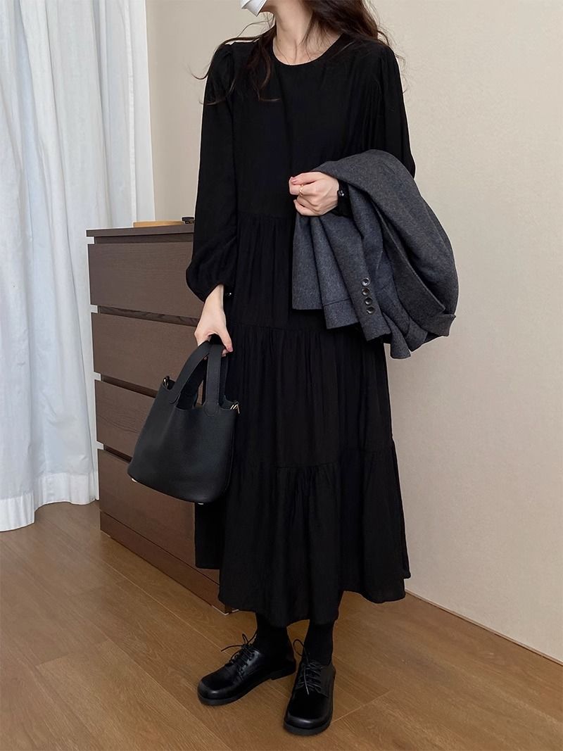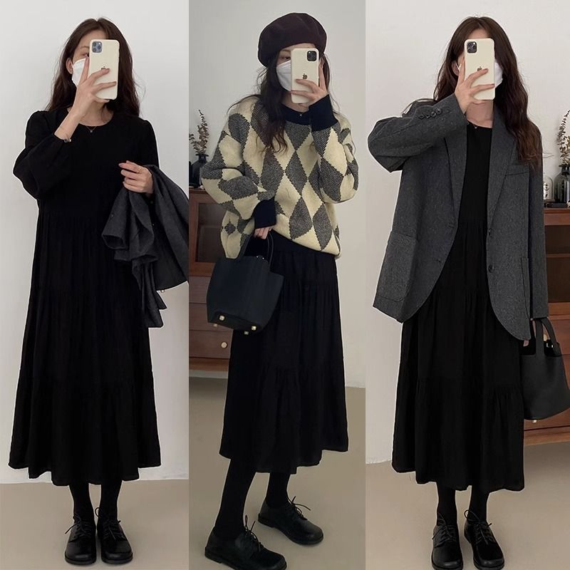약간 뚱뚱한 mm 이른 가을 긴 소매 A 자형 원피스 여성 플러스 사이즈 300kg 느슨한 슬림 기질 스티칭 무릎 길이 스커트