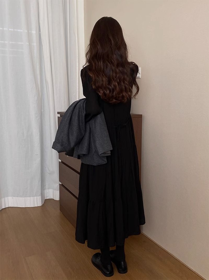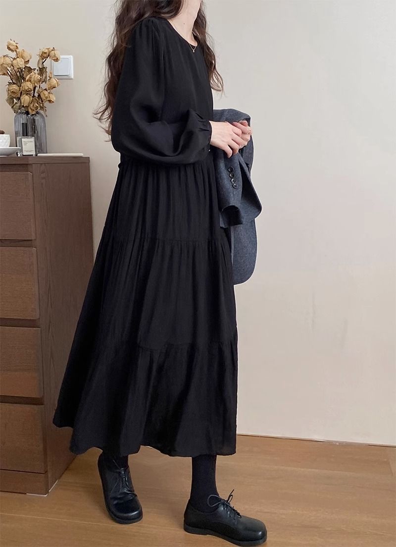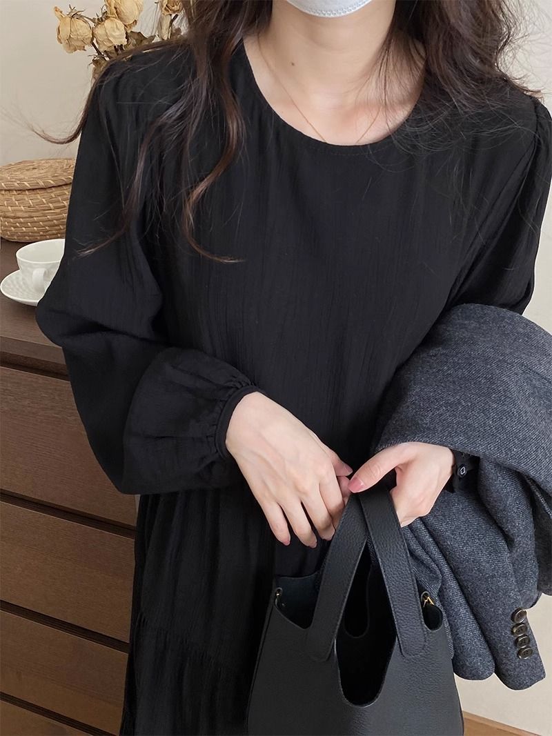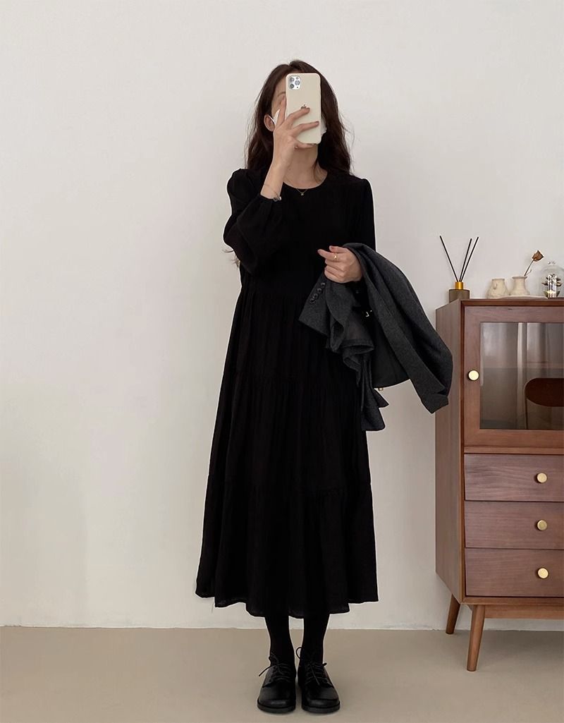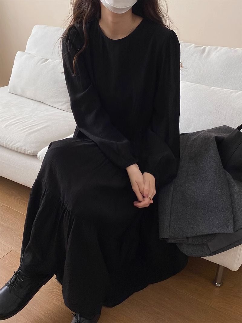 약간 뚱뚱한 mm 이른 가을 긴 소매 A 자형 원피스 여성 플러스 사이즈 300kg 느슨한 슬림 기질 스티칭 무릎 길이 스커트