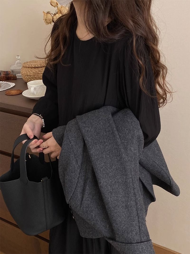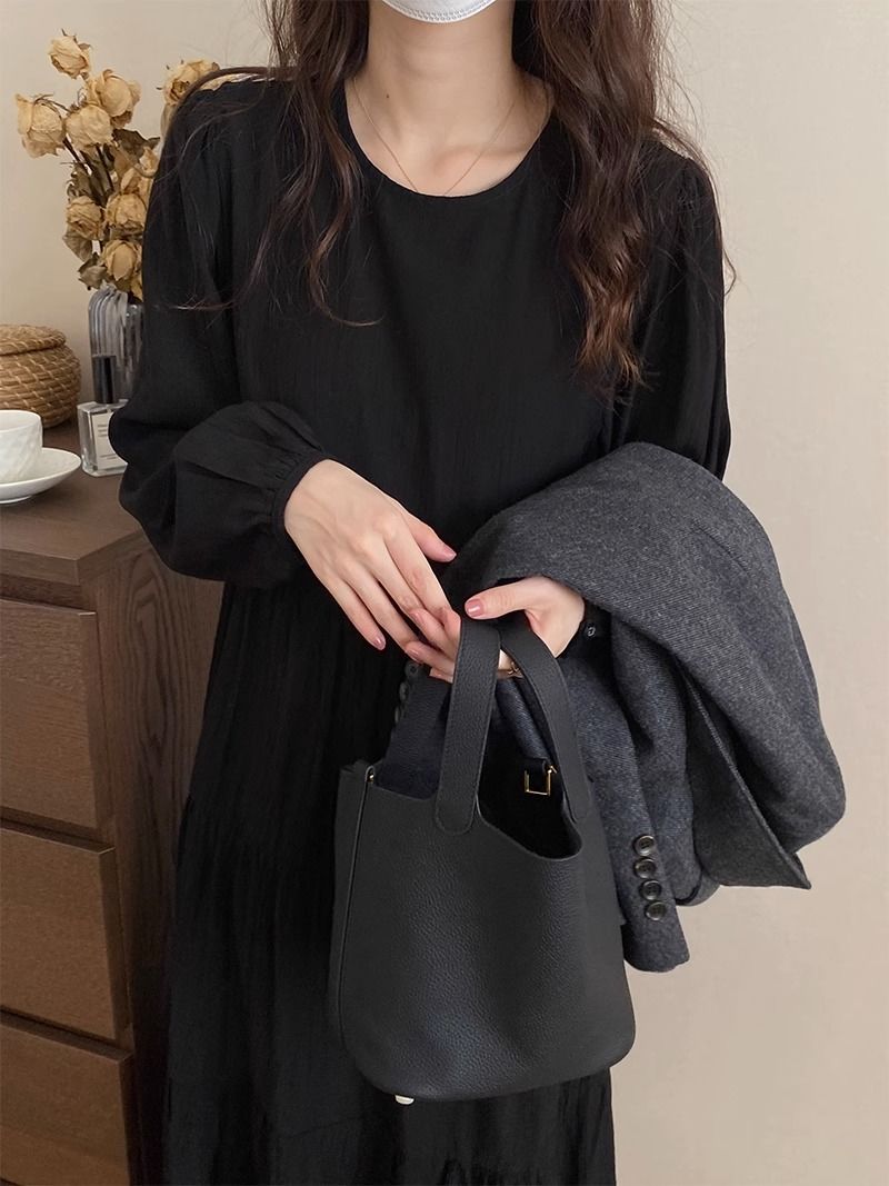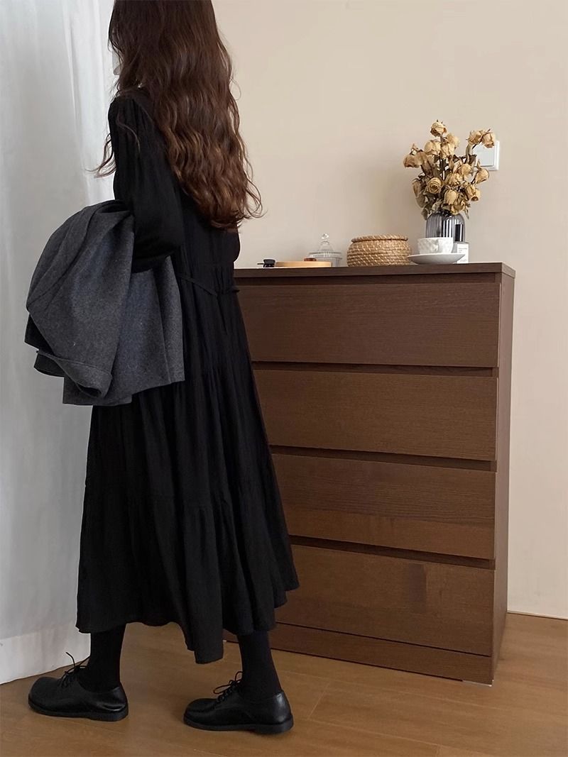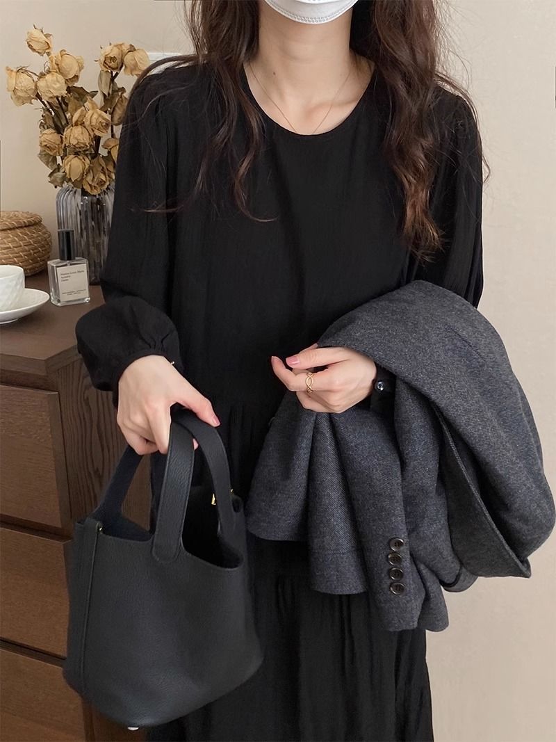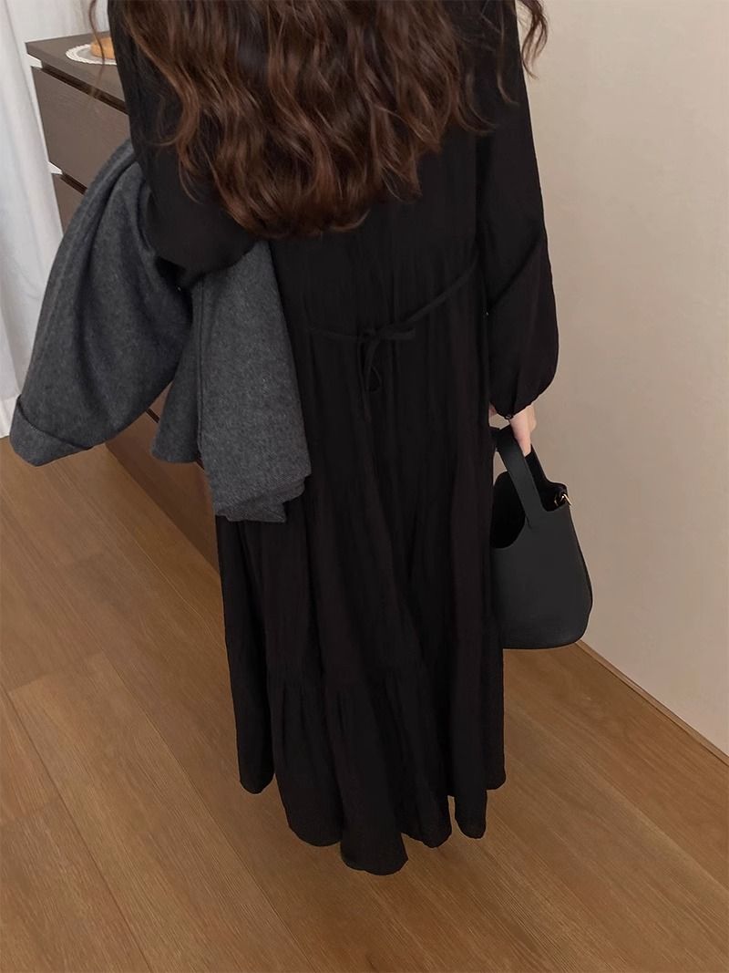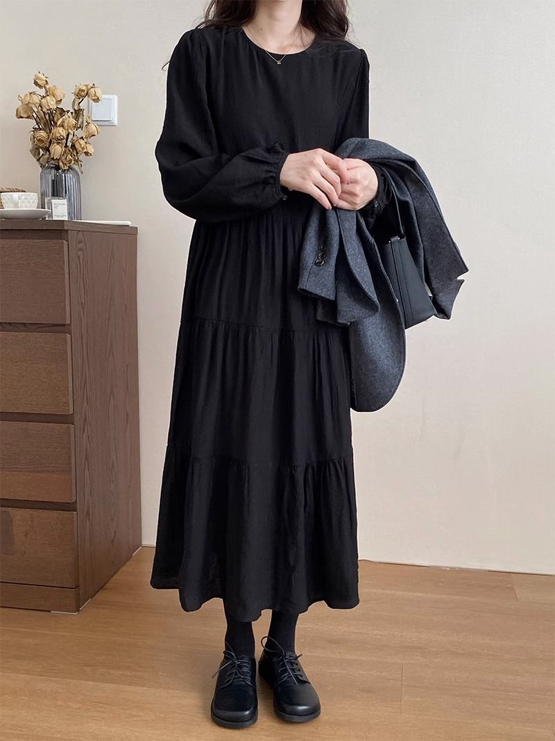 약간 뚱뚱한 mm 이른 가을 긴 소매 A 자형 원피스 여성 플러스 사이즈 300kg 느슨한 슬림 기질 스티칭 무릎 길이 스커트
