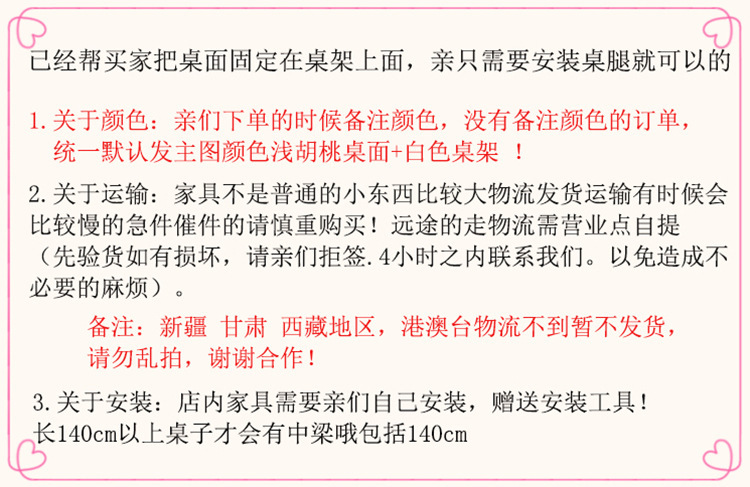 1. 海南、内蒙、甘肃、云南、贵州、西藏、新疆、青海、宁夏不包邮费(需要补运费)!注意:本品桌面厚度是1.6厘米