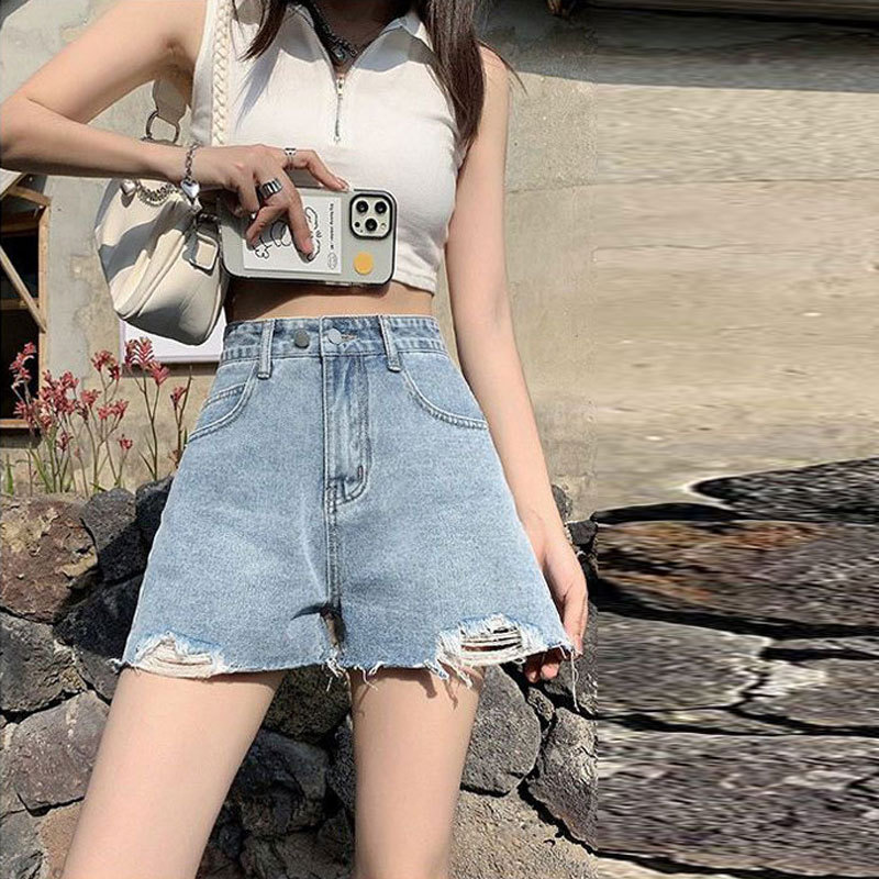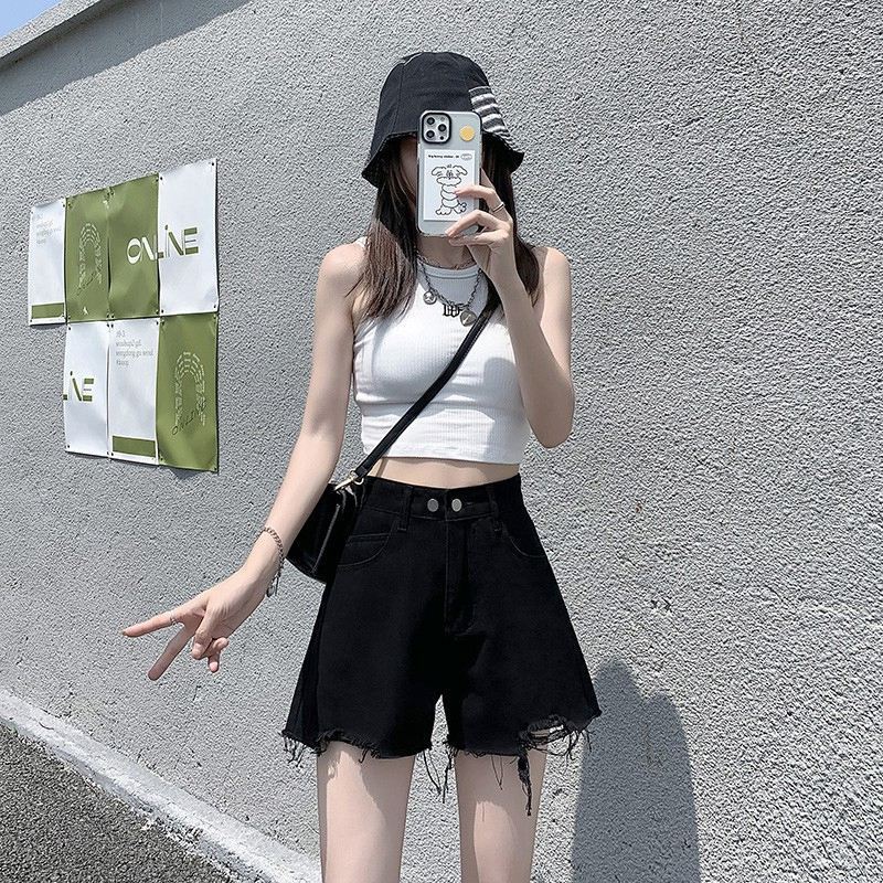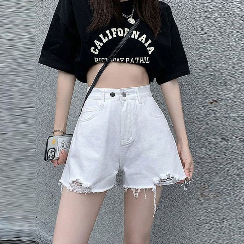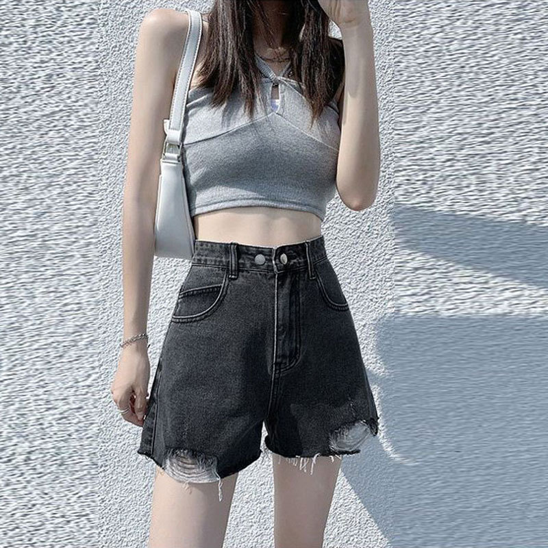 찢어진 랩 청바지 여성용 블랙 그레이 얇은 2 버튼 높은 허리 반바지 여름 핫 팬츠 하이 스트리트 인 트렌디스토어 가기