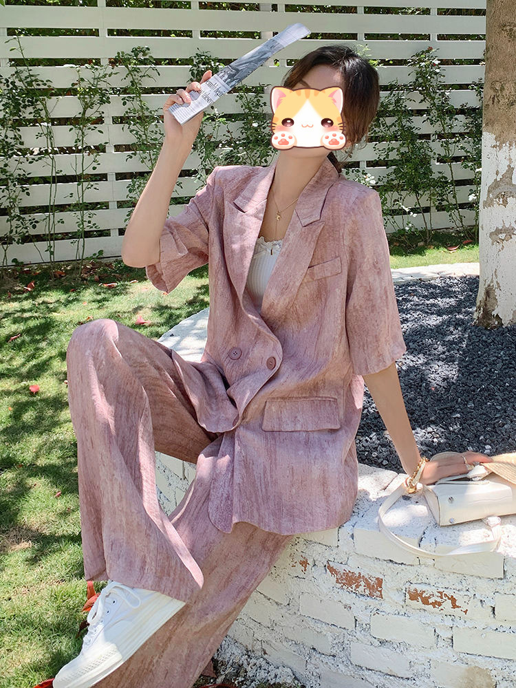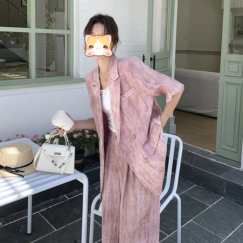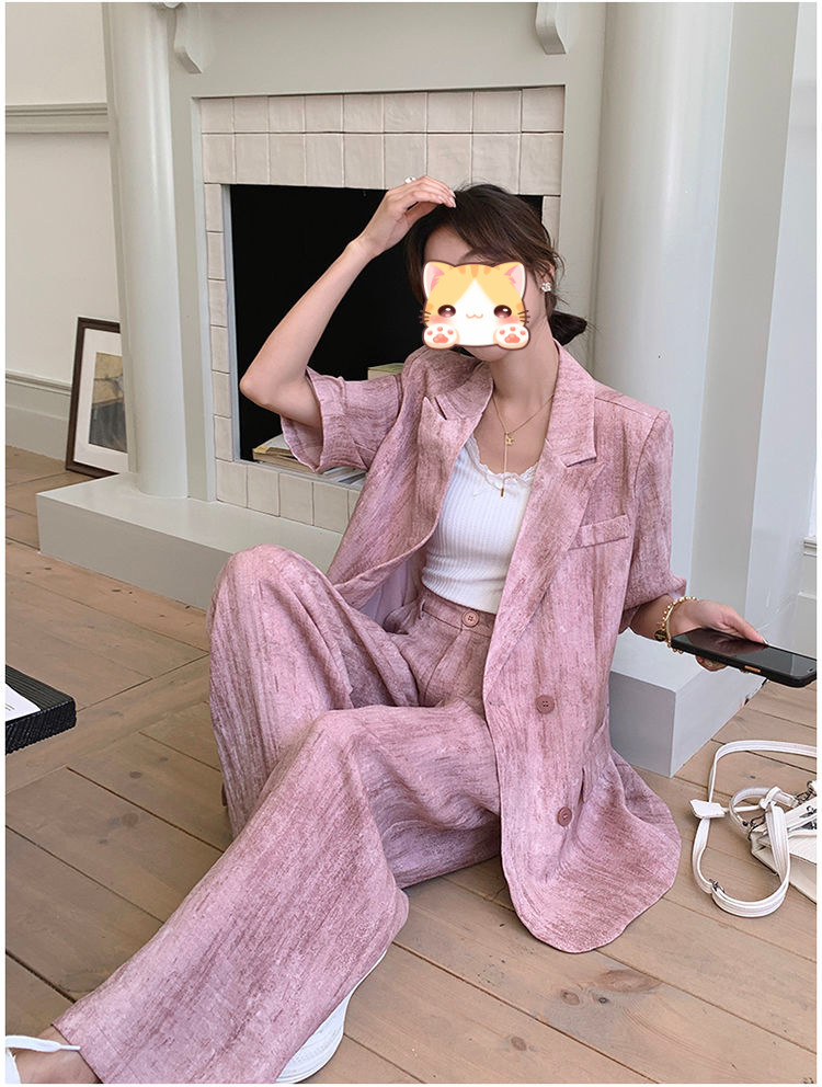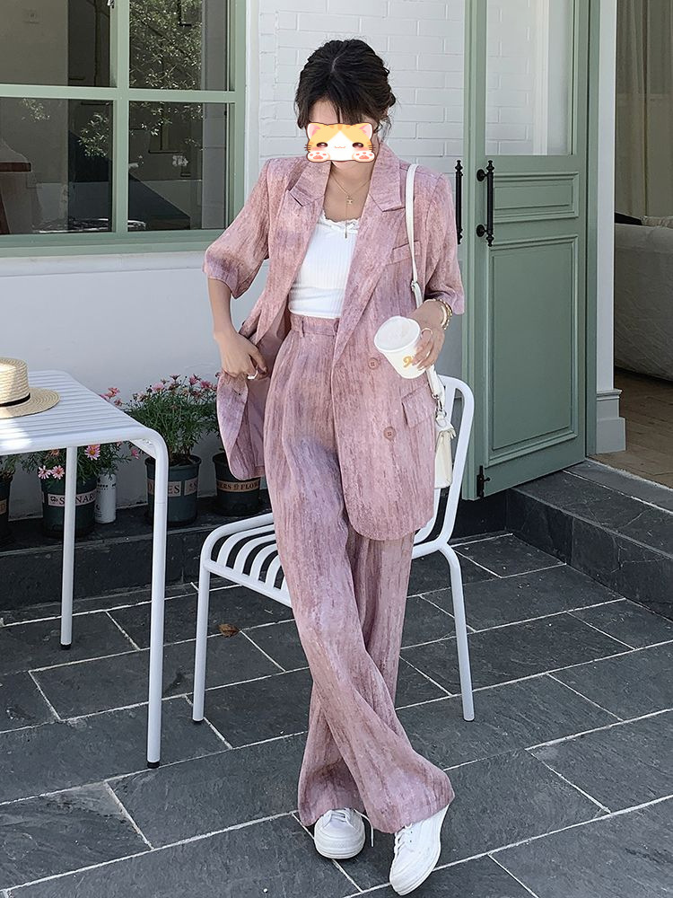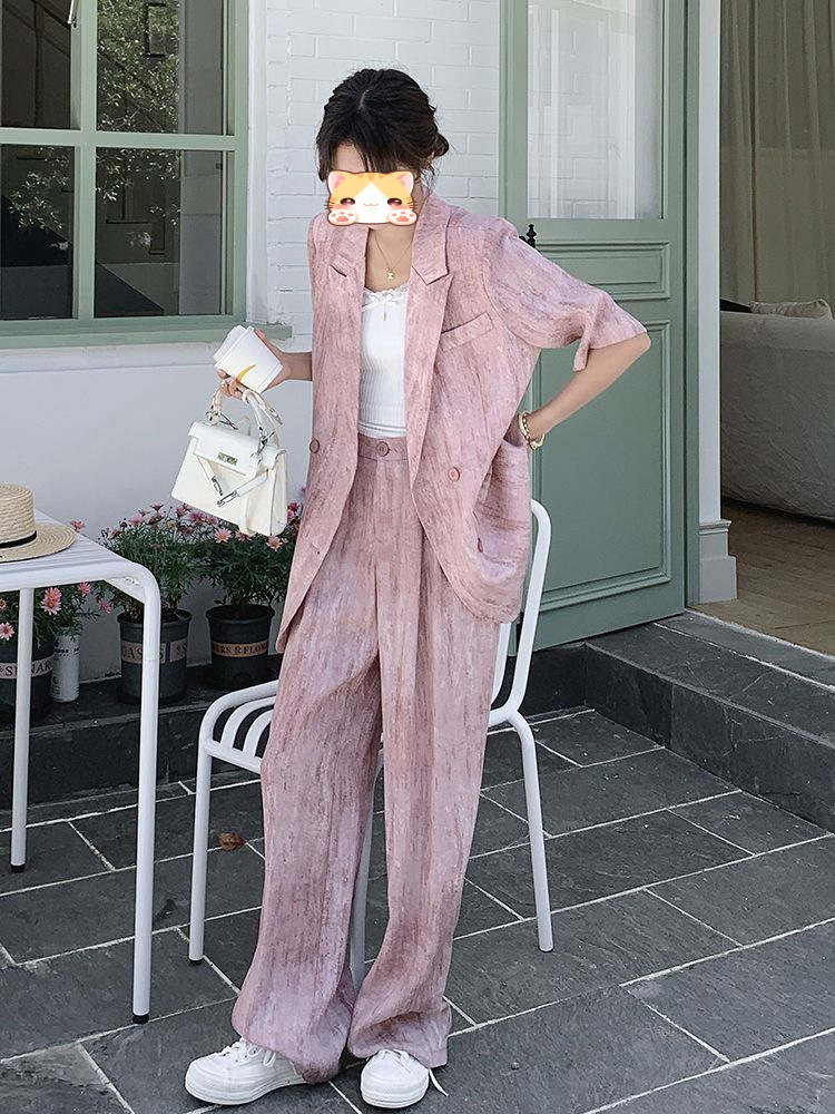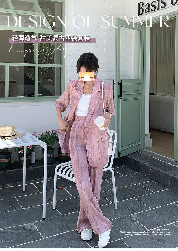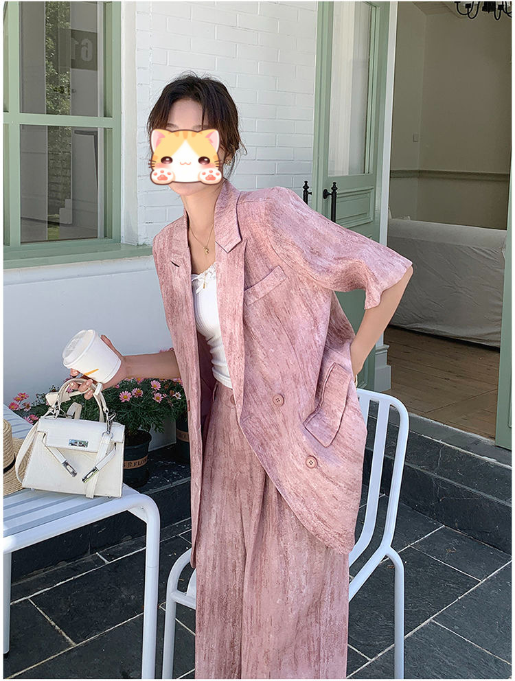 핑크 빈티지 얇은 세트 세트 여자 2025 년 여름 새로운 반팔 세트 높은 허리 와이드 레그 바지 투피스 세트