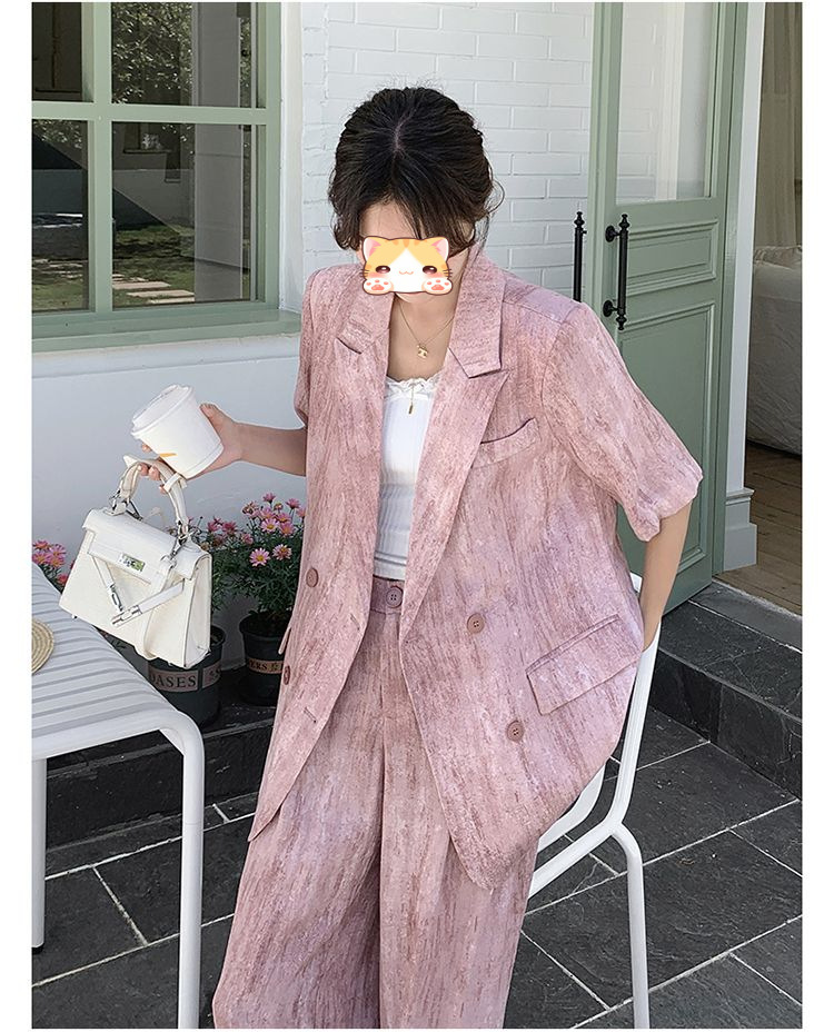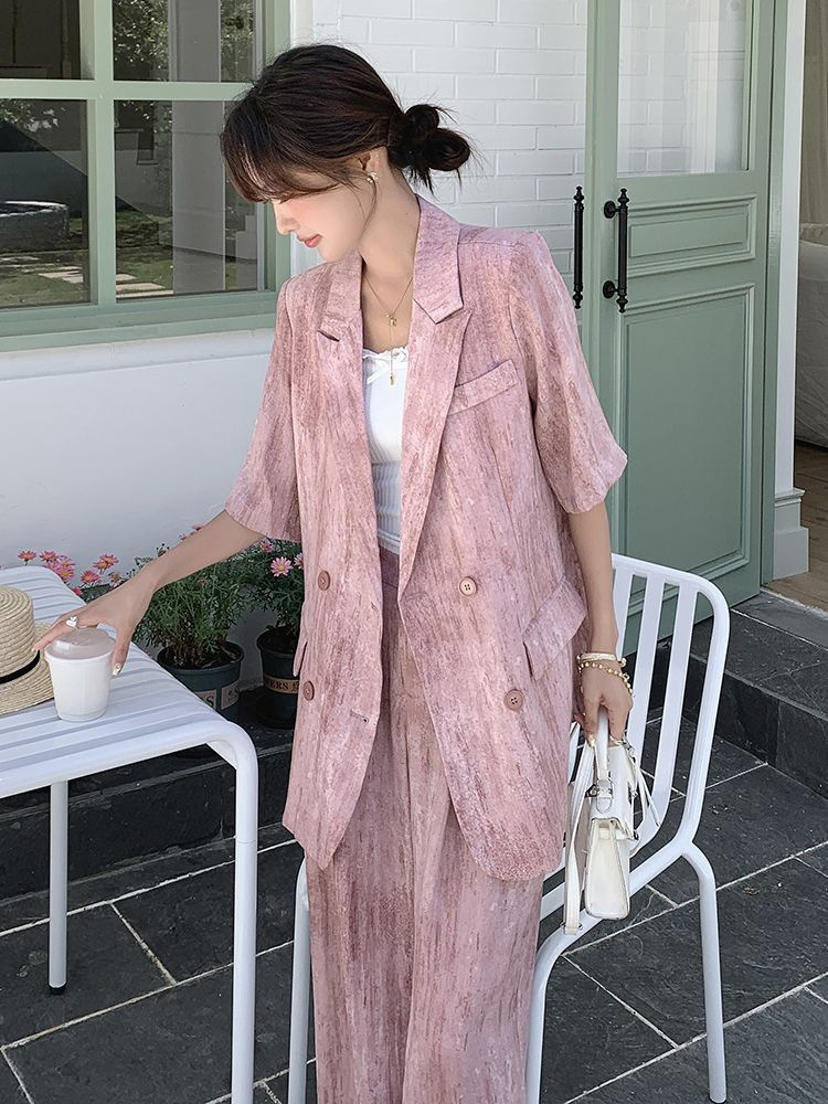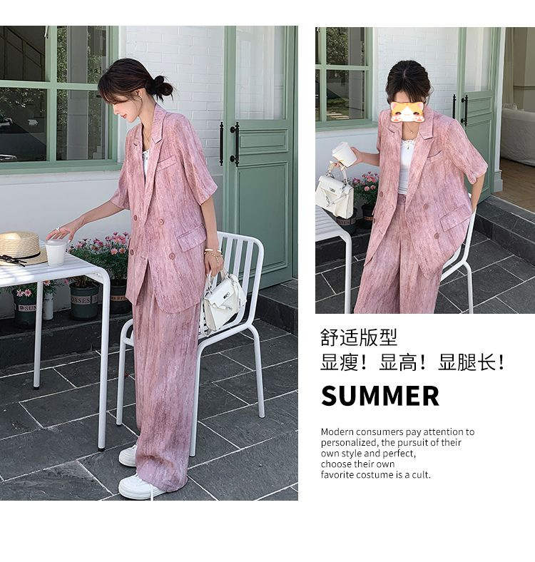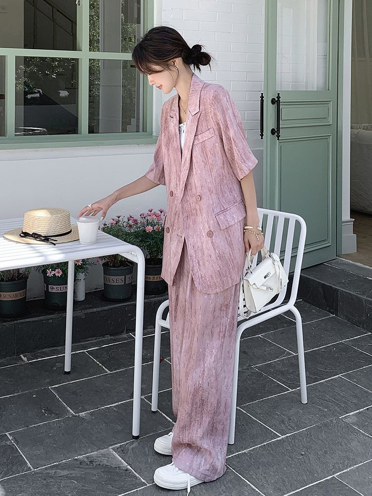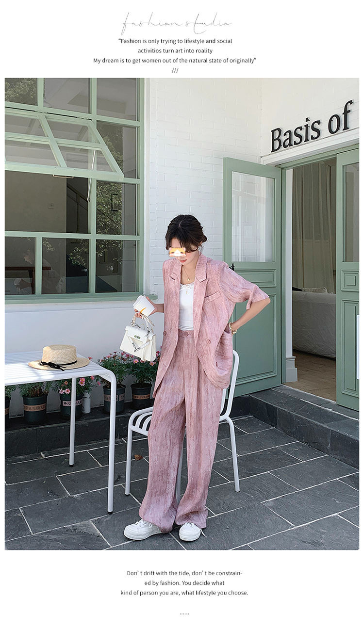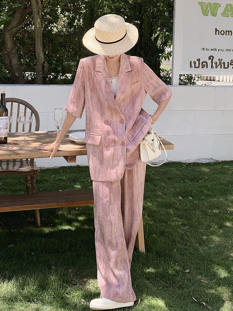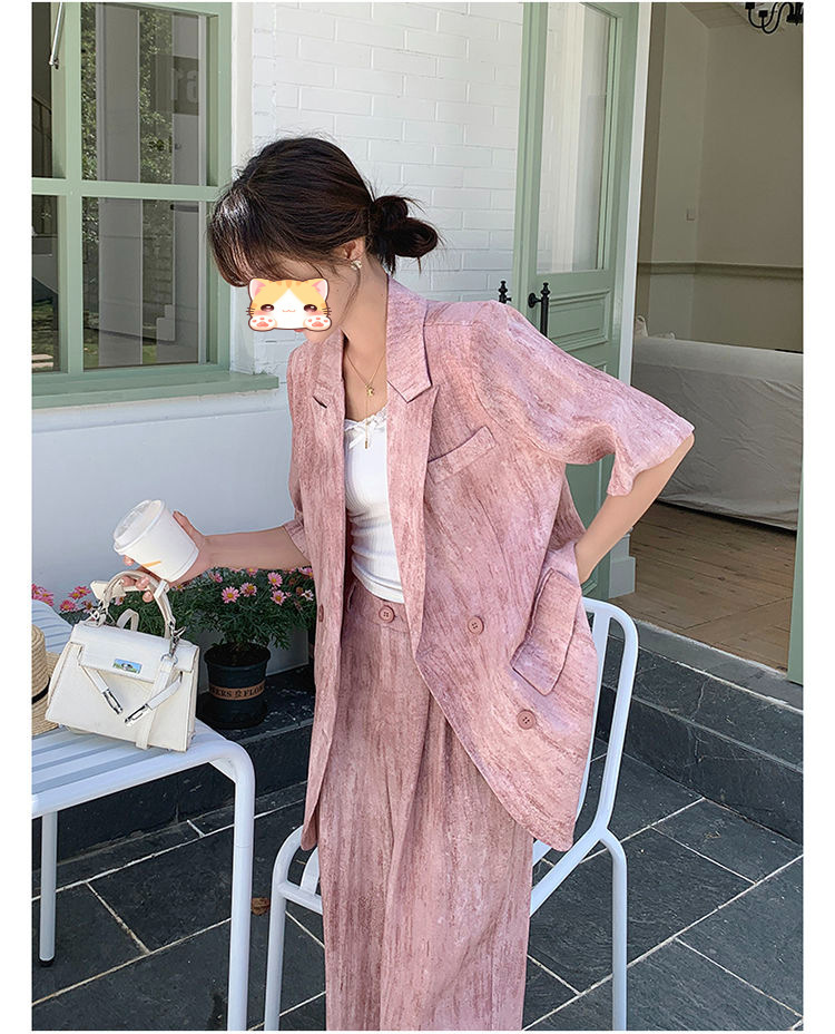 핑크 빈티지 얇은 세트 세트 여자 2025 년 여름 새로운 반팔 세트 높은 허리 와이드 레그 바지 투피스 세트