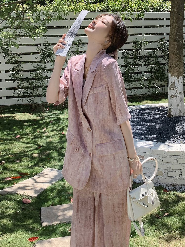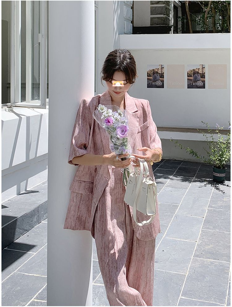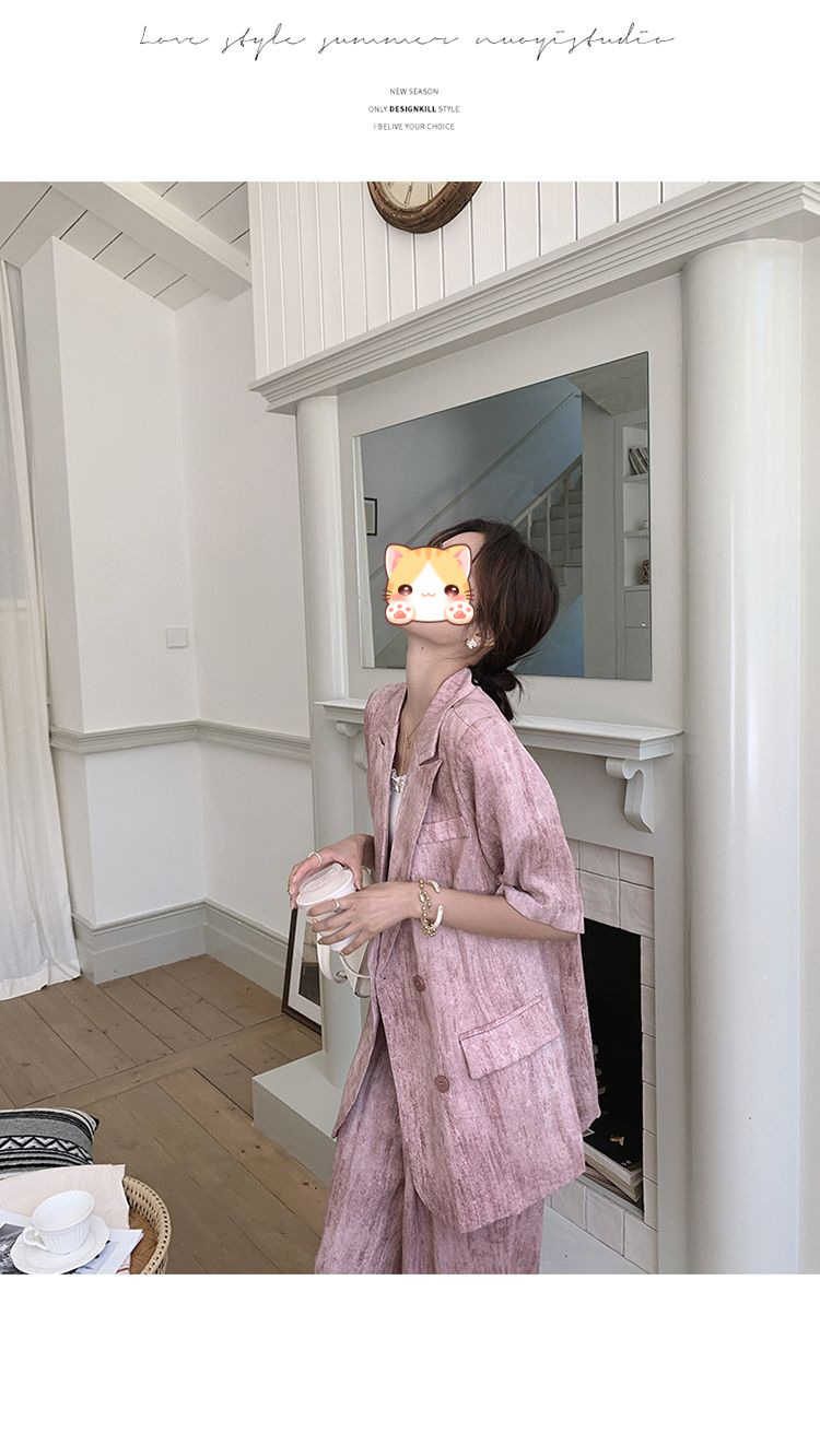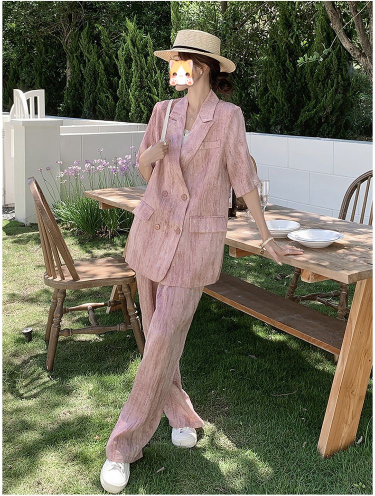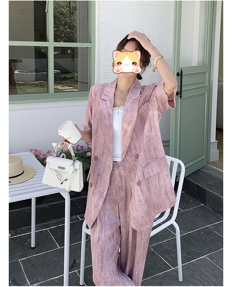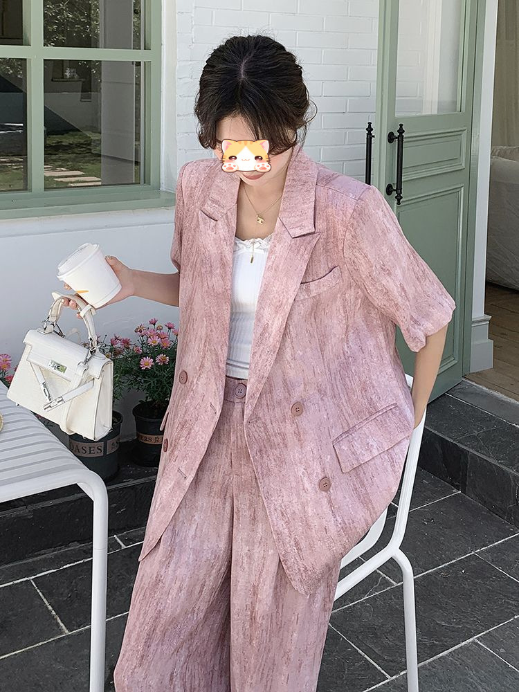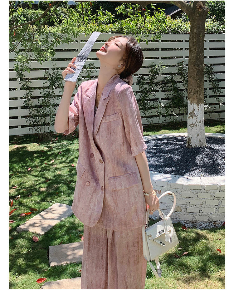 핑크 빈티지 얇은 세트 세트 여자 2025 년 여름 새로운 반팔 세트 높은 허리 와이드 레그 바지 투피스 세트