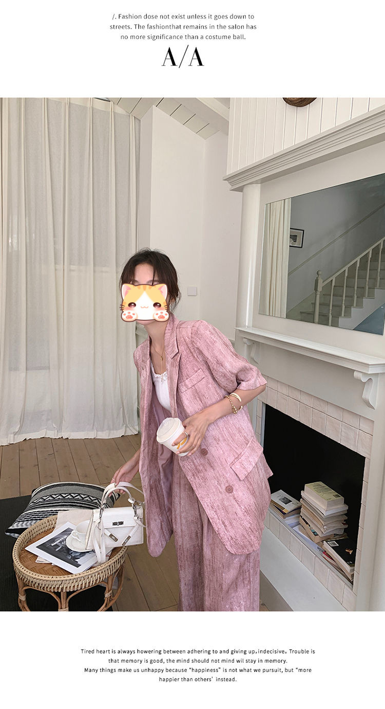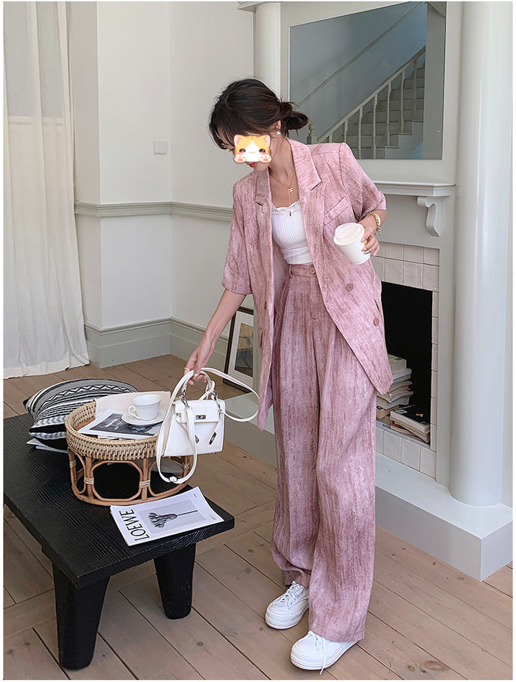 핑크 빈티지 얇은 세트 세트 여자 2025 년 여름 새로운 반팔 세트 높은 허리 와이드 레그 바지 투피스 세트스토어 가기