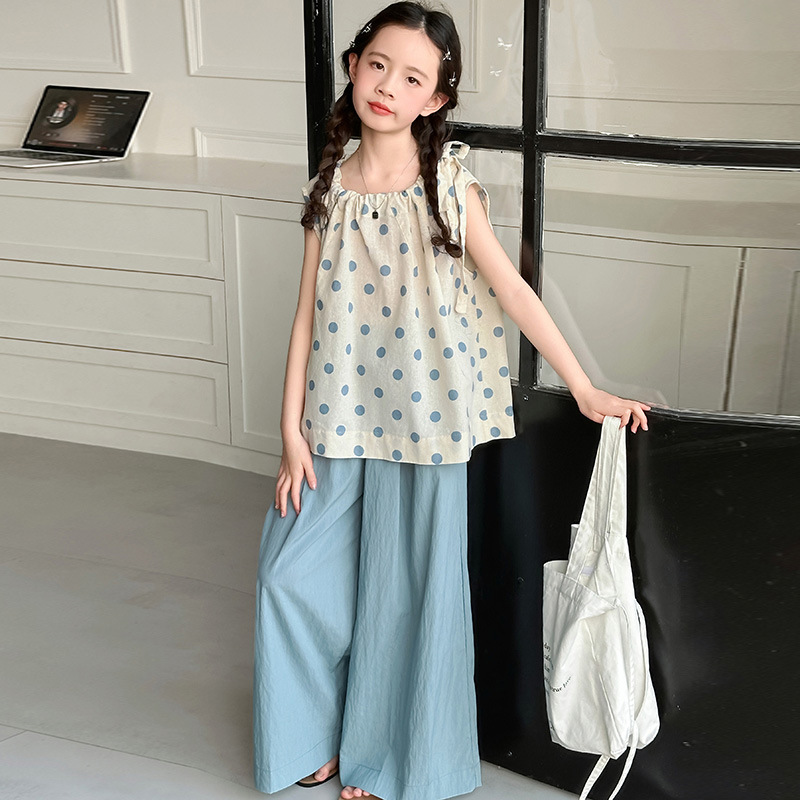 소녀 폴로 도트 탑 세트 2025 년 여름 새로운 어린이 서양 스타일 유행 달콤한 아름다움 큰 어린이 넓은 다리 바지 여름 원피스