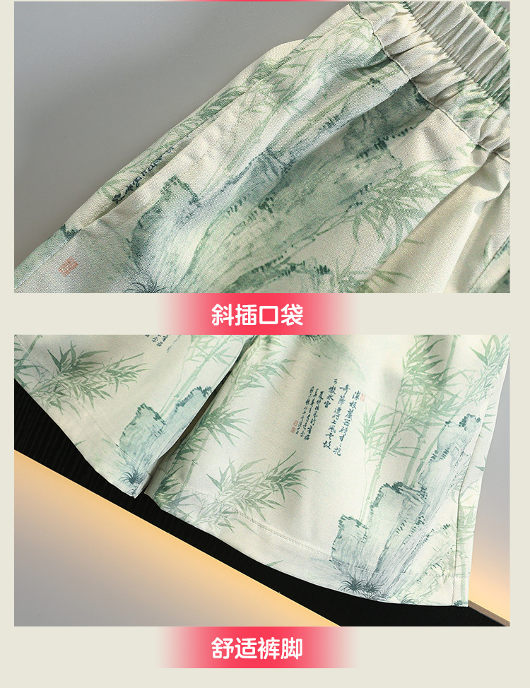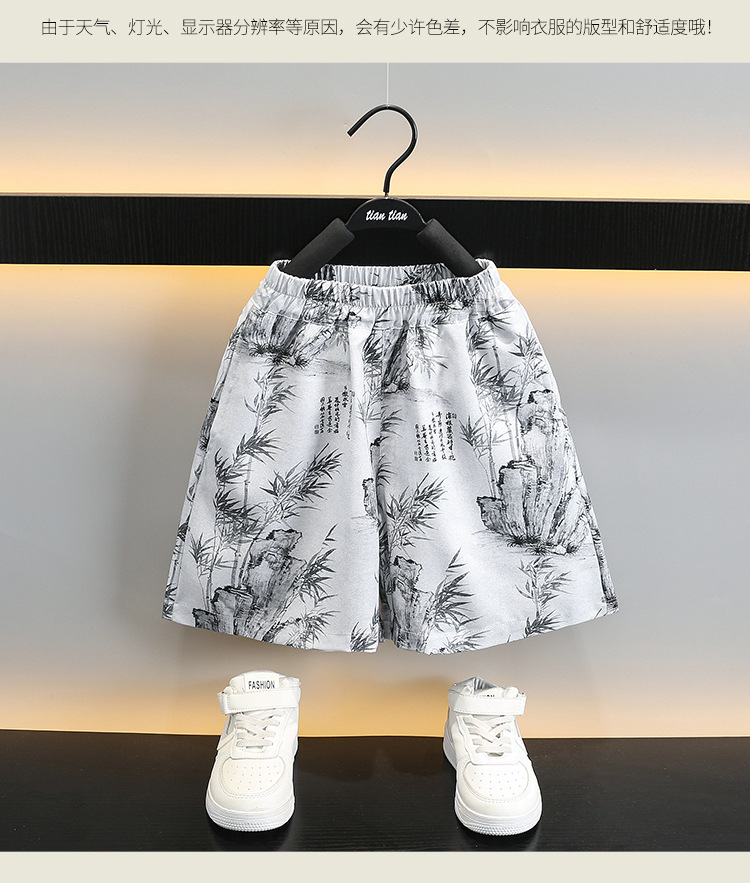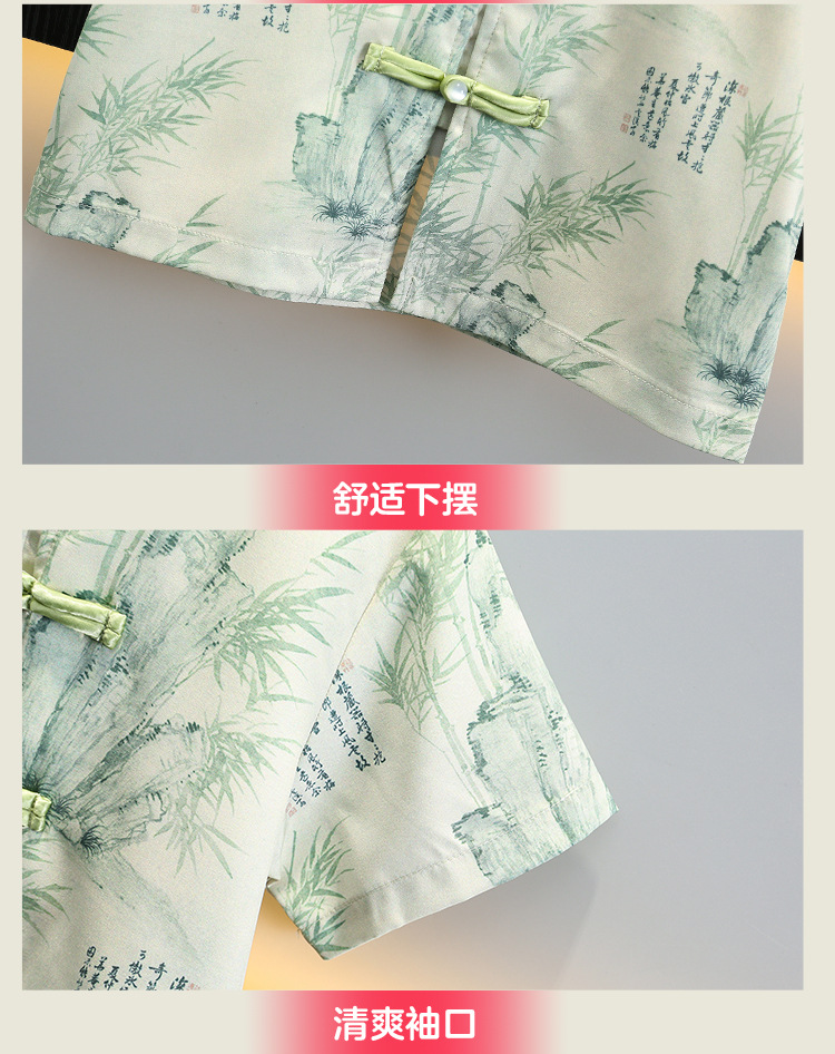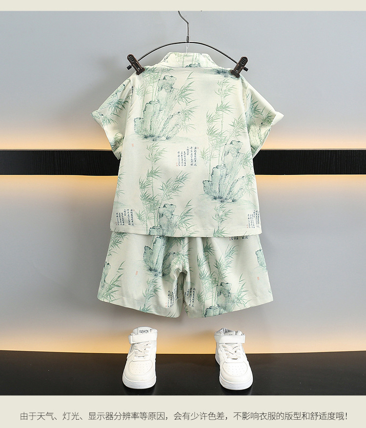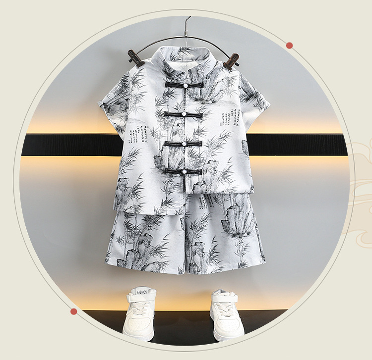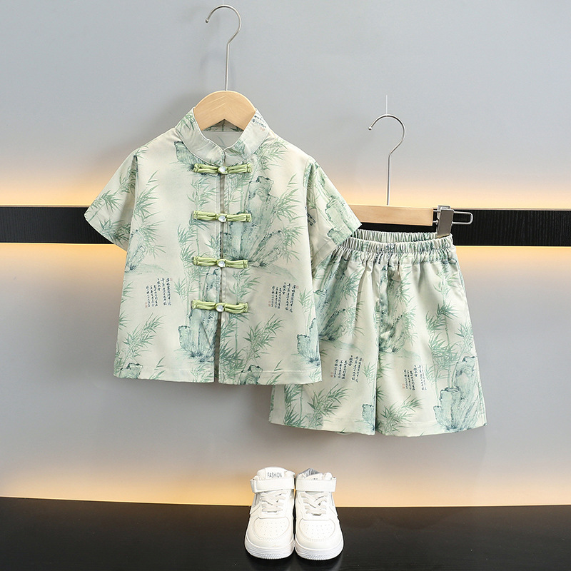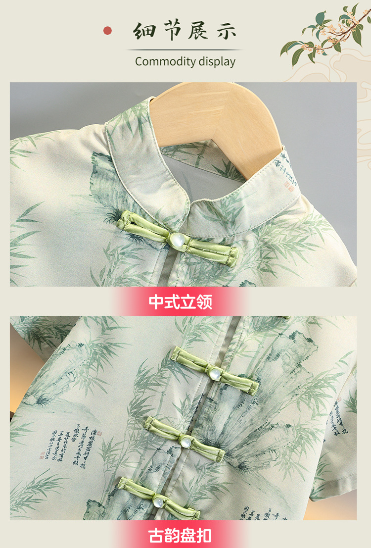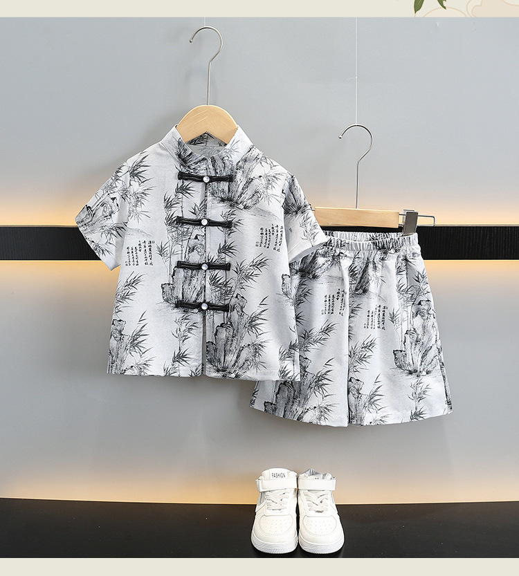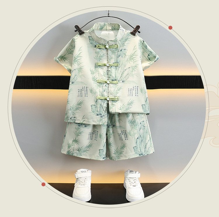 소년 여름 국가 스타일 반팔 세트 패션 2025 새로운 어린이 새로운 중국식 버클 탕 세트 한푸 테이블 공연 옷스토어 가기