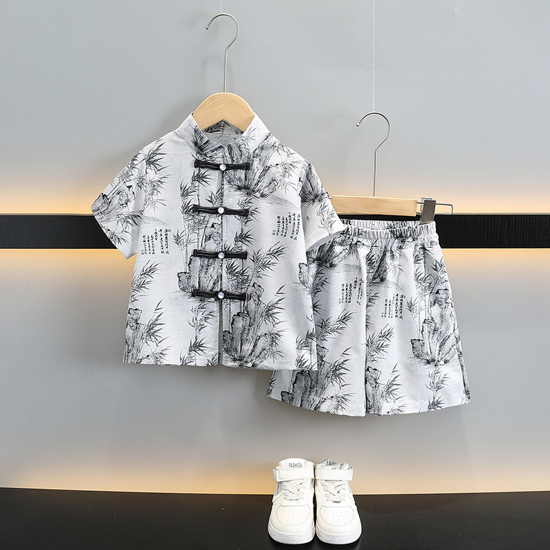 소년 여름 국가 스타일 반팔 세트 패션 2025 새로운 어린이 새로운 중국식 버클 탕 세트 한푸 테이블 공연 옷